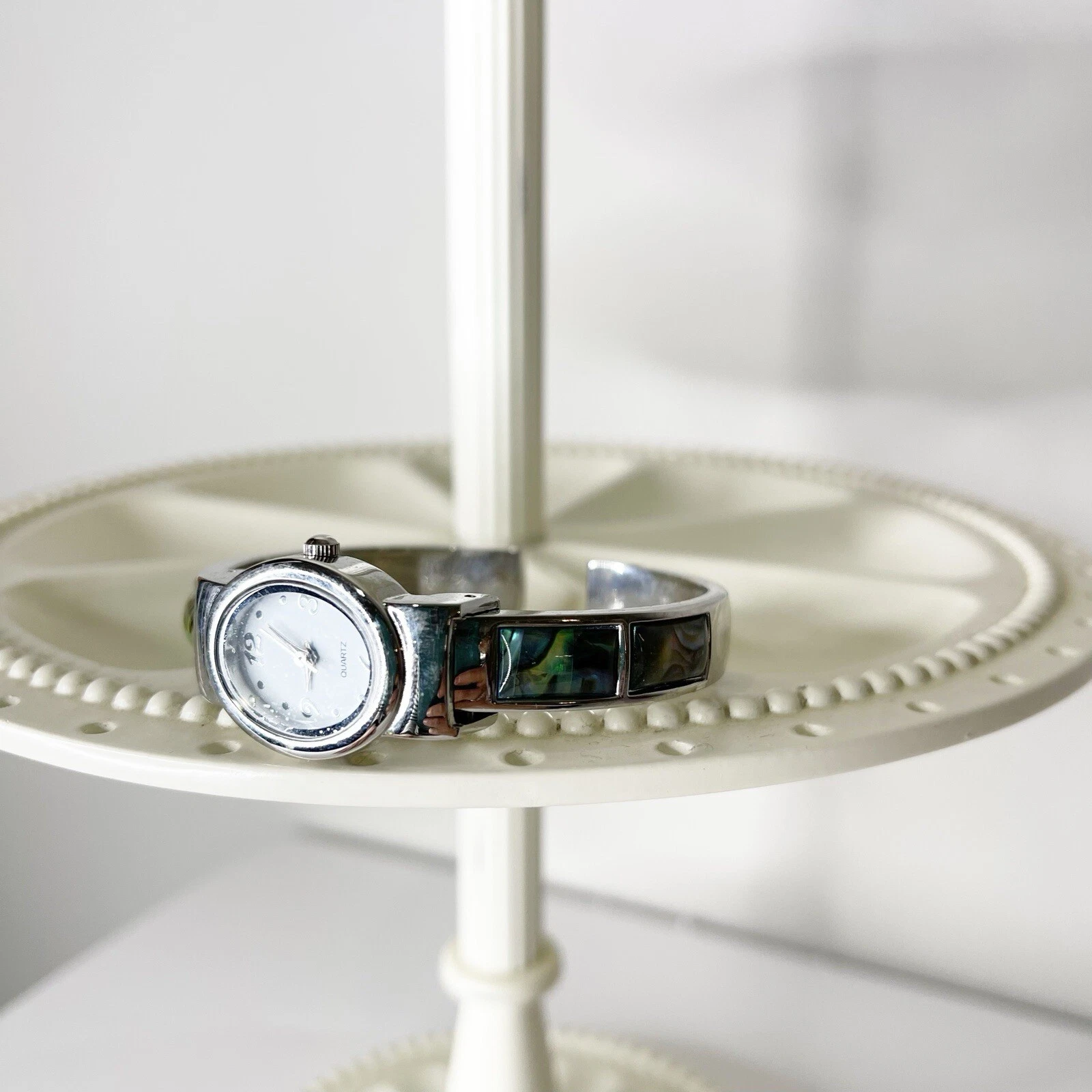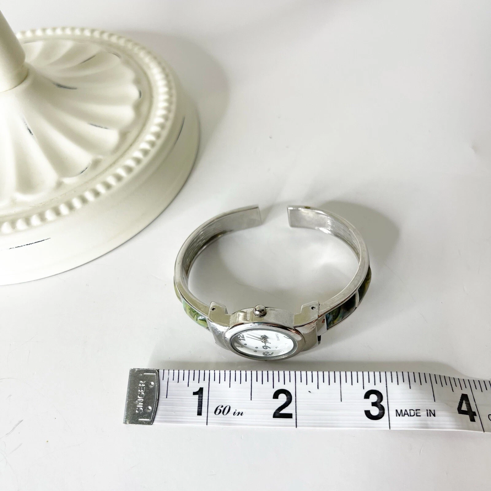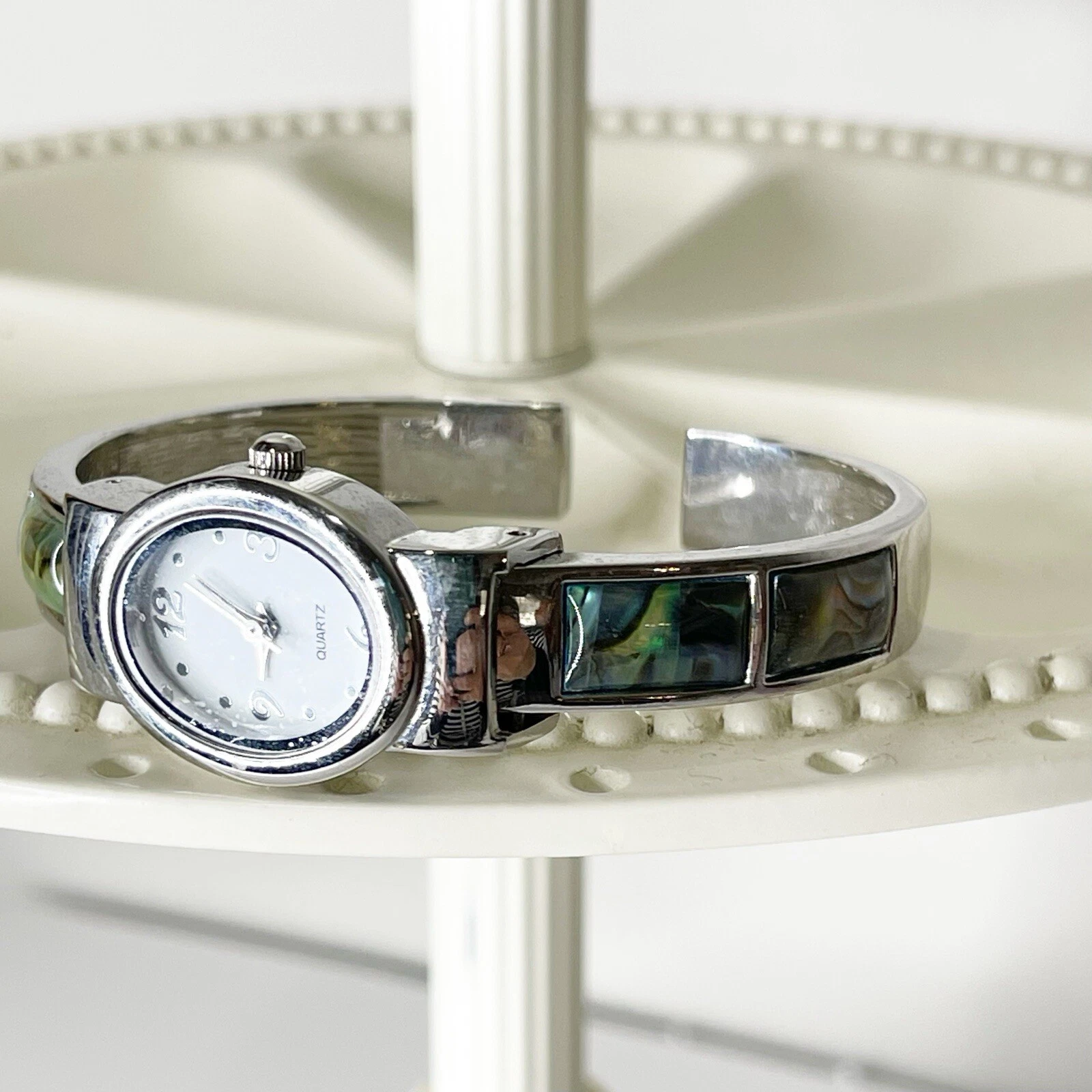 Vintage Avon Abalone Watch Women Cuff Bracelet Silver Tone Japan Movement