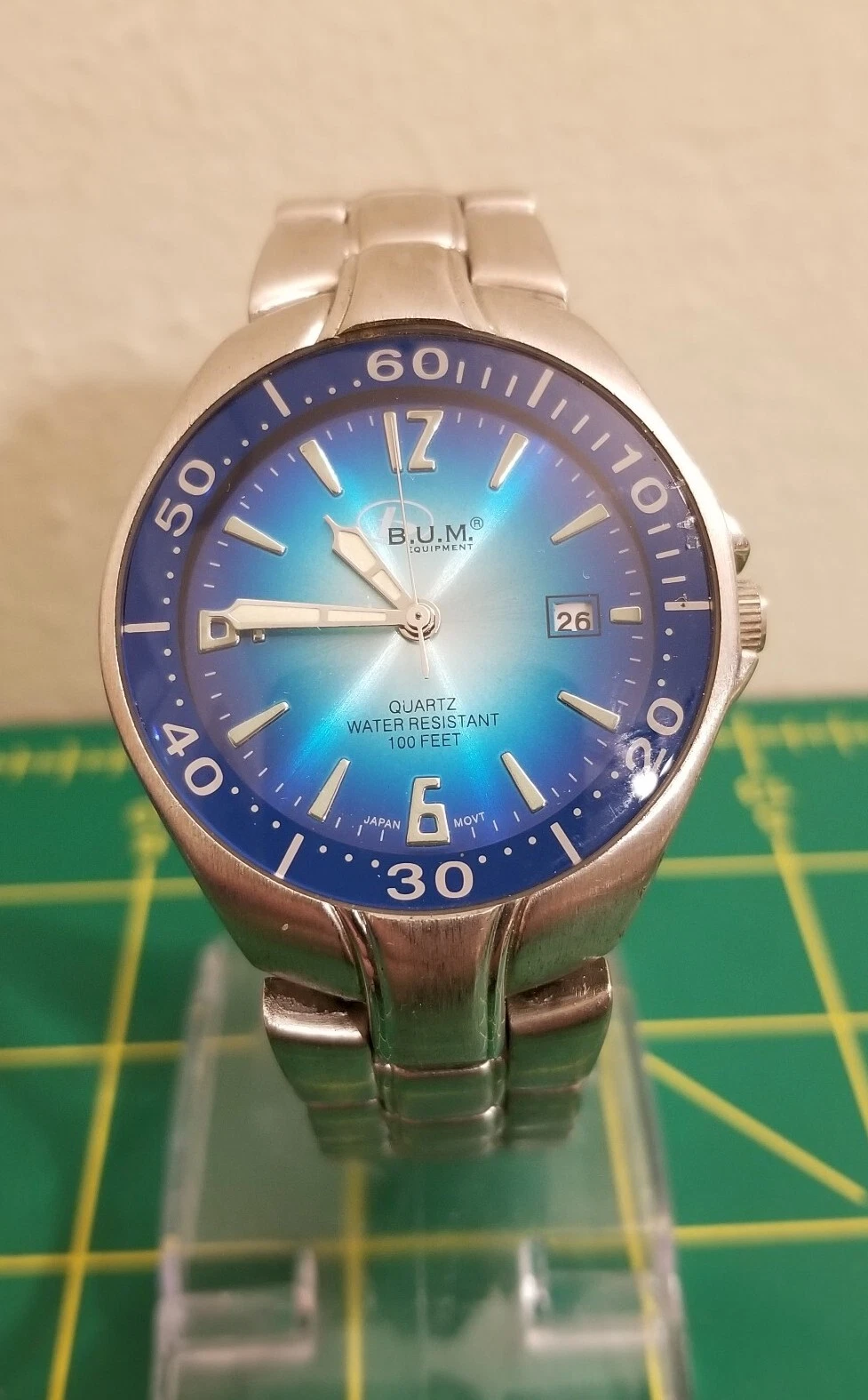 Vintage Bum Equipment Men’s Stainless Watch Blue Dial Date WR New Battery