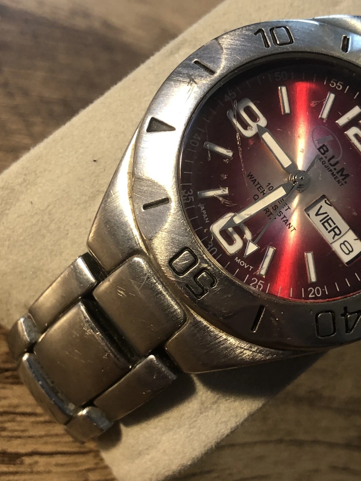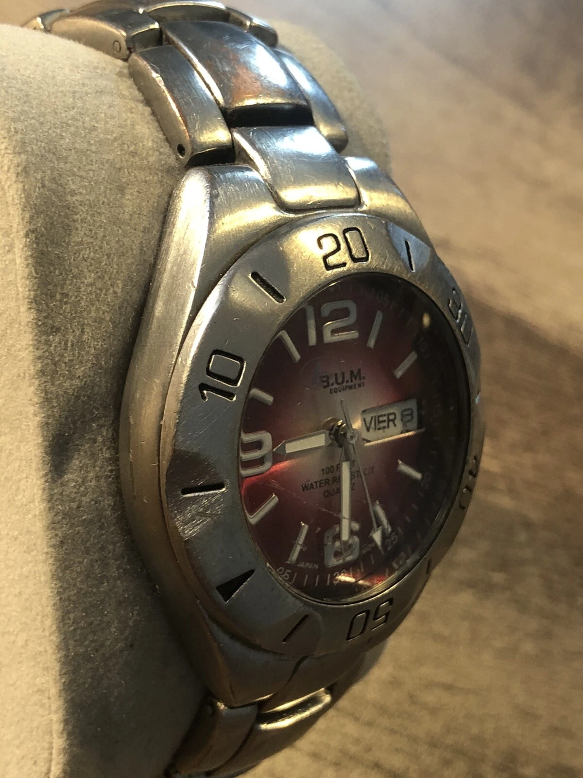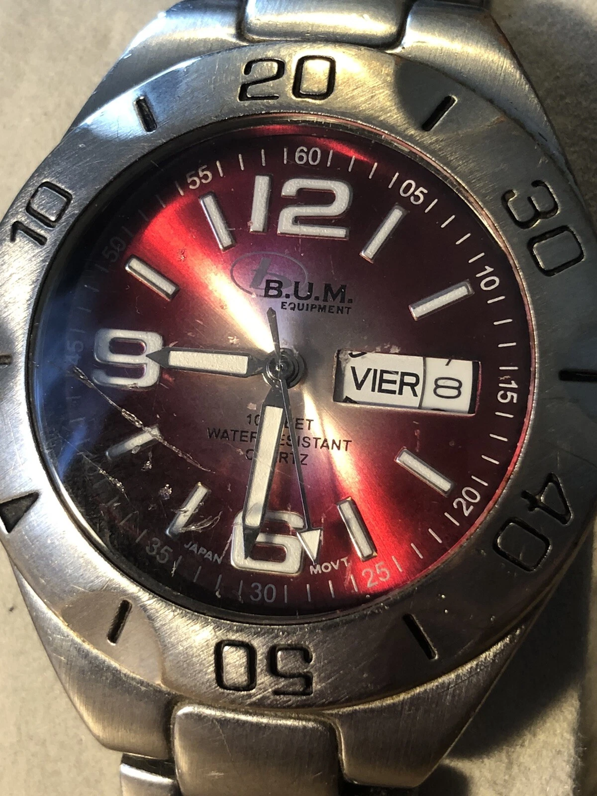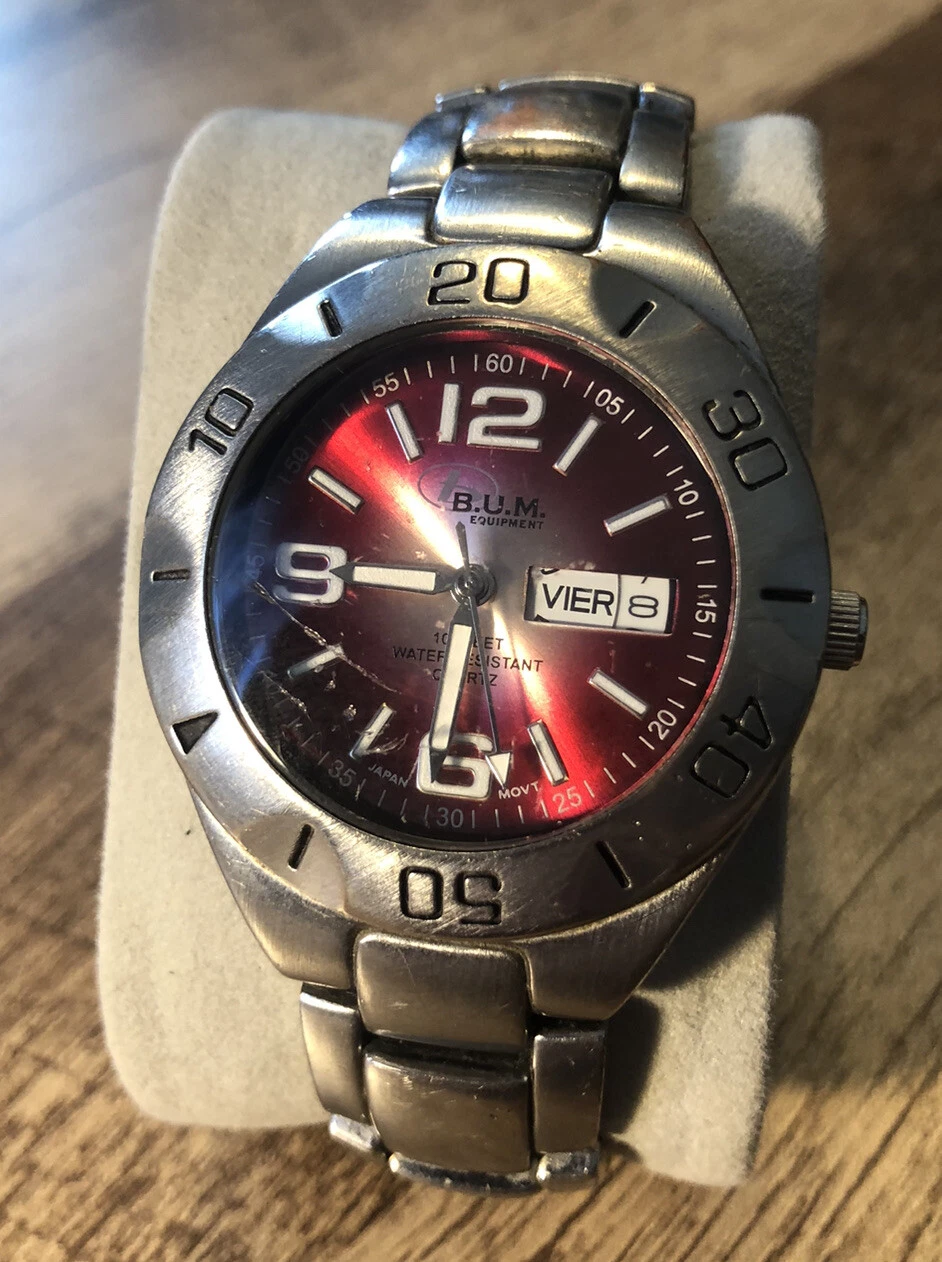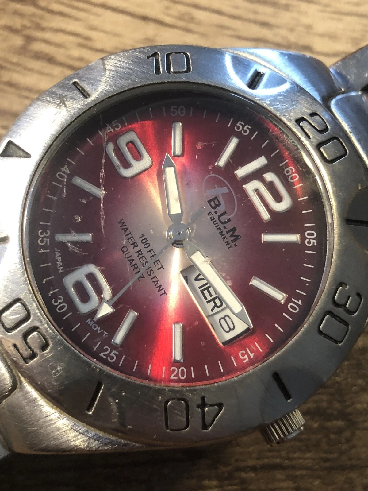 Vintage Bum Equipment men’s watch 100 Feet Water Resistant Red Dial New Battery