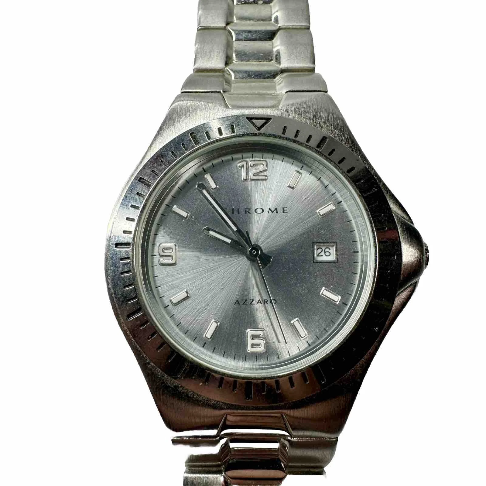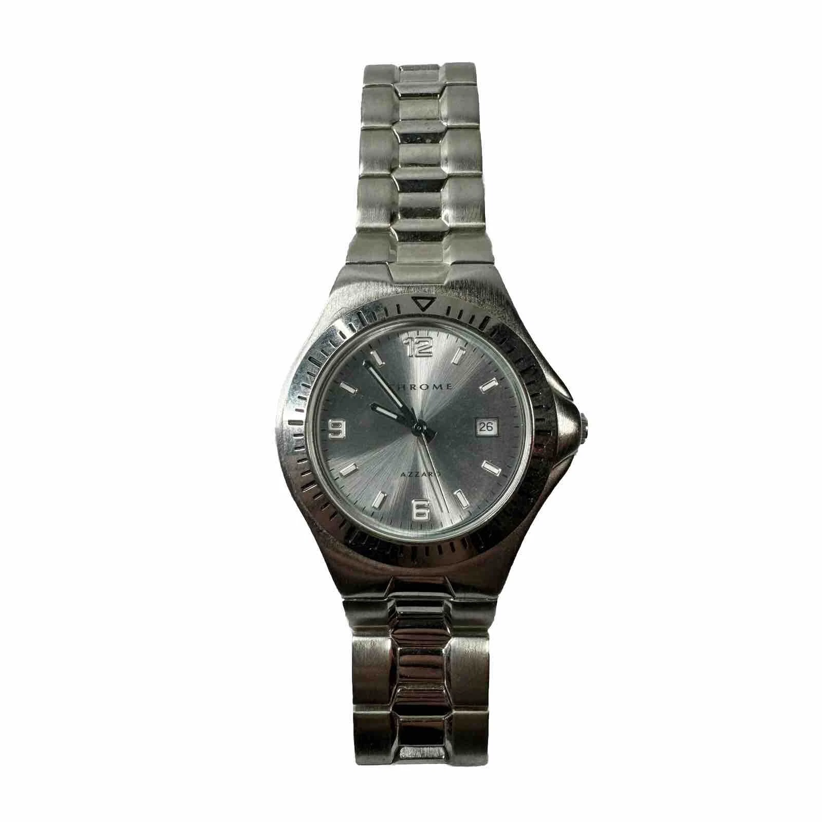 Chrome Azzaro Watch Men Silver Tone Date Window Round Face New Battery 7.25"