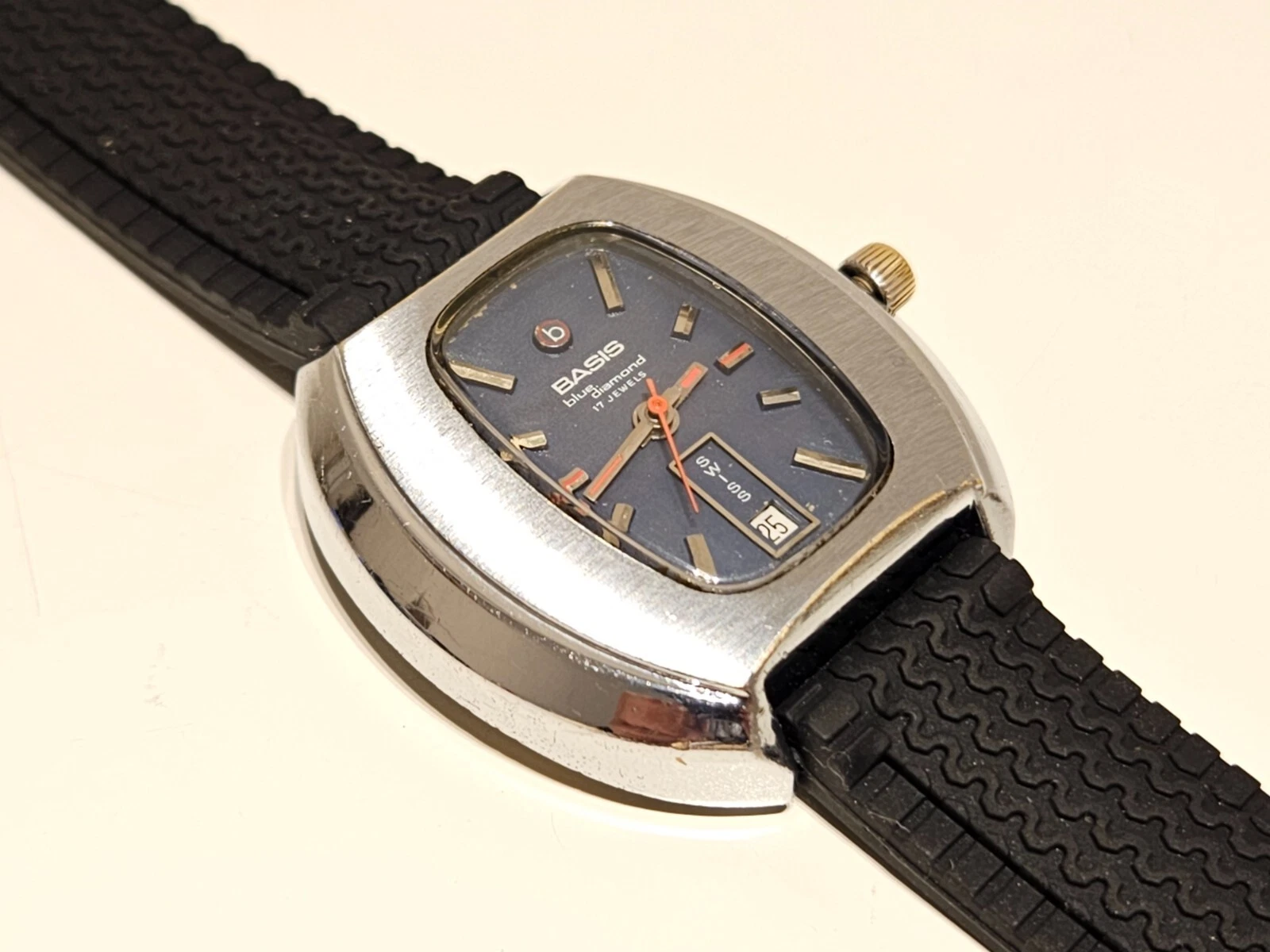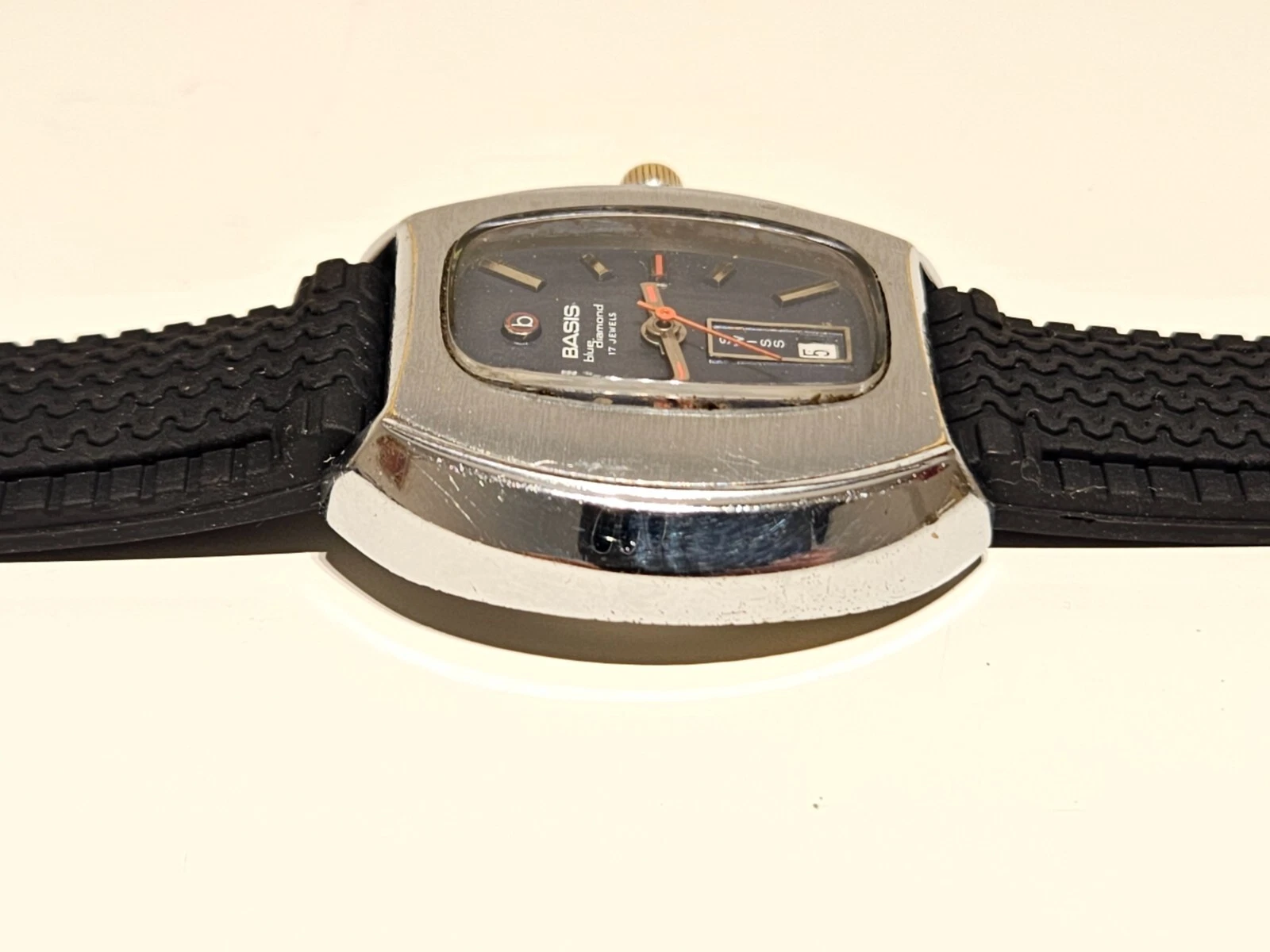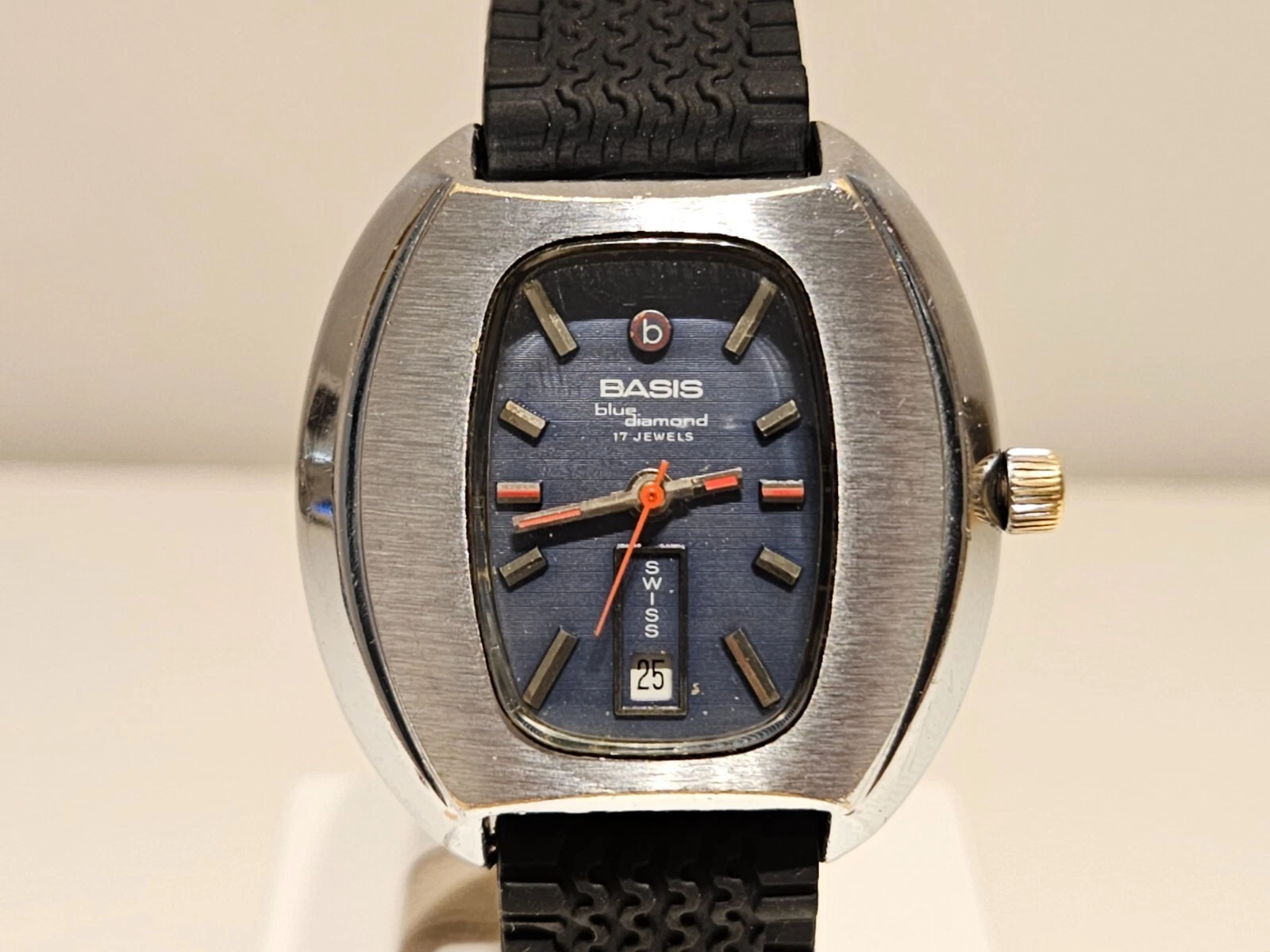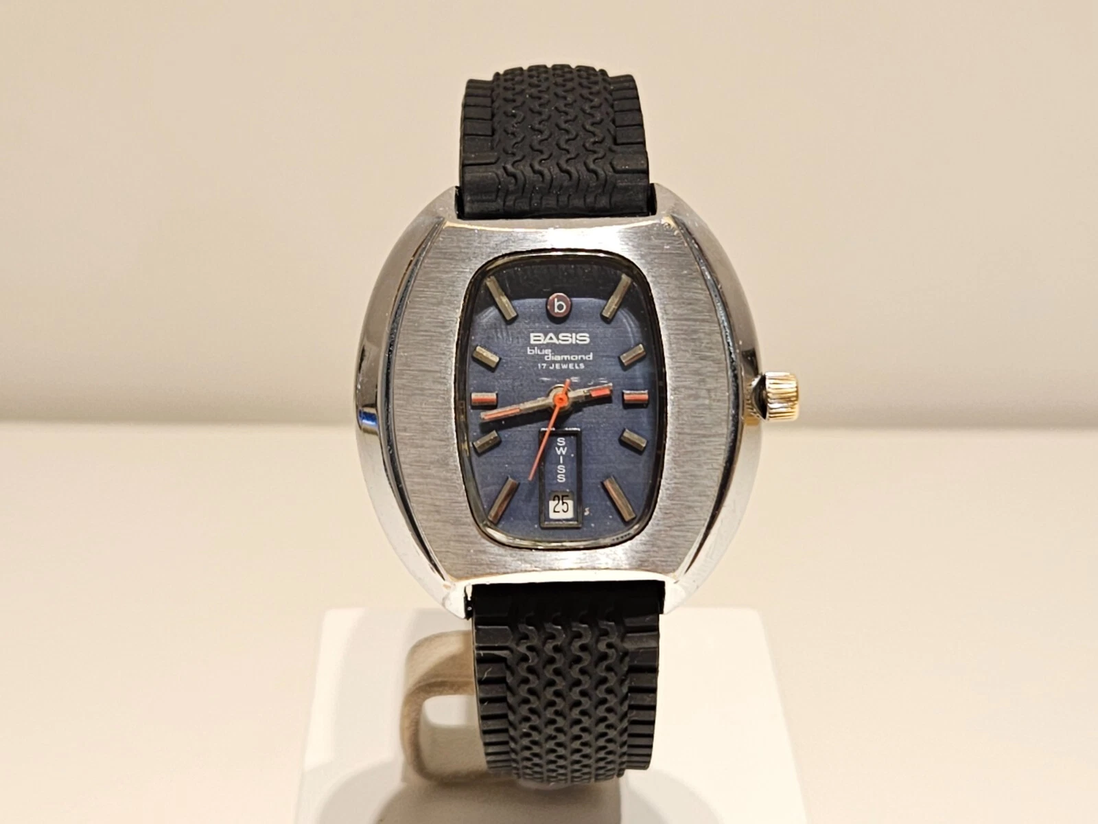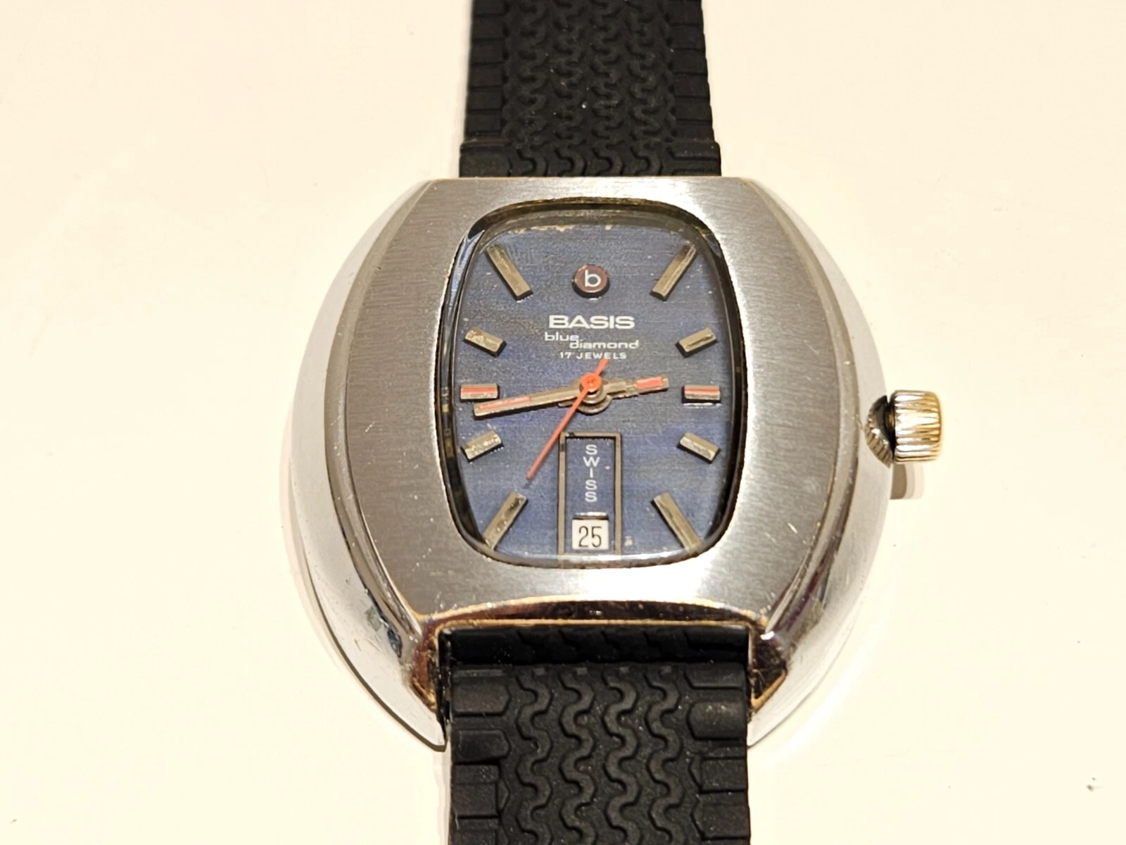 VINTAGE RARE BIG 39mm SWISS MEN'S MECHANICAL CHROME WATCH "BASIS" BLUE DIAMOND