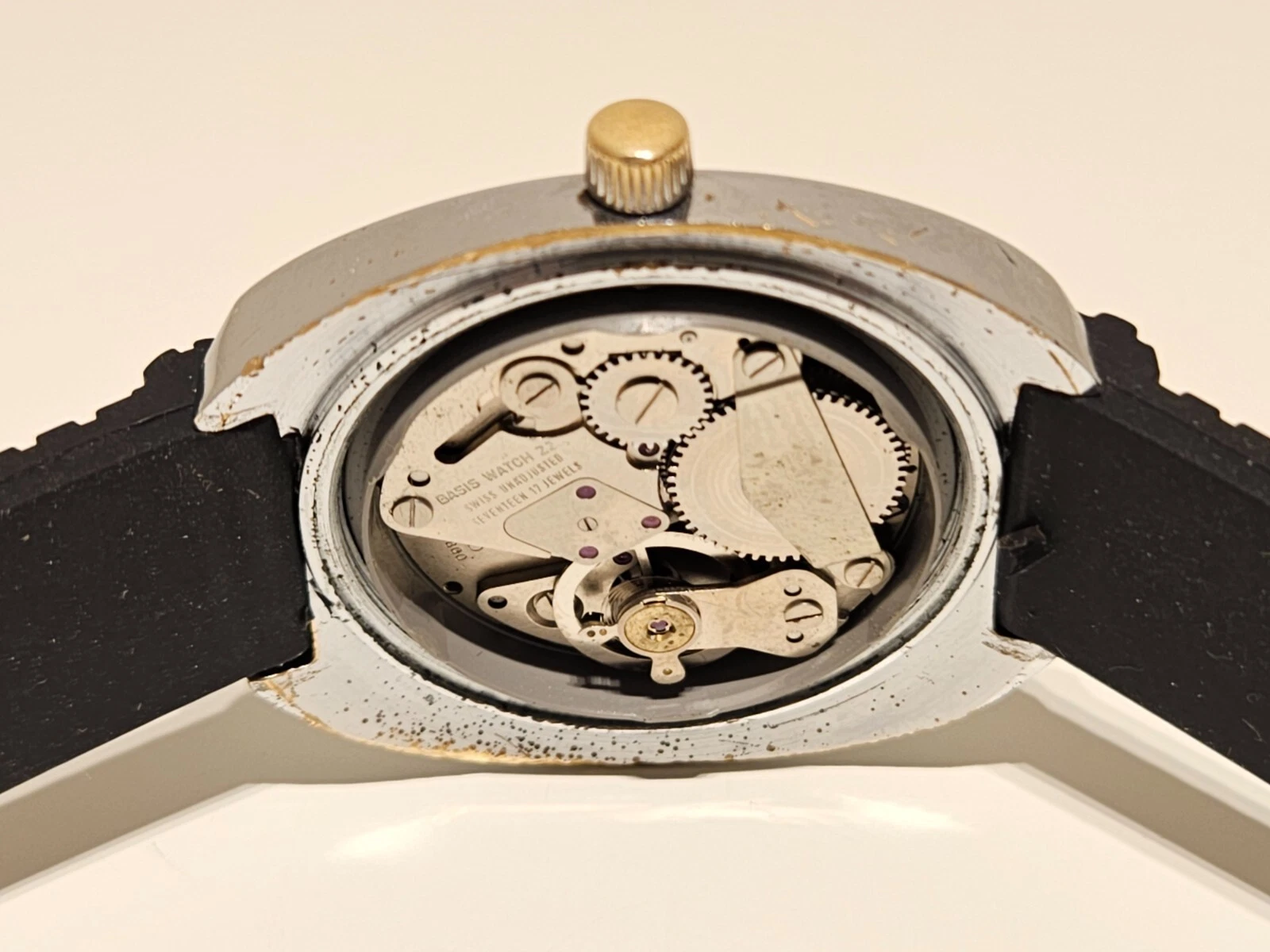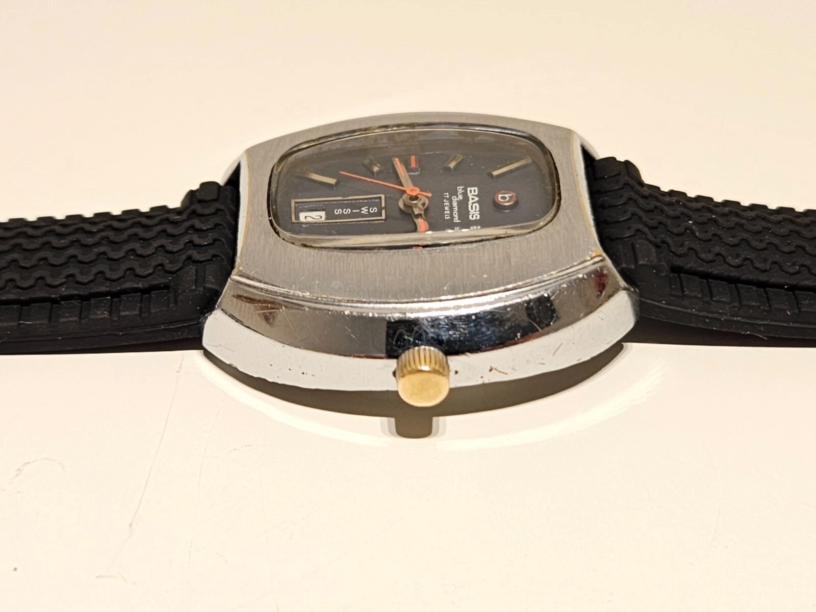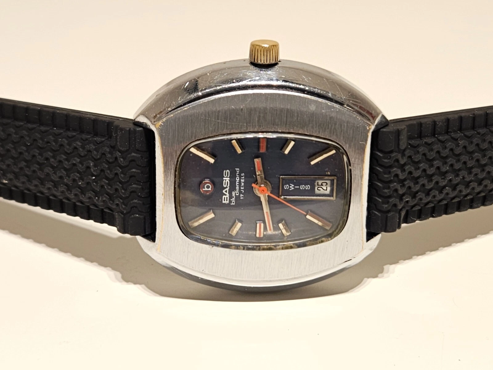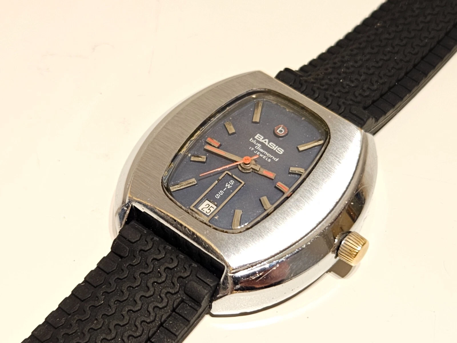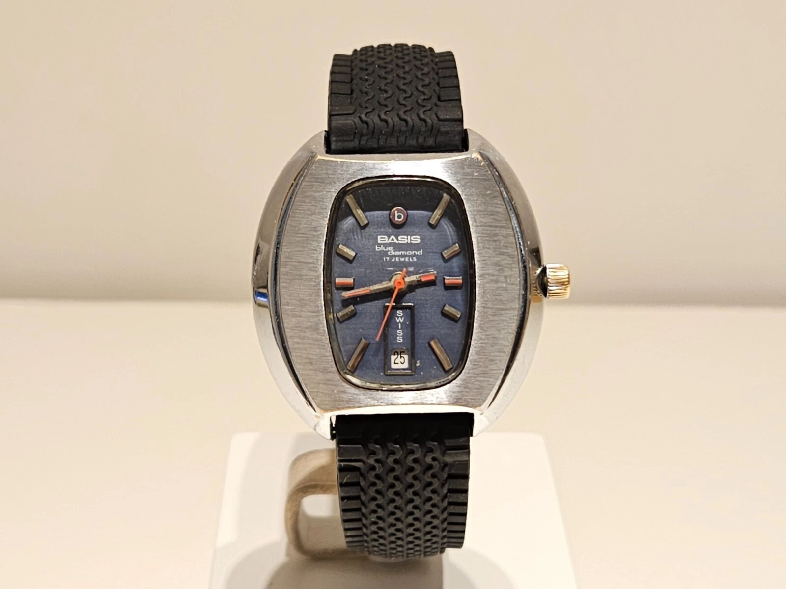 VINTAGE RARE BIG 39mm SWISS MEN'S MECHANICAL CHROME WATCH "BASIS" BLUE DIAMOND