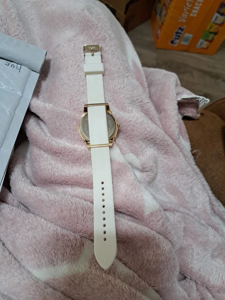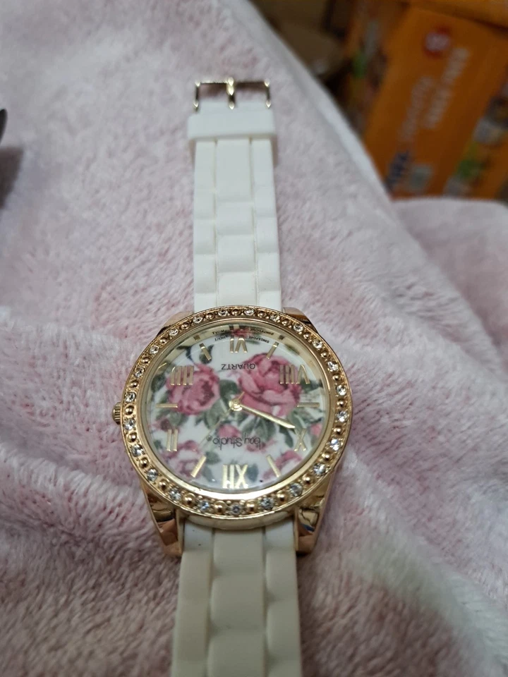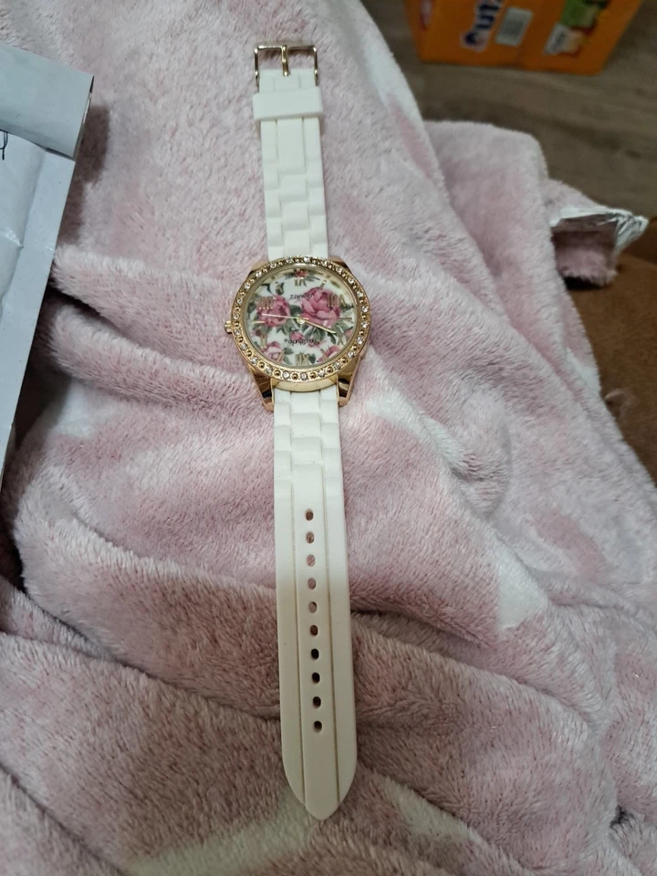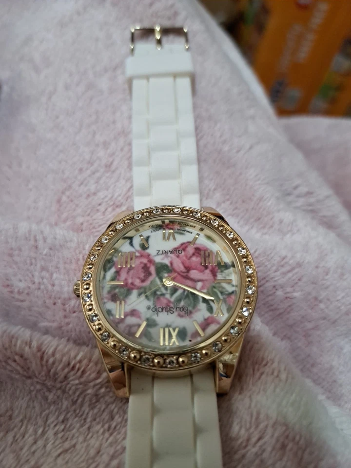 376 New Bay Studio Watch With Roses For A Face & Rhinestones With  8" White Band