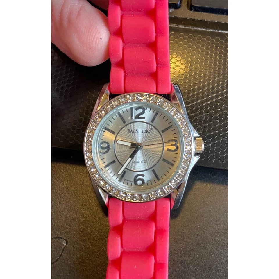 Women's Bay Studio Watch, Silver Tone with Rhinestone Bezel, Pink Poly Band