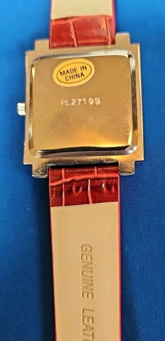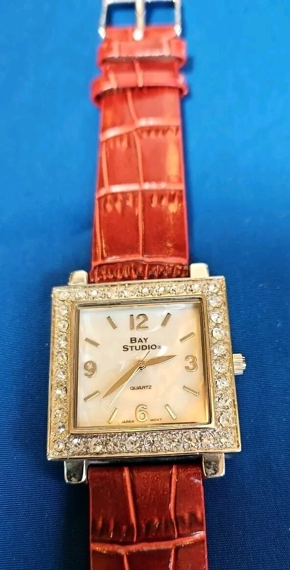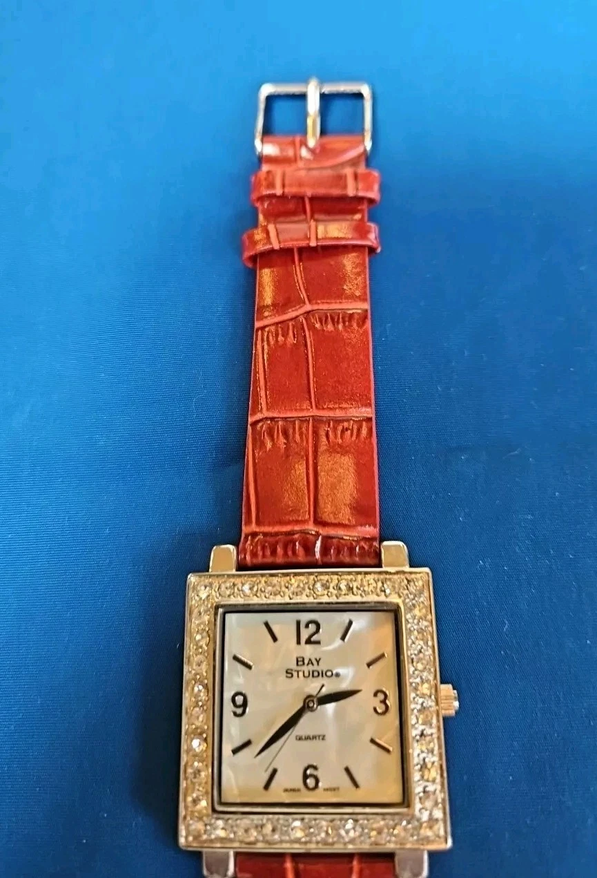 Bay Studio Women Watch Oyster Tone Face w/Rhinestones Red Leather Band