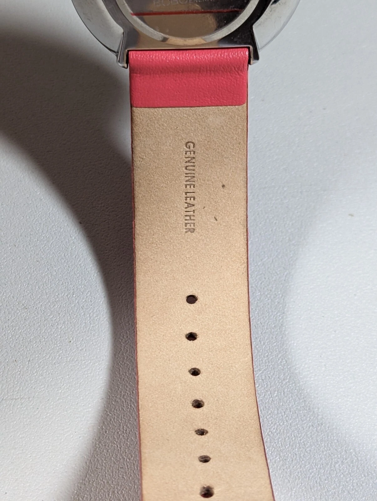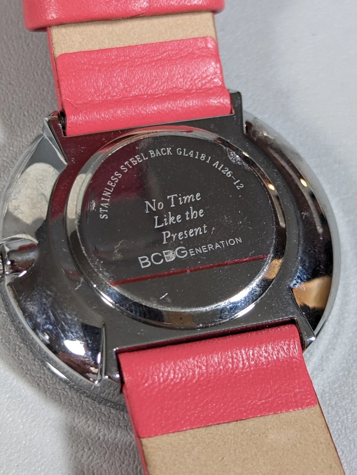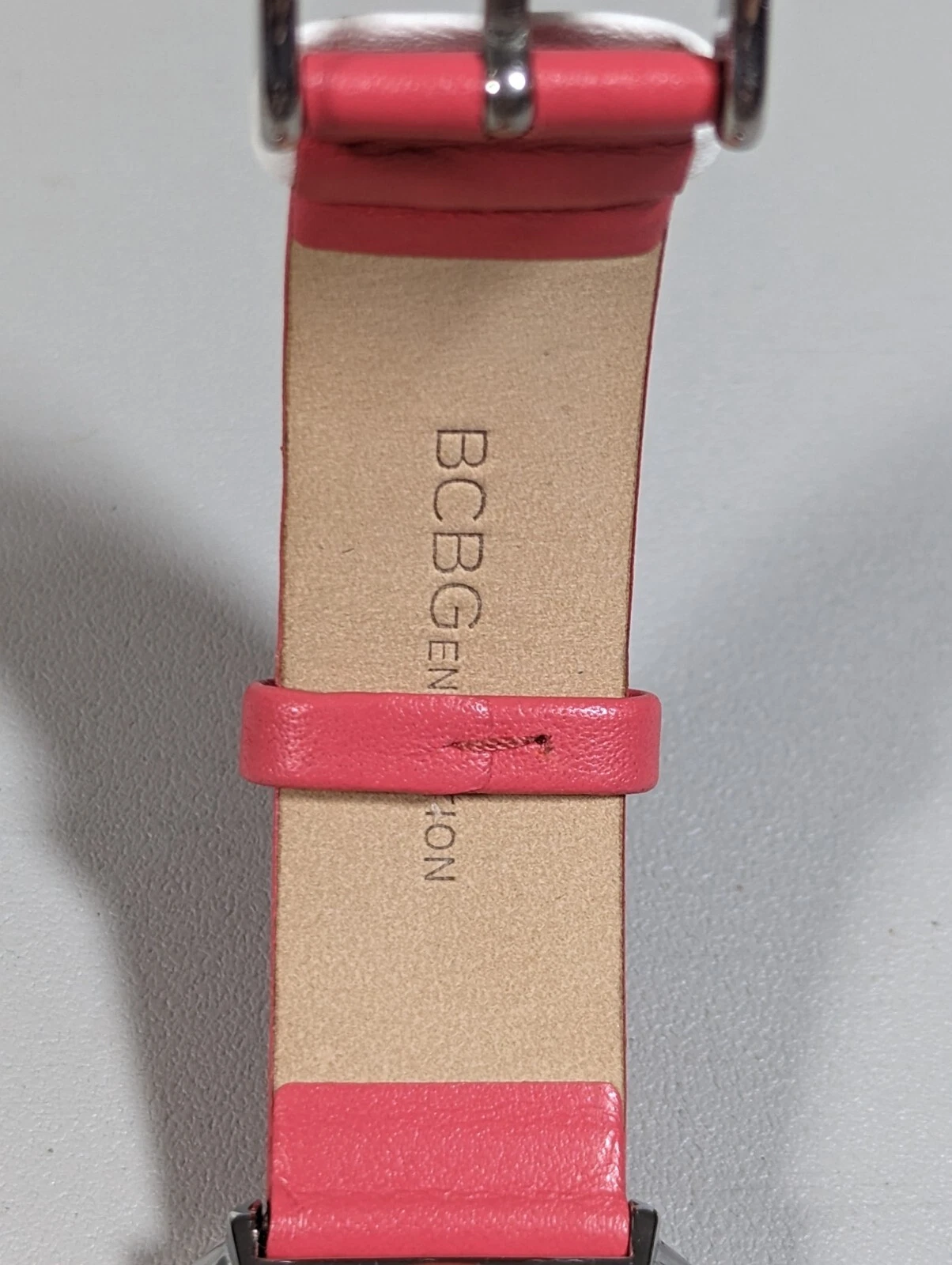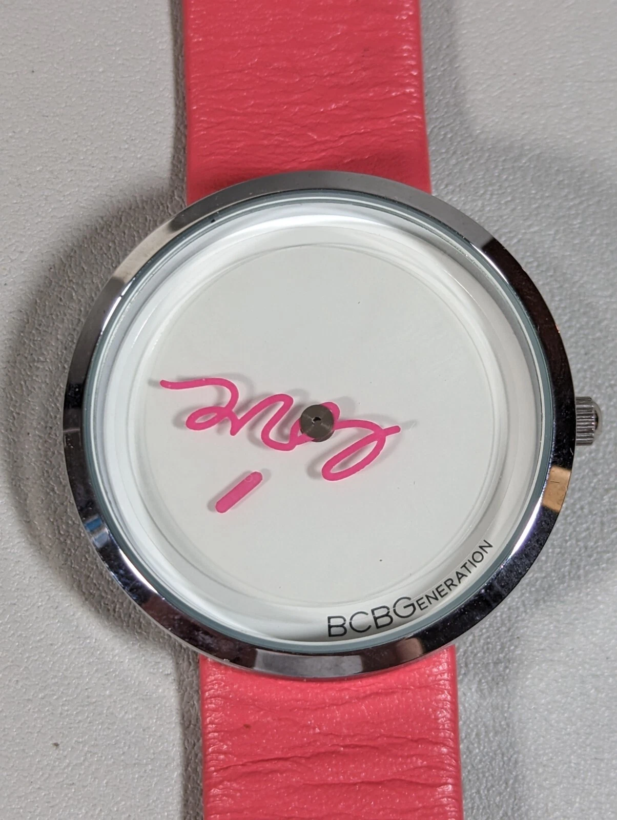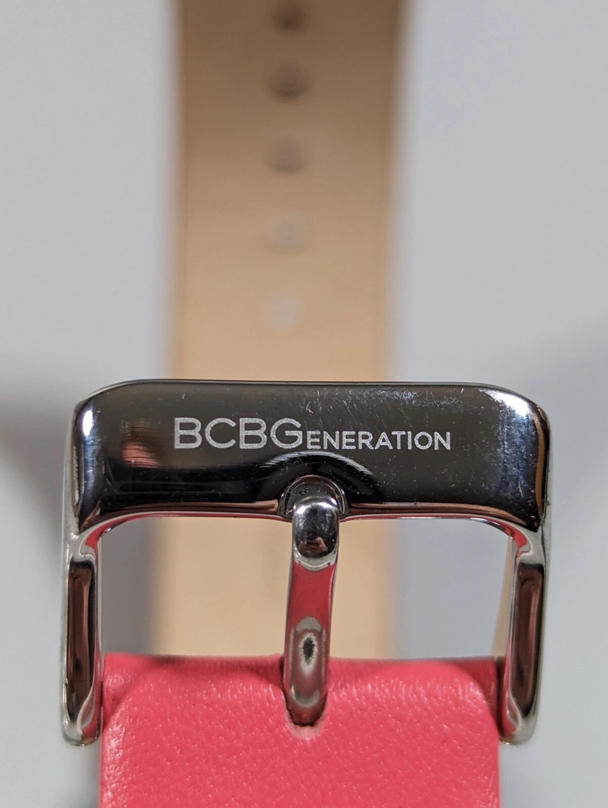 BCBGeneration Love White Dial Round Silver Tone Case Pink Leather Band Watch