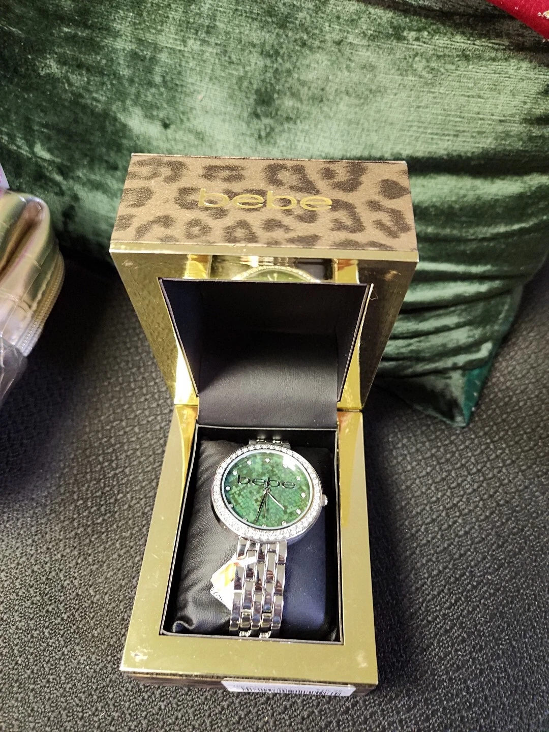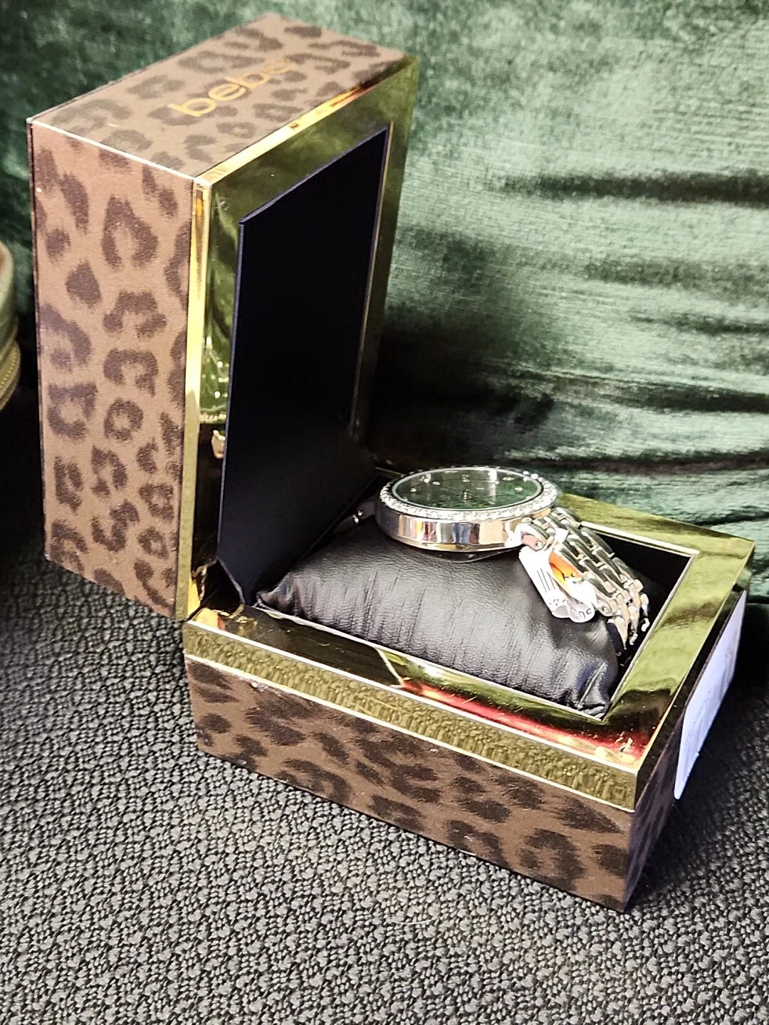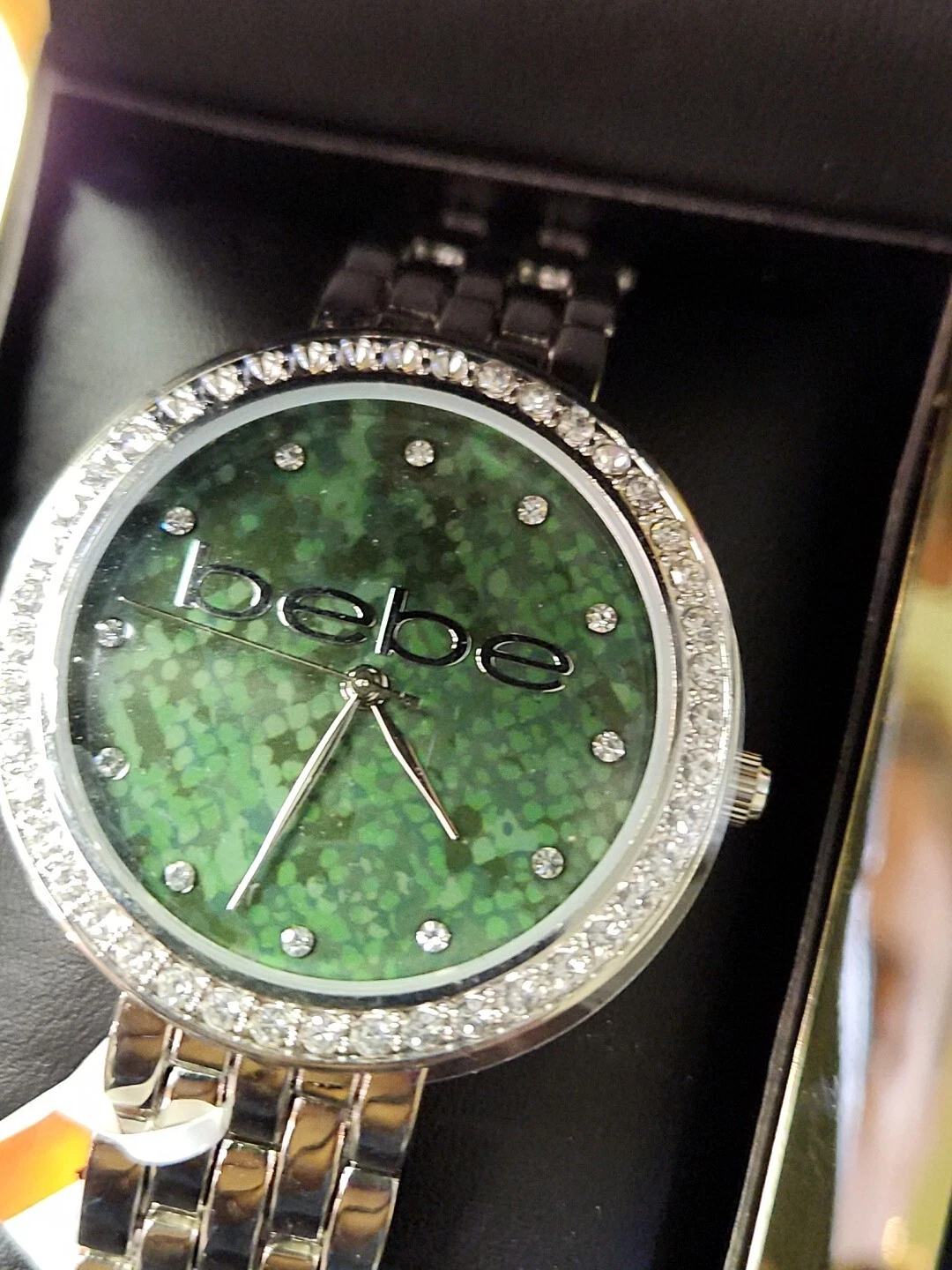 BEBE NWT Silver Stainless Steel Green/ Stone Women Watch With Gift Box