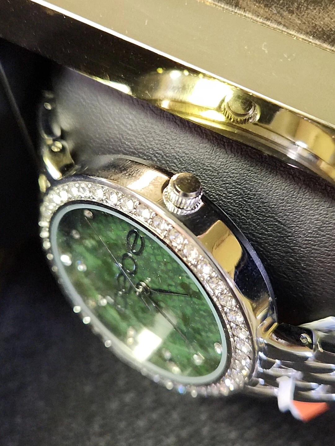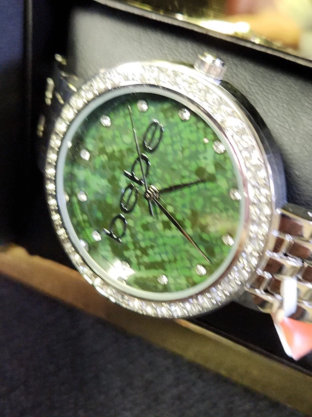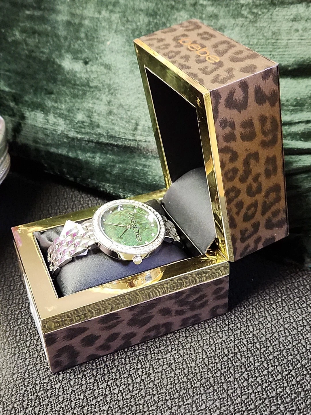 BEBE NWT Silver Stainless Steel Green/ Stone Women Watch With Gift Box