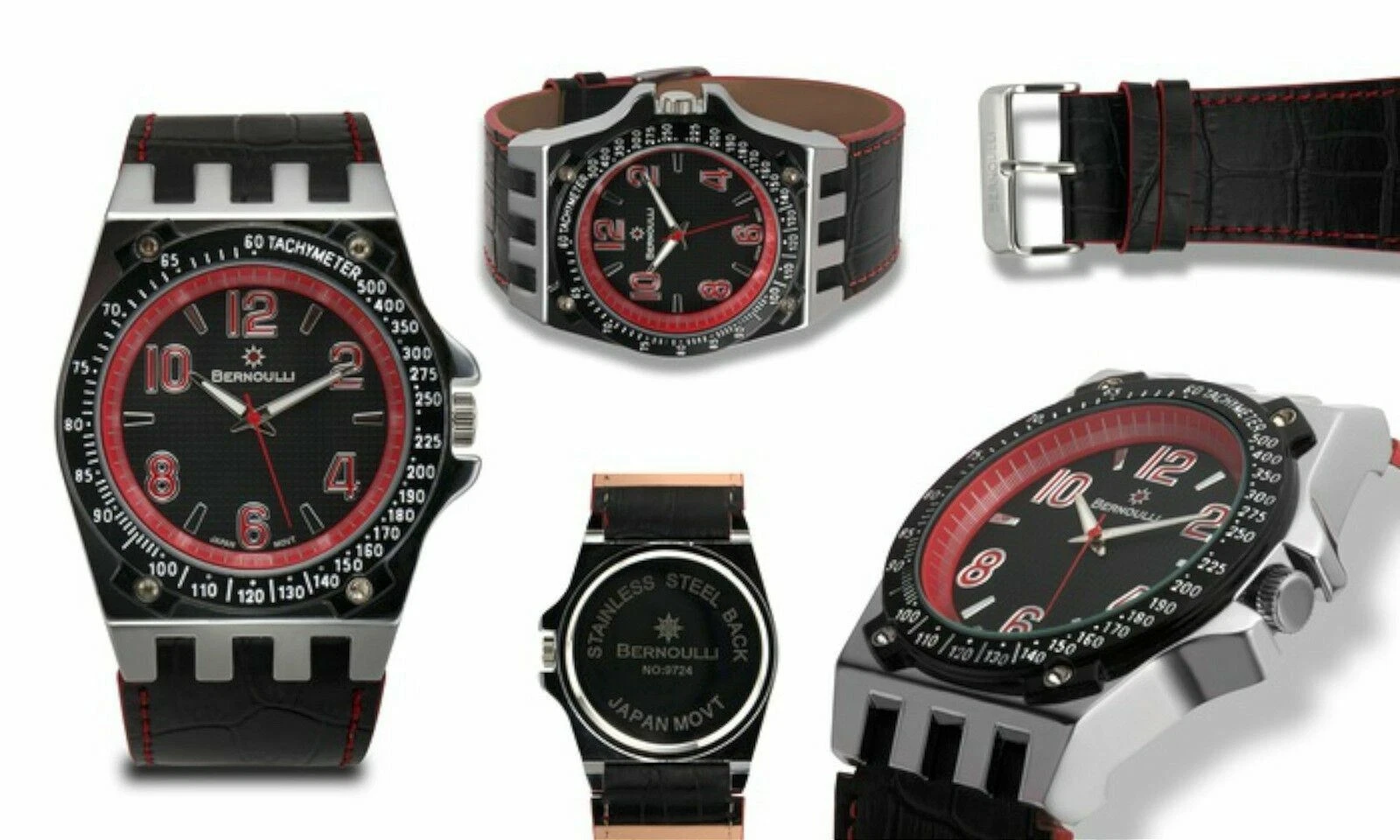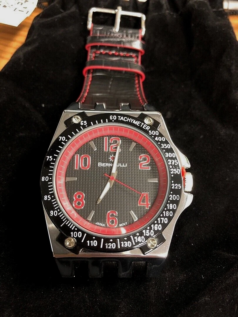 NEW Bernoulli 9724 Men's Polaris Textured Dial Wide Black Strap Red Accent Watch