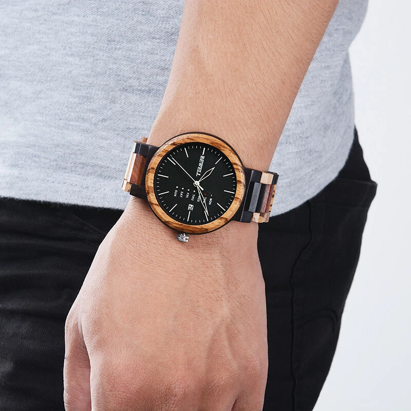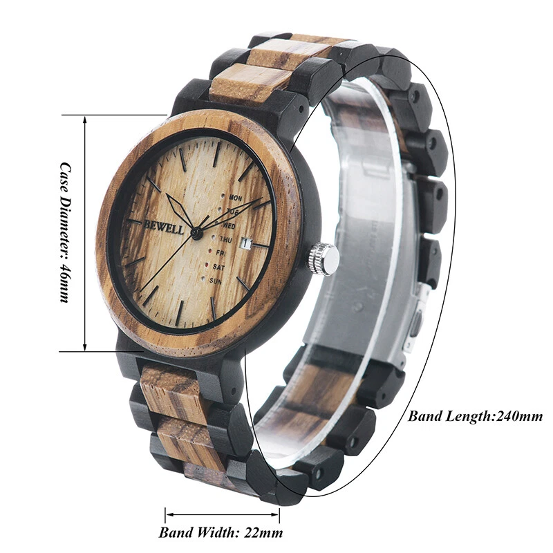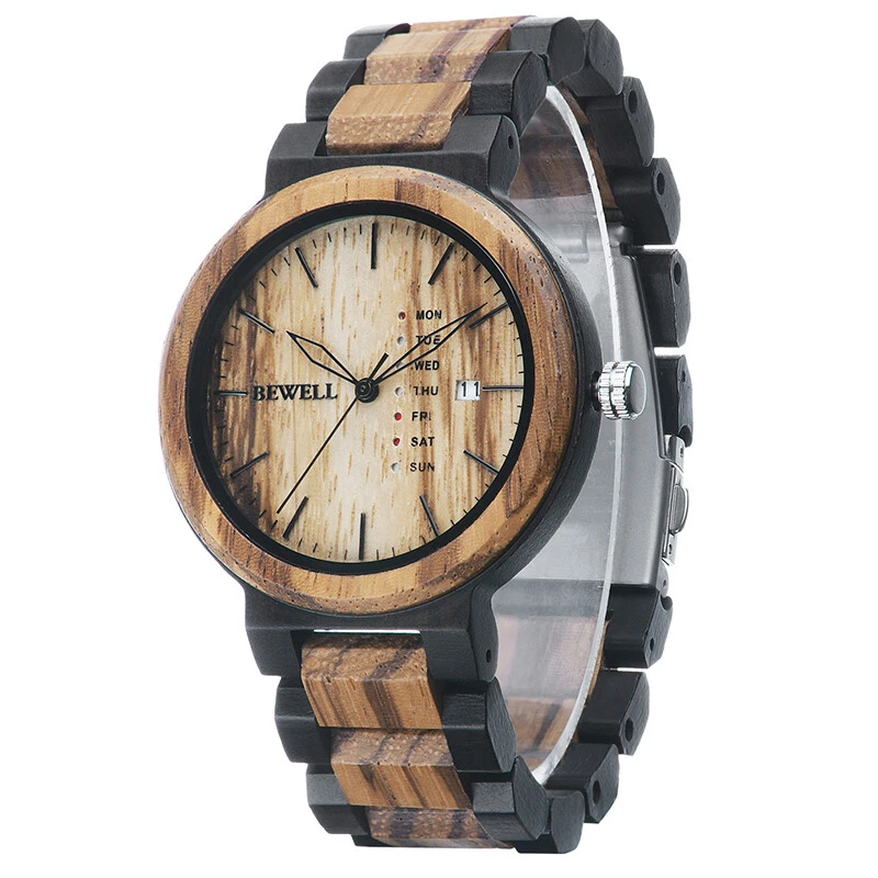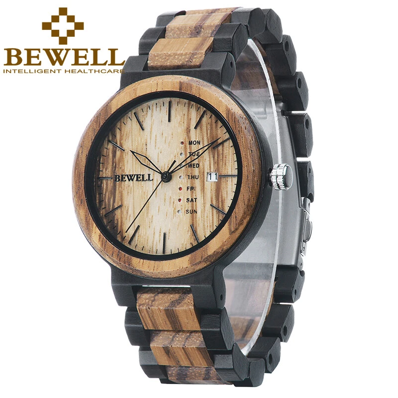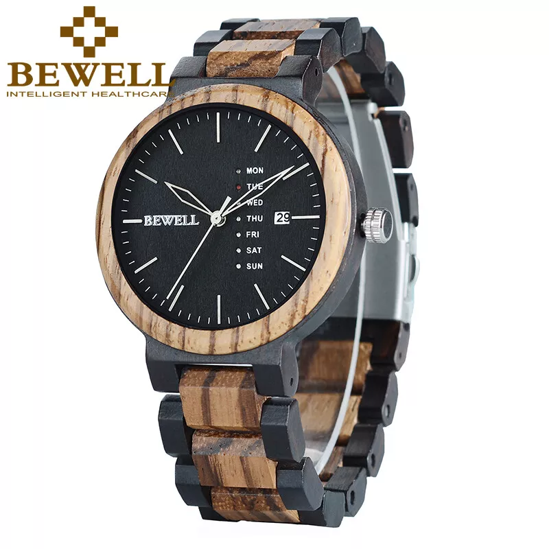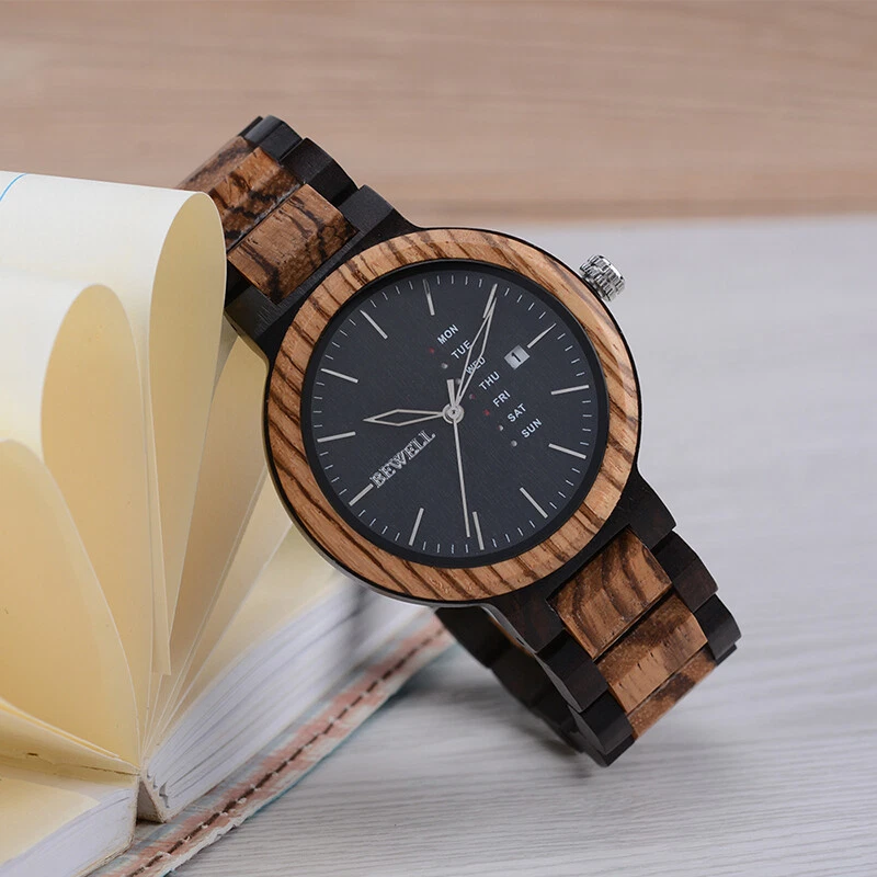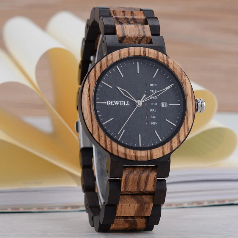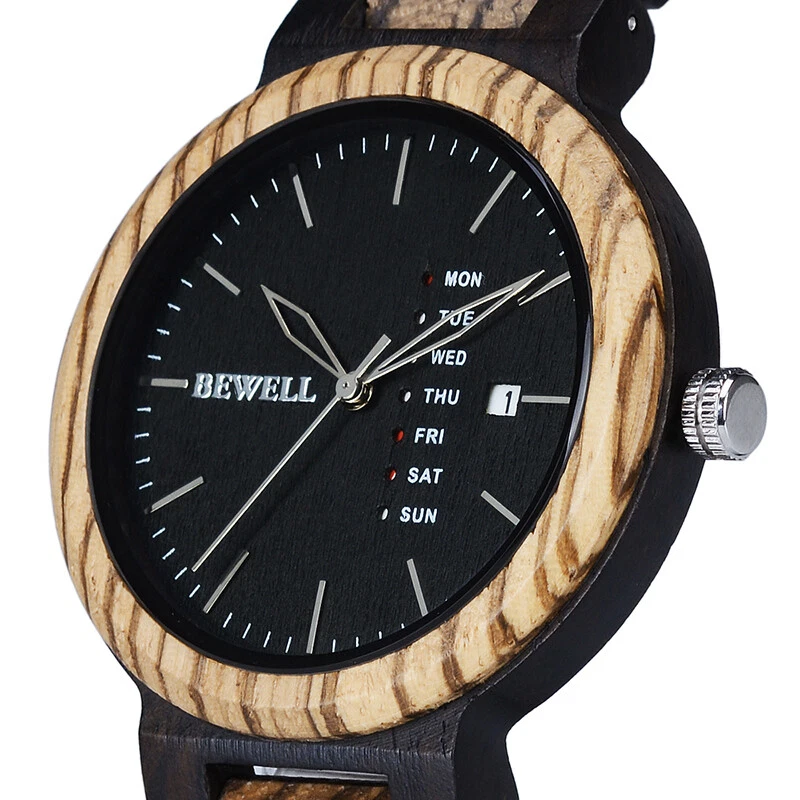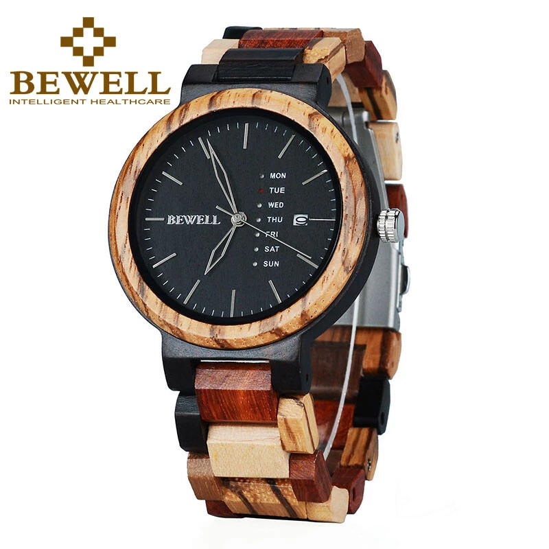 BEWELL Colorful Mens Wood Watches Day/Week Display Quartz Wooden Watch for Men