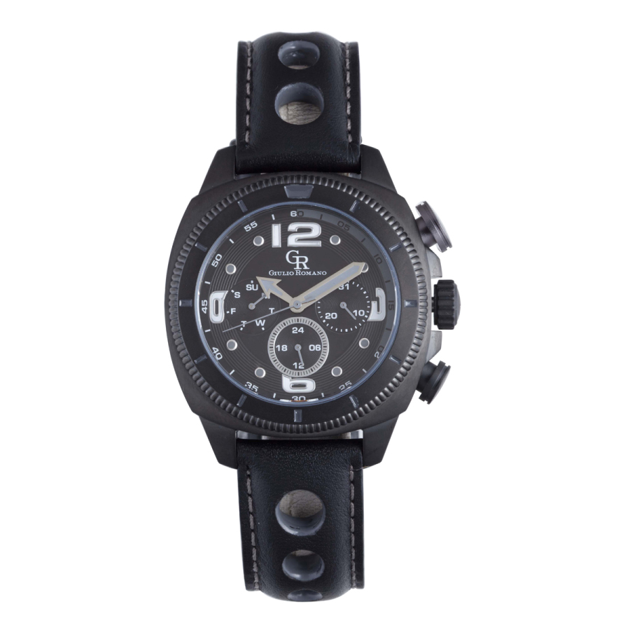 Black stainless steel case with a black leather strap. Fixed black bezel. Black dial with Arabic numeral and index hour markers. Minute markers around the outer rim. Dial Type: Analog. Luminescent markers. Date display at the 3 o'clock position. Three -24-hour, date and day of the week subdials. ISA Caliber 9238 quartz movement. Scratch resistant mineral crystal. Pull / push crown. Solid case back. Round case shape, case size: 42 mm, case thickness: 12.5 mm. Band width: 20 mm, band length: 8 inches. Deployment with push button release clasp. Water resistant at 50 meters / 165 feet. Functions: date, day, GMT, second time zone, hour, minute, second. Fashion watch style. Giulio Romano Pescara Quartz Black Dial Mens Watch GR-2000-13-011.