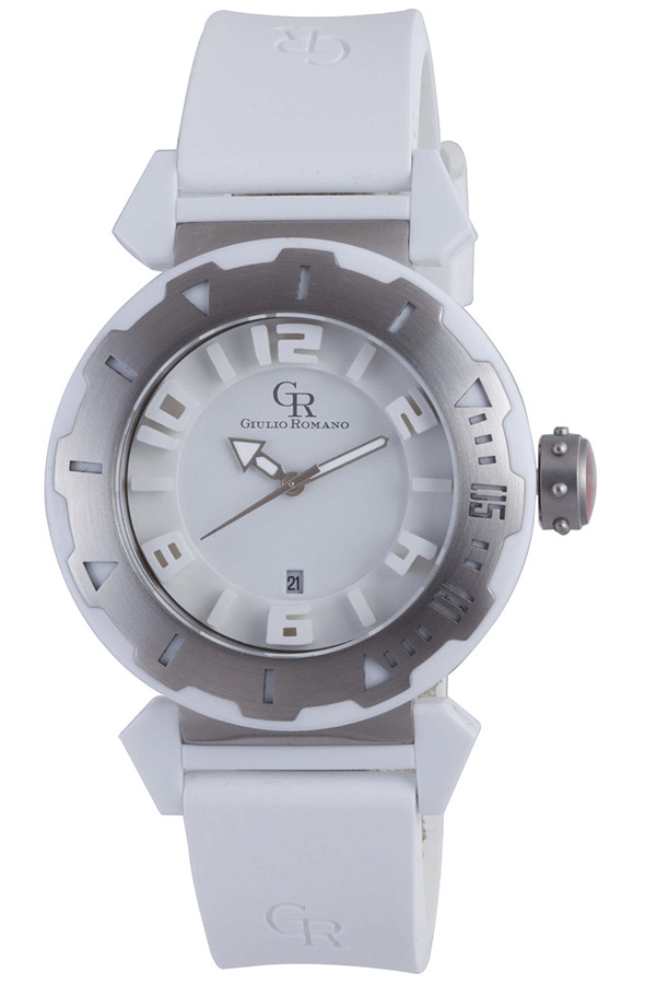 Stainless steel case with a white silicone strap. Uni-directional rotating steel bezel. White dial with black hands and Arabic numeral hour markers. Dial Type: Analog. Luminescent hands. Date display at the 6 o'clock position. Quartz movement. Scratch resistant mineral crystal. Solid case back. Case diameter: 46 mm. Case thickness: 13 mm. Round case shape. Band width: 21 mm. Band length: 8.5 inches. Buckle clasp. Water resistant at 100 meters / 330 feet. Functions: date, hour, minute, second. Casual watch style. Giulio Romano Ferrara Steel Bezel White Dial Mens Watch GR-5000-24-001.