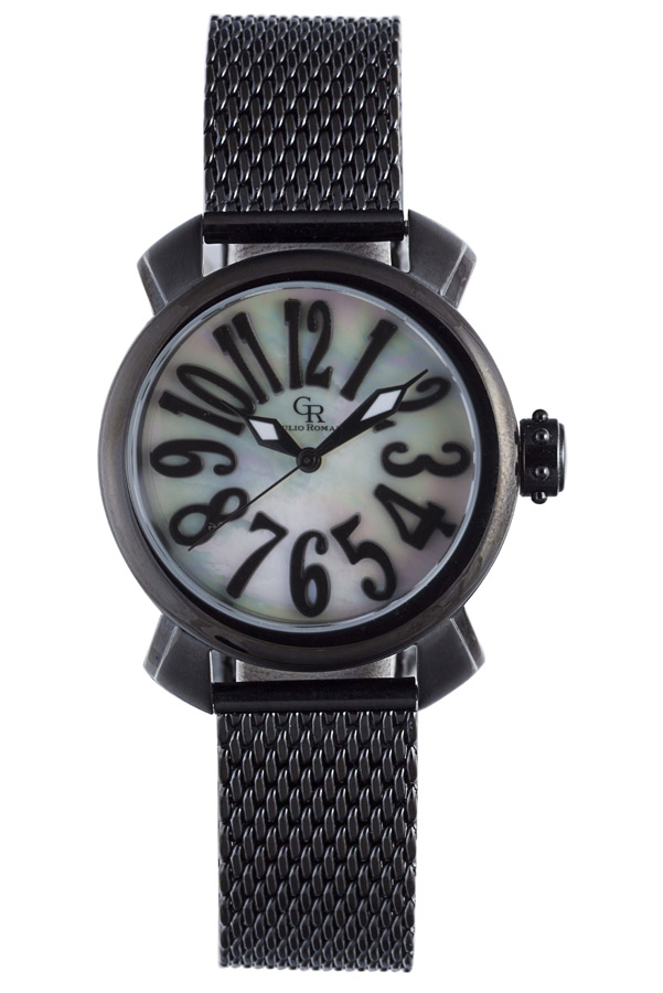 Black IP stainless steel case with a black IP stainless steel bracelet. Fixed black bezel. Mother of pearl dial with silver-tone hands and multi-colored 3d raised Arabic hour markers. Dial Type: Analog. Luminescent hands. Miyota Caliber 2035 quartz movement. Scratch resistant mineral crystal. Solid case back. Round case shape, case size: 37 mm, case thickness: 10 mm. Band width: 17 mm. Butterfly clasp. Water resistant at 50 meters / 165 feet. Functions: hour, minute, second. Casual watch style. Item Variations: GR 7000 13 001, GR.7000.13.001, GR700013001. Giulio Romano Rimini White Pearl Dial Black IP Steel Ladies Watch GR-7000-13-001.