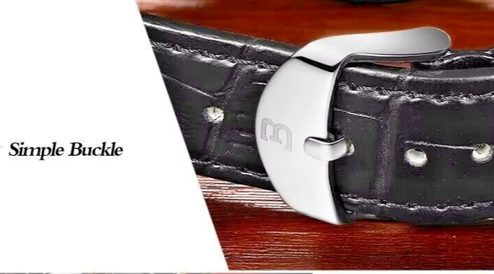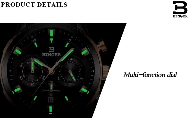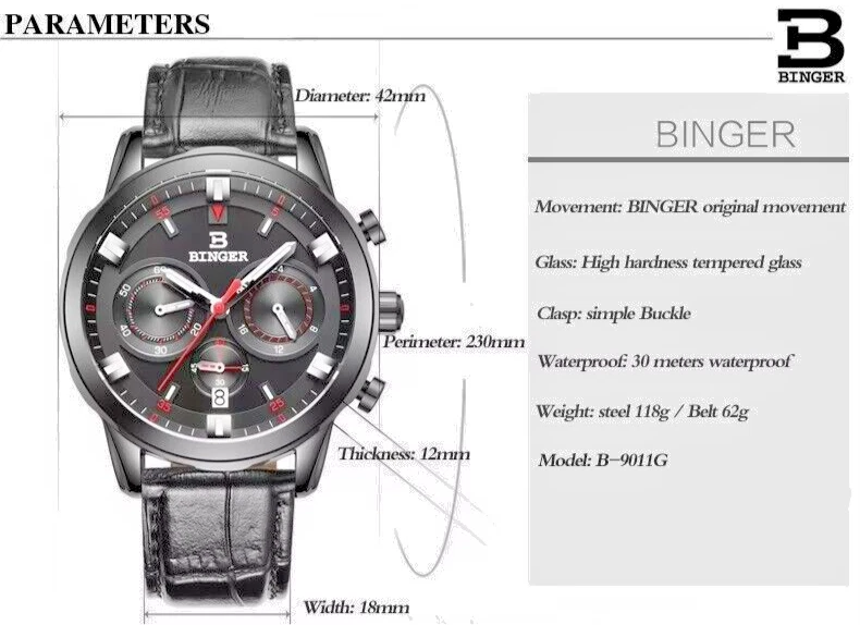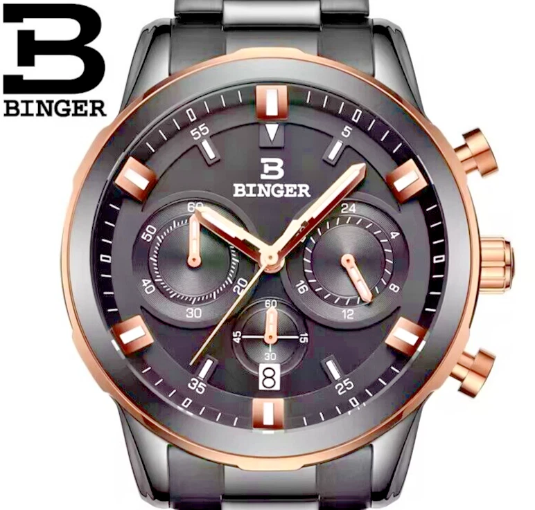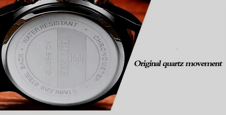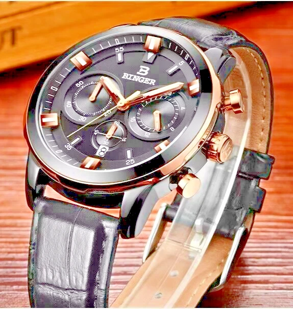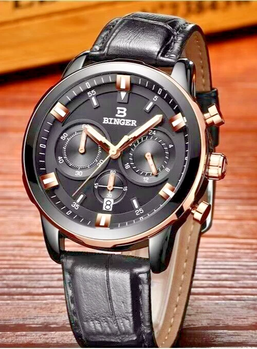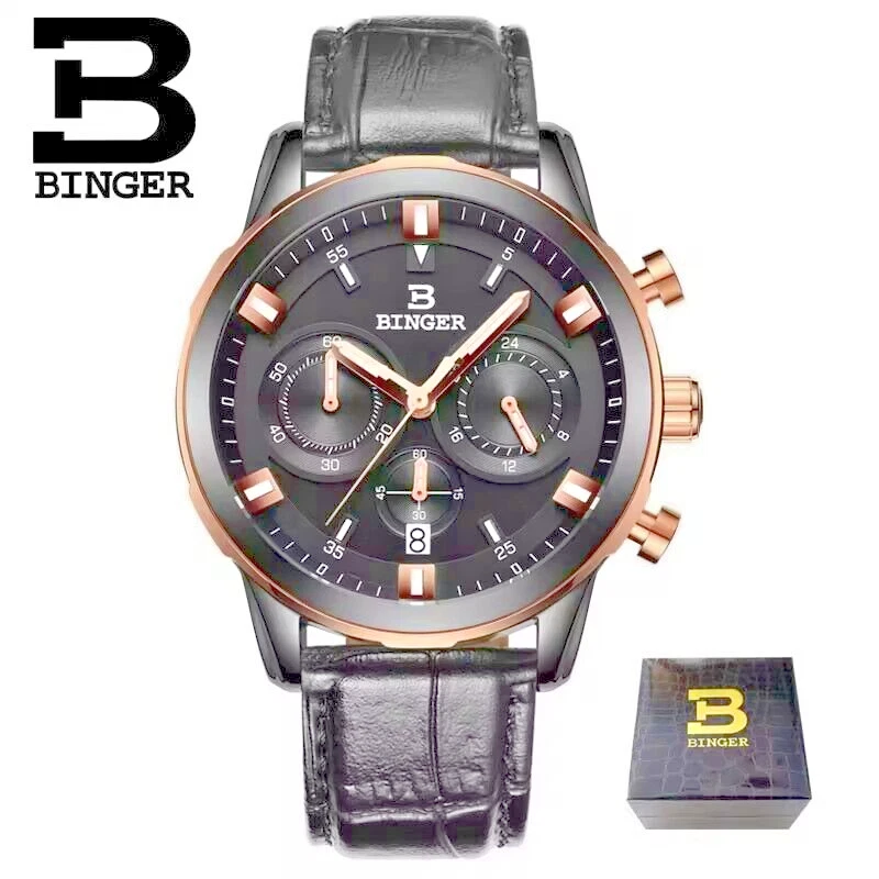 Binger B9011 Quartz Chronograph Stopwatch 42mm Date Dial Gold Case Leather Strap