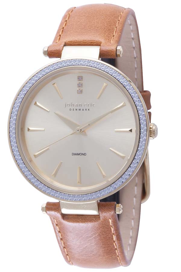 Gold-tone stainless steel case with a tan leather strap. Fixed gold-tone stainless steel bezel. Gold-tone dial with gold-tone hands and index hour markers. Dial Type: Analog. Quartz movement. Scratch resistant mineral crystal. Push/pull crown. Solid case back. Round case shape, case size: 36.75 mm, case thickness: 7 mm. Band width: 17.5 mm, band length: 7.5 in. Buckle clasp. Water resistant at 50 meters / 165 feet. Functions: hour, minute, second. Casual watch style. Johan Eric Fredericia Gold Dial Ladies Watch JE-F1000-02-002.
