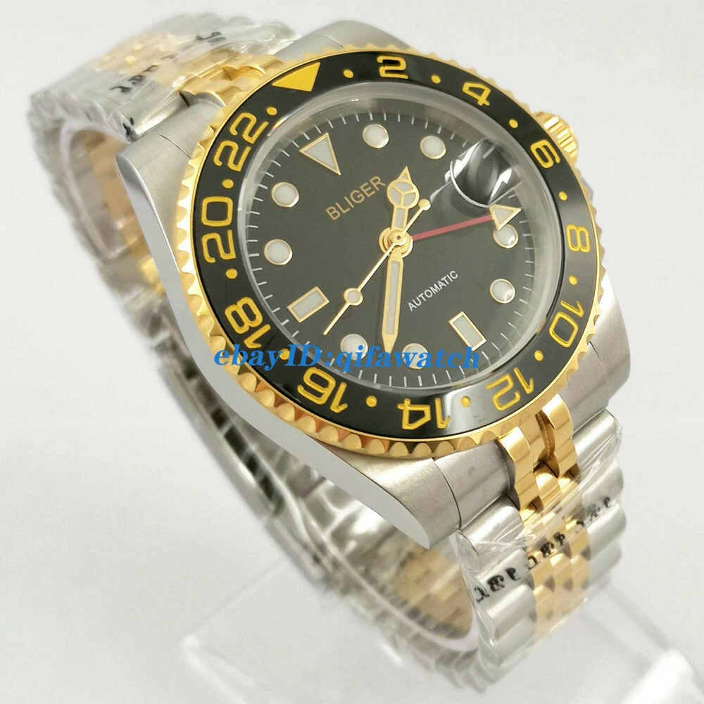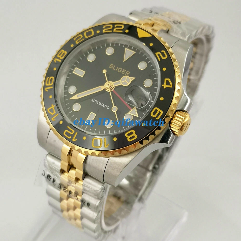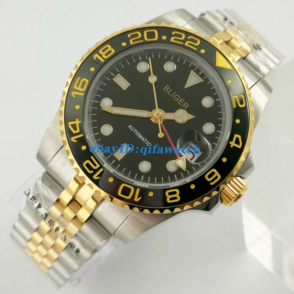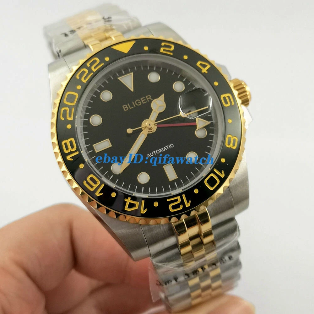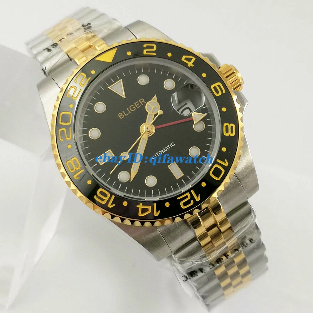 40mm Bliger black dial GMT automatic mens wrist watch sapphire crystal date Gift