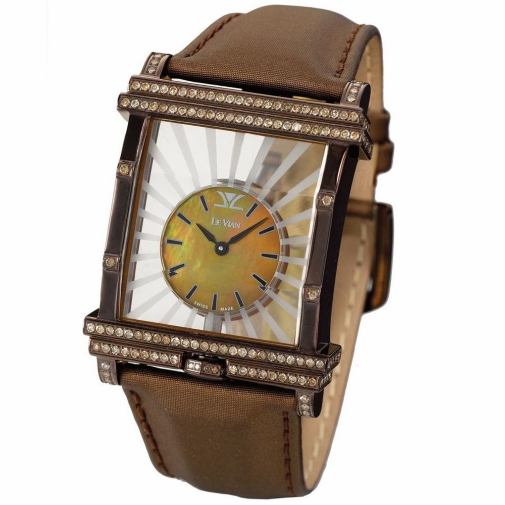 Brown stainless steel case with a brown leather strap. Fixed brown bezel with chocolate diamond set stainless steel. Champagne dial with black hands and index hour markers. Dial Type: Analog. Quartz movement. Transparent see through case back. Square case shape, case size: 30 mm. Band width: 28 mm. Buckle clasp. Functions: hour, minute. Additional Info: 1 7/8 cts. chocolate diamond. Floater Series. Fashion watch style. Le Vian Floater Quartz Diamond Champagne Dial Unisex Watch ZAG 117.