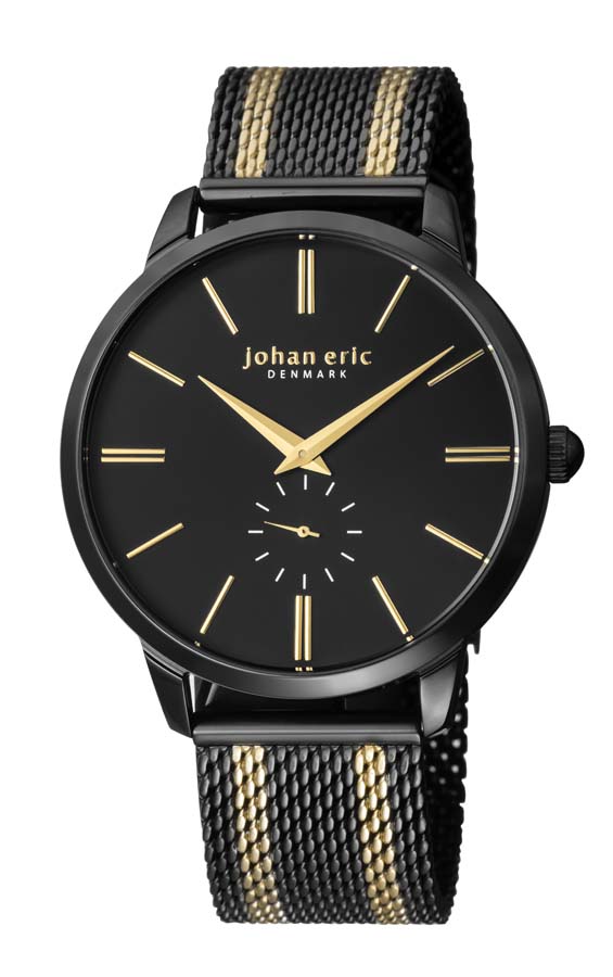 Black stainless steel case with a two-toned stainless steel bracelet. Fixed black stainless steel bezel. Black dial with gold-tone hands. Dial Type: Analog. One - 60 seconds subdial. Quartz movement. Scratch resistant mineral crystal. Push/pull crown. Solid case back. Round case shape, case size: 42 mm, case thickness: 9 mm. Band width: 18 mm, band length: 8.5 in. Fold over clasp. Water resistant at 50 meters / 165 feet. Functions: hour, minute, second. Casual watch style. Johan Eric Kolding Black Dial Mens Watch JE2400-13-009.