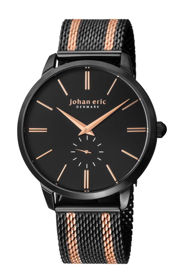 Black stainless steel case with a two-toned stainless steel bracelet. Fixed black stainless steel bezel. Black dial with rose gold-tone hands and index hour markers. Dial Type: Analog. One - 60 seconds subdial. Quartz movement. Scratch resistant mineral crystal. Push/pull crown. Solid case back. Round case shape, case size: 42 mm, case thickness: 9 mm. Band width: 18 mm, band length: 8.5 in. Fold over clasp. Water resistant at 50 meters / 165 feet. Functions: hour, minute, second. Casual watch style. Johan Eric Kolding Black Dial Mens Watch JE2400-13-007.