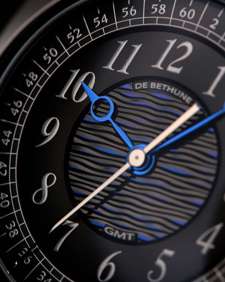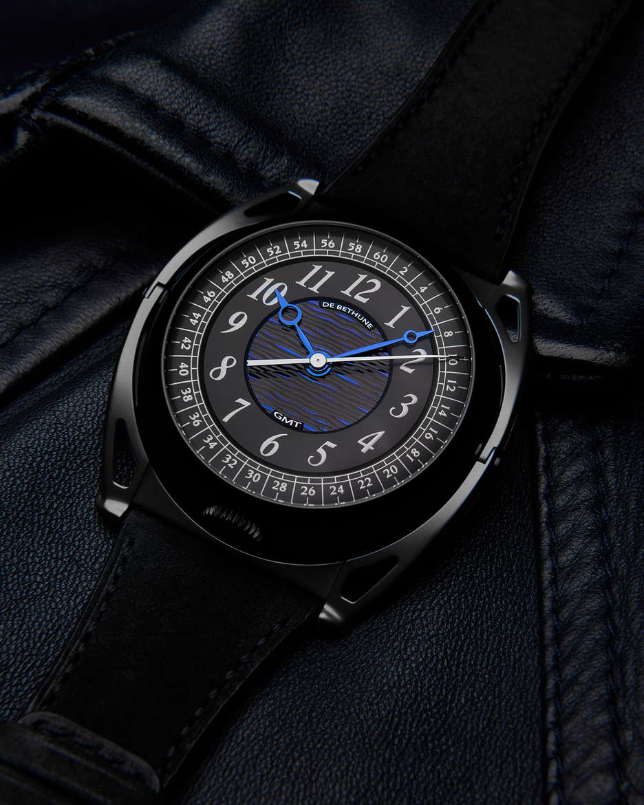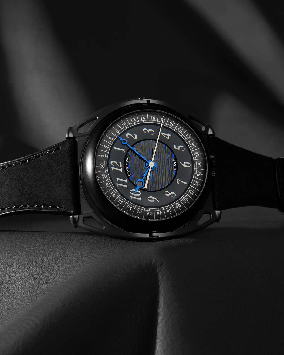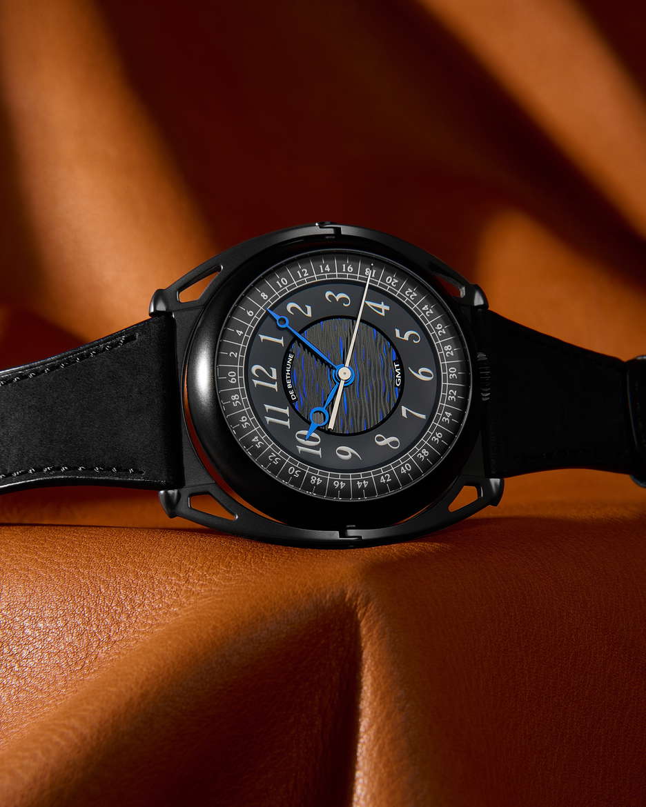 De Bethune’s latest collaboration with Swizz Beatz, the DB Kind of Two GMT Season 3, is a statement that transcends function and design. Building on the conceptual DNA of their earlier creative fusions, this dual-faced timepiece fuses high watchmaking with avant-garde artistry. At its core is a technically sophisticated, fully reversible movement that enables two independent time displays—one contemporary, one classic—accessible with an easy flipping motion. The contemporary face of the watch is striking in its symmetry and spatial depth. A deltoid bridge anchors the balance wheel at 6 o’clock, while the polished, domed surfaces and satin finishes lend the black-coated movement a bold yet refined presence. Polished blued hands, a jumping seconds complication, and golden accents ensure legibility and allure in equal measure. This side speaks to a modern design, emphasizing clean geometry, precise mechanics, and dynamic contrasts—hallmarks of De Bethune’s forward-thinking design language. Flip the case, and the tone shifts. The classic GMT display offers a nostalgic nod to the Maison’s past with cues from the DB8 and DB10, but it’s far from retro. A hand-guilloché central motif subtly shimmers with blue reflections, creating an almost lyrical display that captures the poetic spirit of the brand. The mirror-polished steel seconds hand glides across the dial like a quiet signature, a refined counterpoint to the boldness of the contemporary face. The case is in Grade 5 titanium with a matte black zirconium coating. Floating lugs ensure comfort, while the ingenious 42-component case system makes the dual display not just possible, but practical. As with Swizz Beatz’s genre-defying artistry, this timepiece balances contrasting identities—technical and emotional, classic and modern—into a unified, wearable expression of creativity.