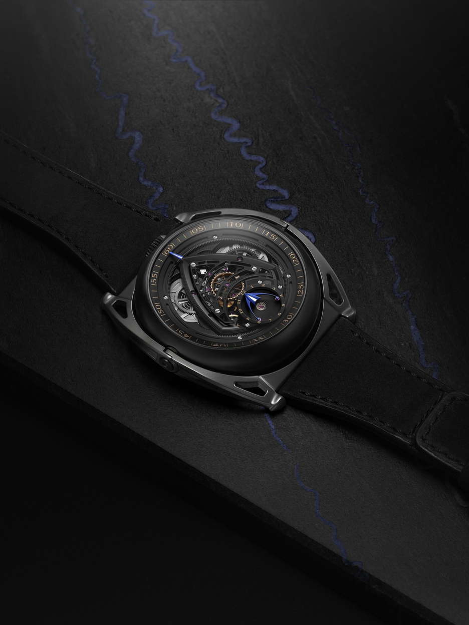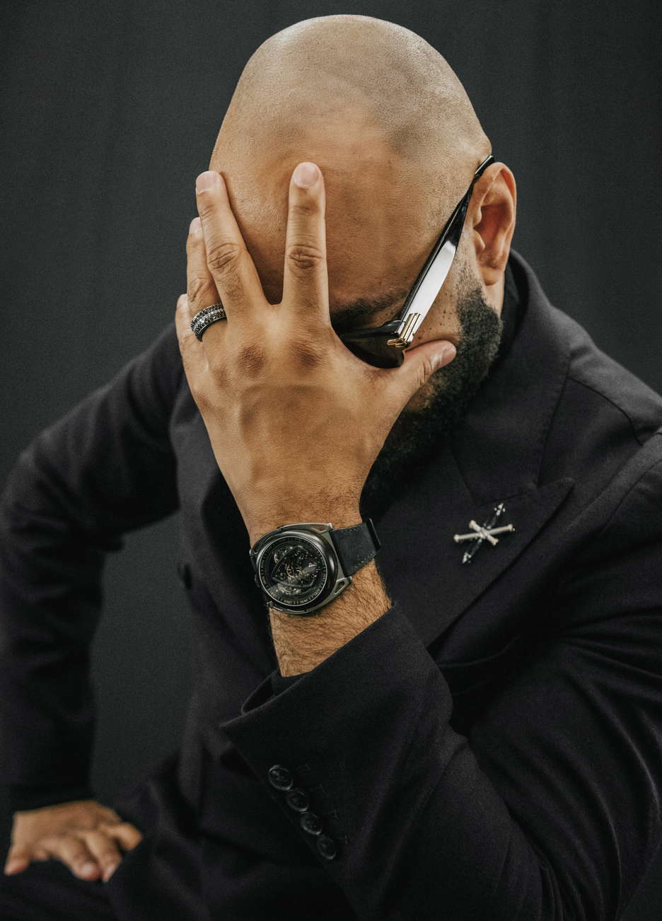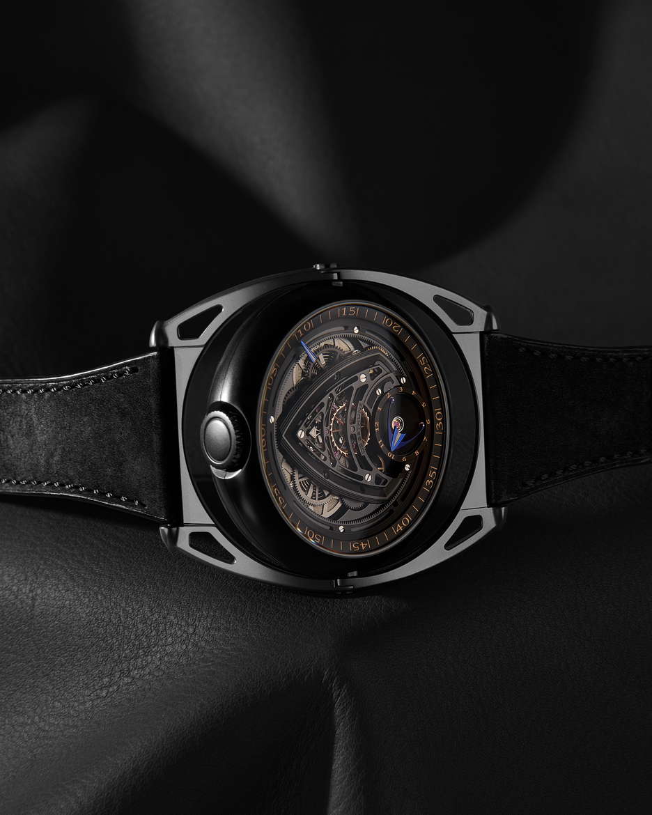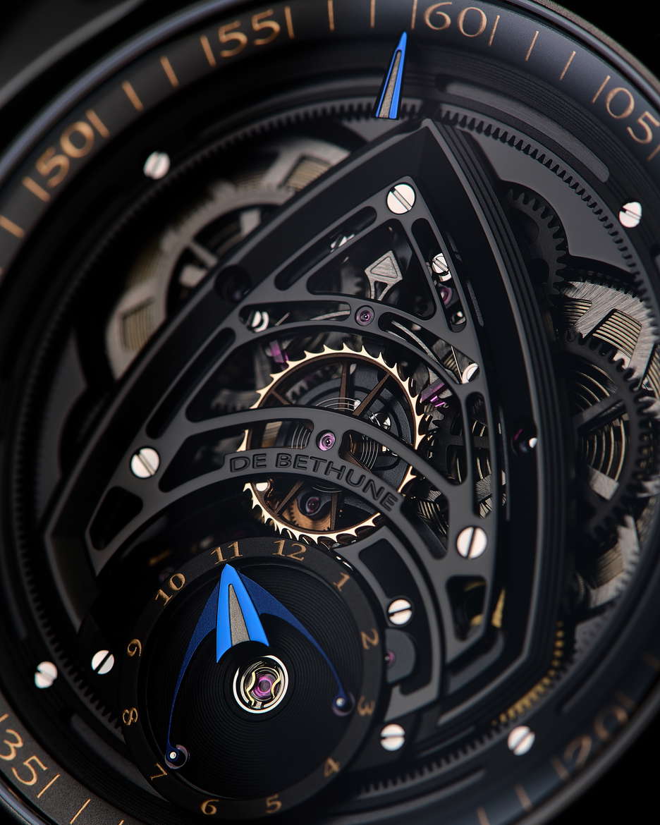 De Bethune’s latest collaboration with Swizz Beatz, the DB Kind of Two GMT Season 3, is a statement that transcends function and design. Building on the conceptual DNA of their earlier creative fusions, this dual-faced timepiece fuses high watchmaking with avant-garde artistry. At its core is a technically sophisticated, fully reversible movement that enables two independent time displays—one contemporary, one classic—accessible with an easy flipping motion. The contemporary face of the watch is striking in its symmetry and spatial depth. A deltoid bridge anchors the balance wheel at 6 o’clock, while the polished, domed surfaces and satin finishes lend the black-coated movement a bold yet refined presence. Polished blued hands, a jumping seconds complication, and golden accents ensure legibility and allure in equal measure. This side speaks to a modern design, emphasizing clean geometry, precise mechanics, and dynamic contrasts—hallmarks of De Bethune’s forward-thinking design language. Flip the case, and the tone shifts. The classic GMT display offers a nostalgic nod to the Maison’s past with cues from the DB8 and DB10, but it’s far from retro. A hand-guilloché central motif subtly shimmers with blue reflections, creating an almost lyrical display that captures the poetic spirit of the brand. The mirror-polished steel seconds hand glides across the dial like a quiet signature, a refined counterpoint to the boldness of the contemporary face. The case is in Grade 5 titanium with a matte black zirconium coating. Floating lugs ensure comfort, while the ingenious 42-component case system makes the dual display not just possible, but practical. As with Swizz Beatz’s genre-defying artistry, this timepiece balances contrasting identities—technical and emotional, classic and modern—into a unified, wearable expression of creativity.