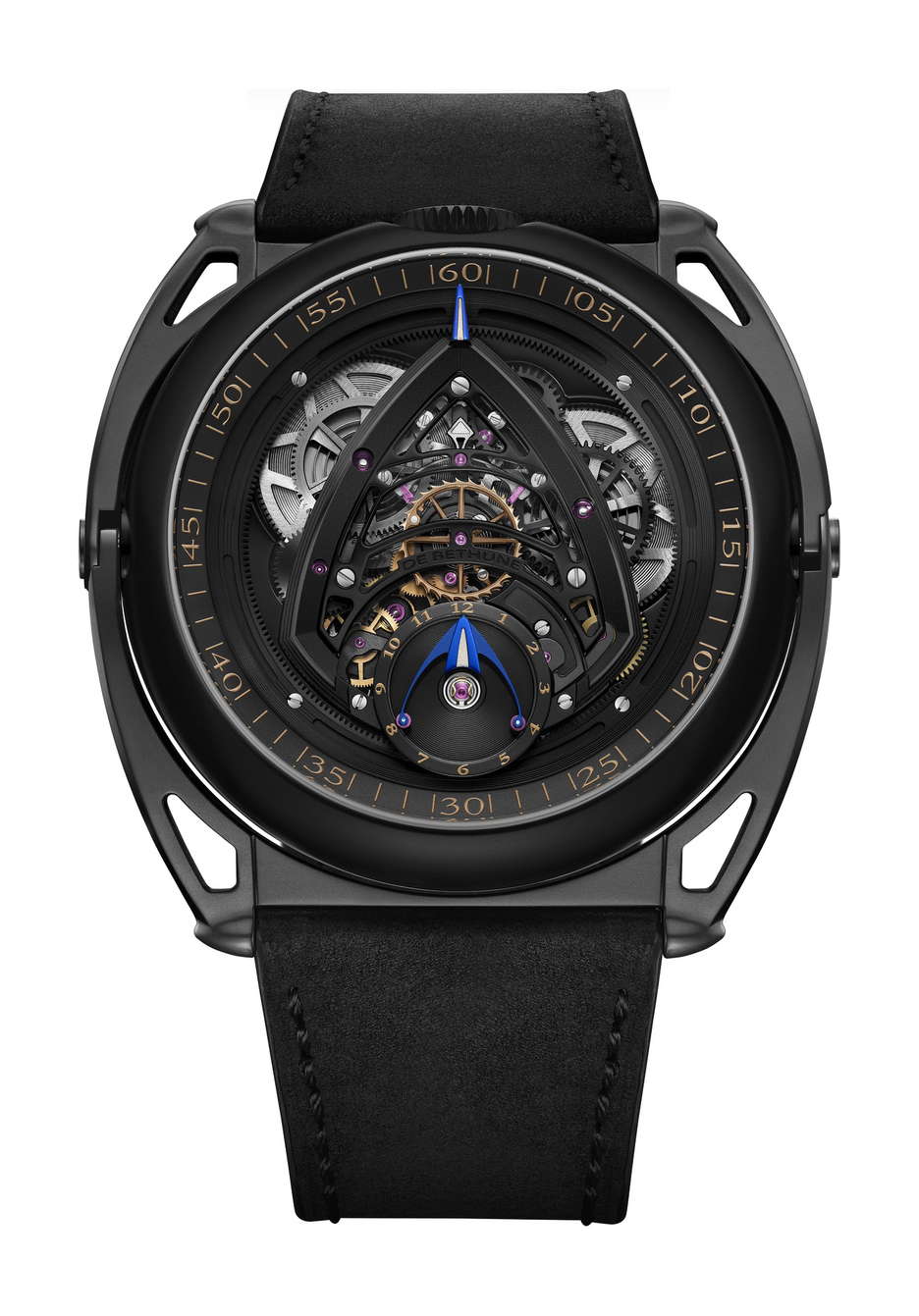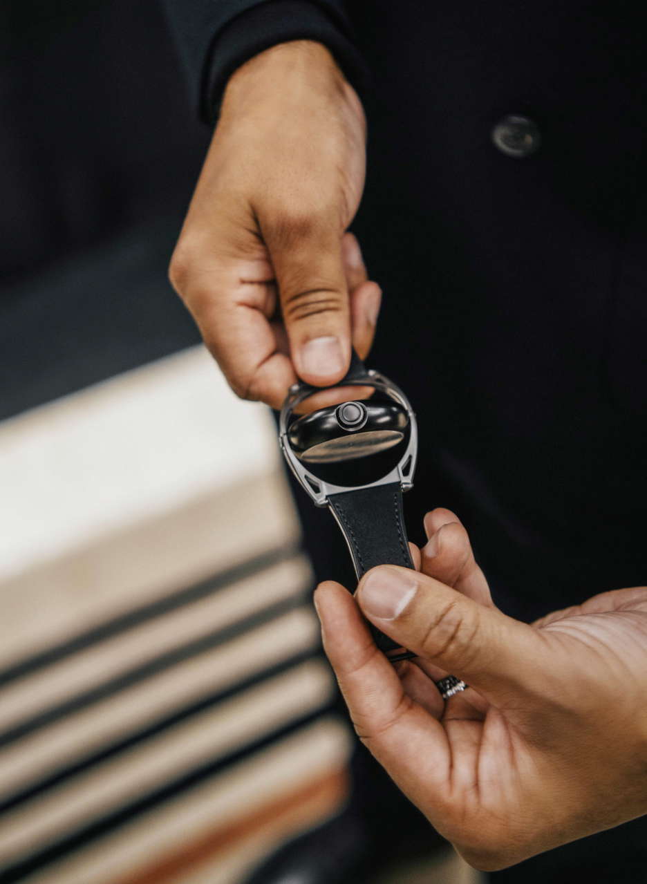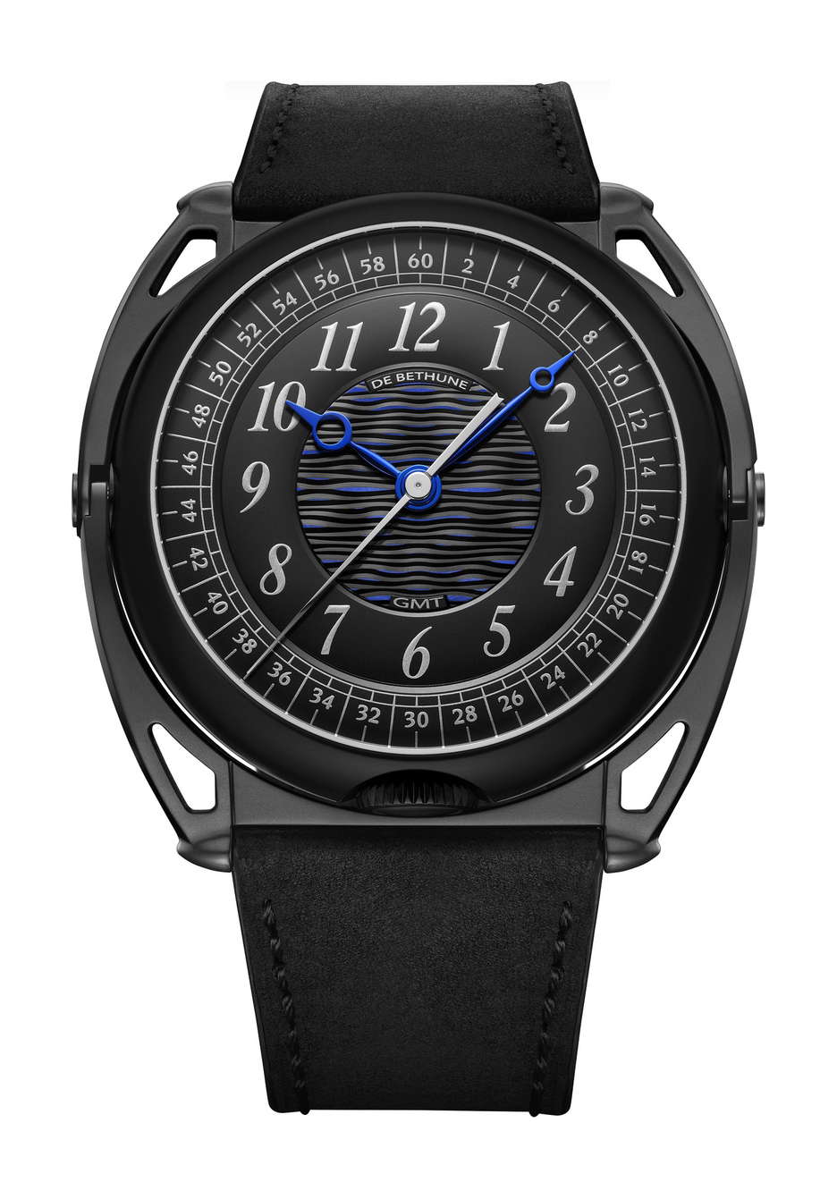 De Bethune’s latest collaboration with Swizz Beatz, the DB Kind of Two GMT Season 3, is a statement that transcends function and design. Building on the conceptual DNA of their earlier creative fusions, this dual-faced timepiece fuses high watchmaking with avant-garde artistry. At its core is a technically sophisticated, fully reversible movement that enables two independent time displays—one contemporary, one classic—accessible with an easy flipping motion. The contemporary face of the watch is striking in its symmetry and spatial depth. A deltoid bridge anchors the balance wheel at 6 o’clock, while the polished, domed surfaces and satin finishes lend the black-coated movement a bold yet refined presence. Polished blued hands, a jumping seconds complication, and golden accents ensure legibility and allure in equal measure. This side speaks to a modern design, emphasizing clean geometry, precise mechanics, and dynamic contrasts—hallmarks of De Bethune’s forward-thinking design language. Flip the case, and the tone shifts. The classic GMT display offers a nostalgic nod to the Maison’s past with cues from the DB8 and DB10, but it’s far from retro. A hand-guilloché central motif subtly shimmers with blue reflections, creating an almost lyrical display that captures the poetic spirit of the brand. The mirror-polished steel seconds hand glides across the dial like a quiet signature, a refined counterpoint to the boldness of the contemporary face. The case is in Grade 5 titanium with a matte black zirconium coating. Floating lugs ensure comfort, while the ingenious 42-component case system makes the dual display not just possible, but practical. As with Swizz Beatz’s genre-defying artistry, this timepiece balances contrasting identities—technical and emotional, classic and modern—into a unified, wearable expression of creativity.