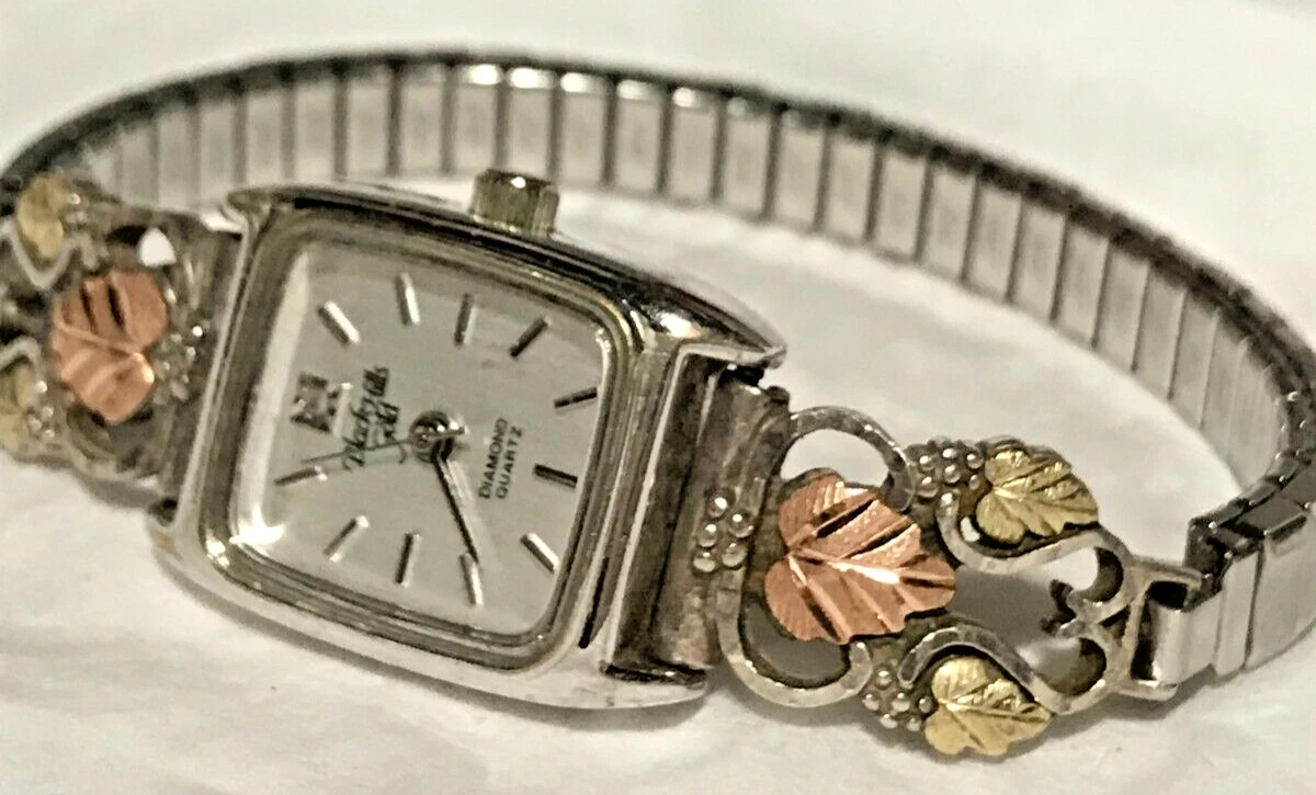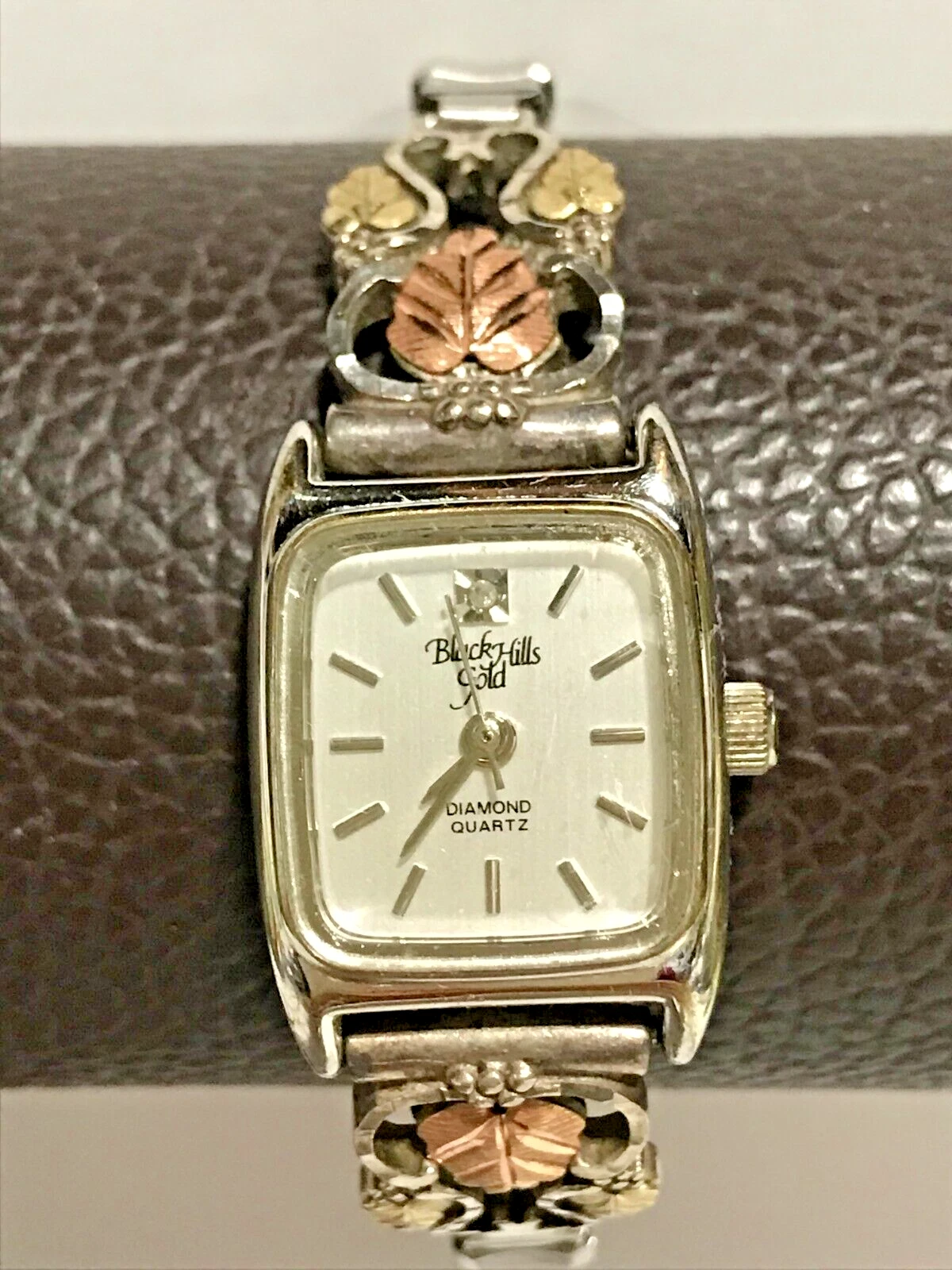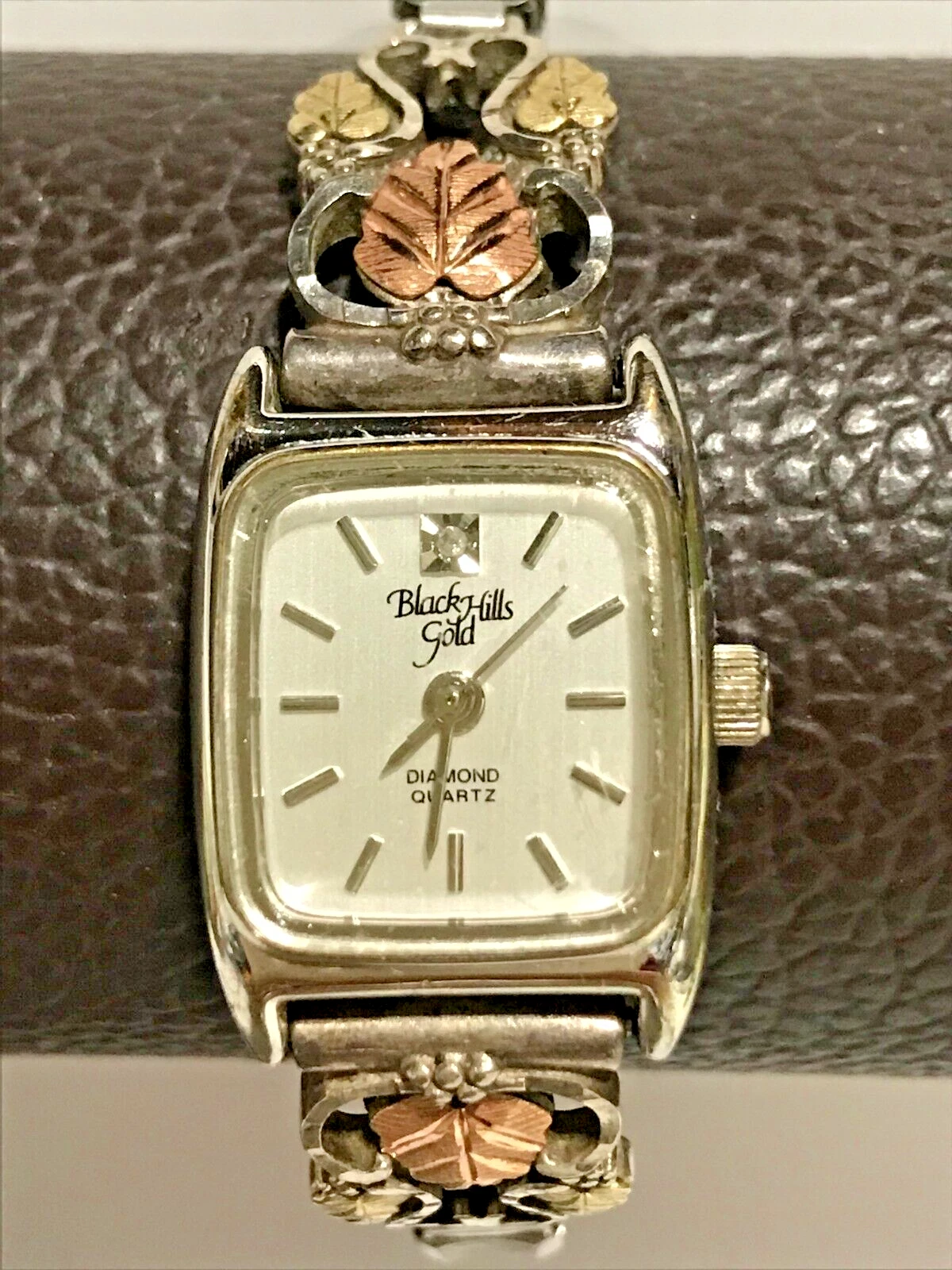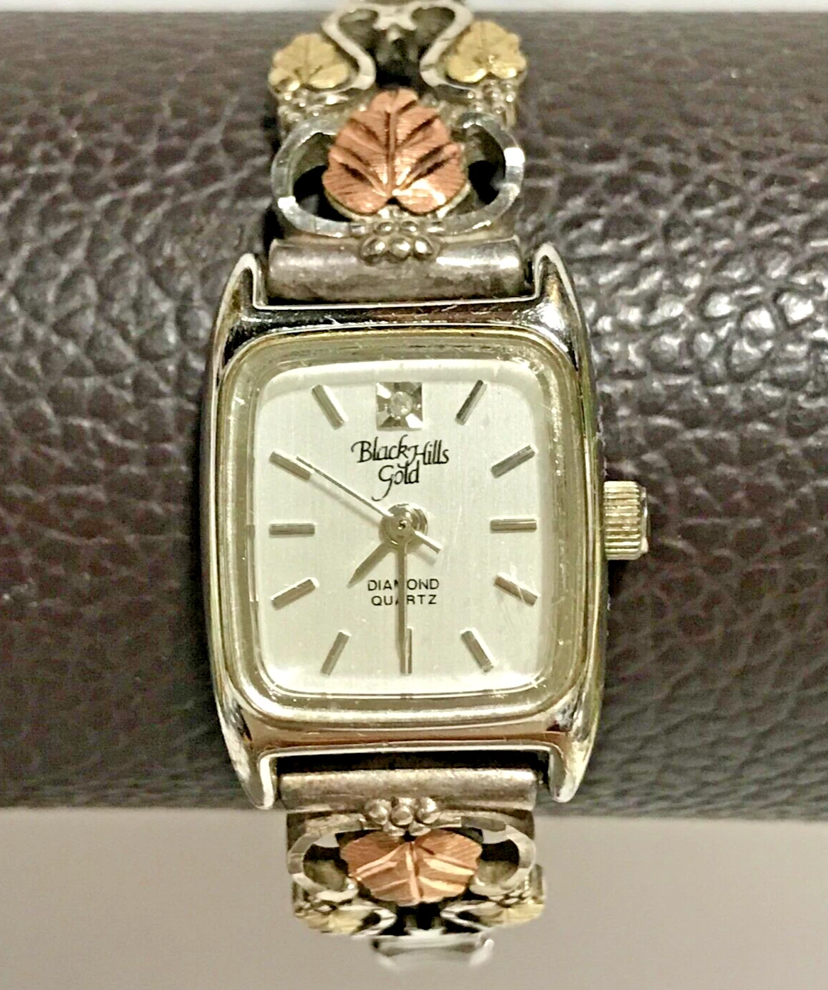Vintage Black Hills Gold Diamond 12K Leaves Sterling Silver Ladies Watch Works
