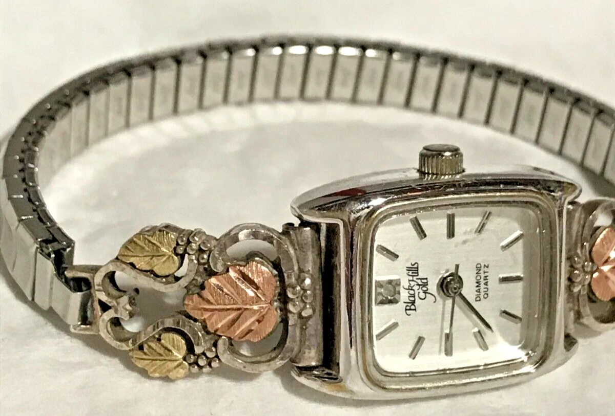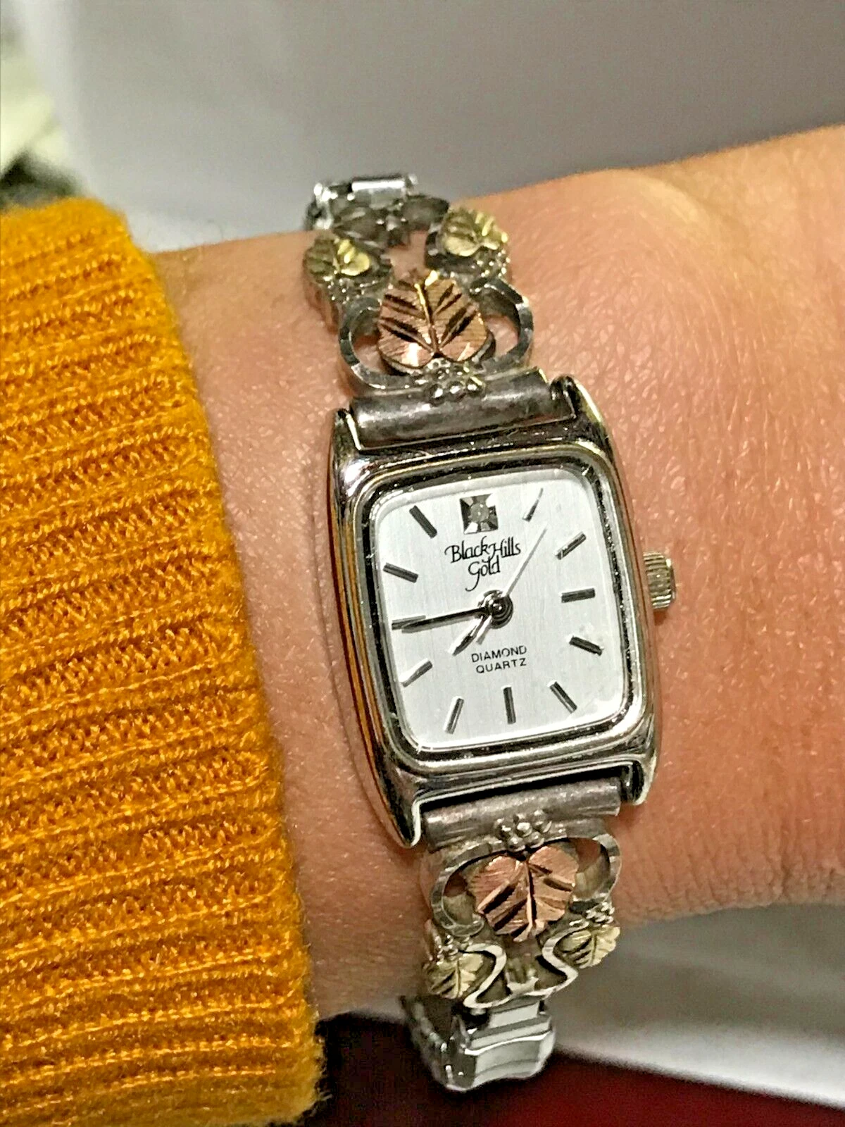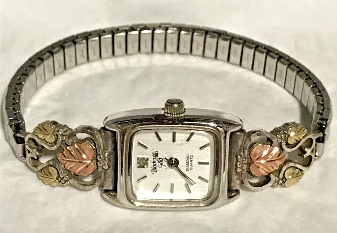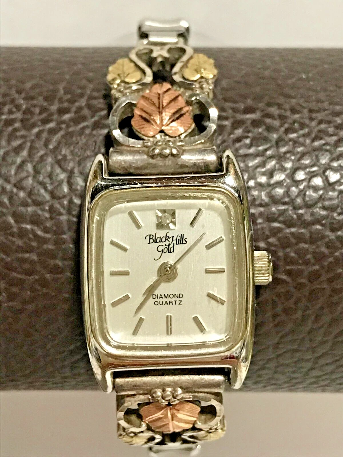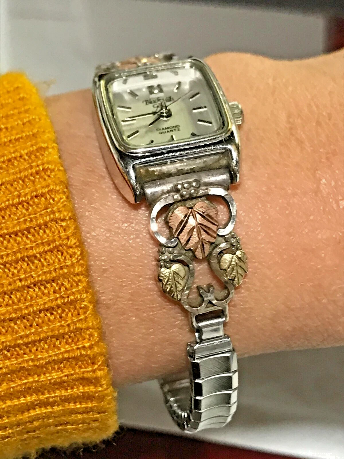 Vintage Black Hills Gold Diamond 12K Leaves Sterling Silver Ladies Watch Works