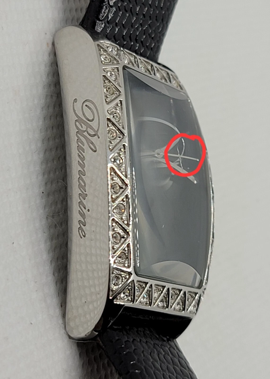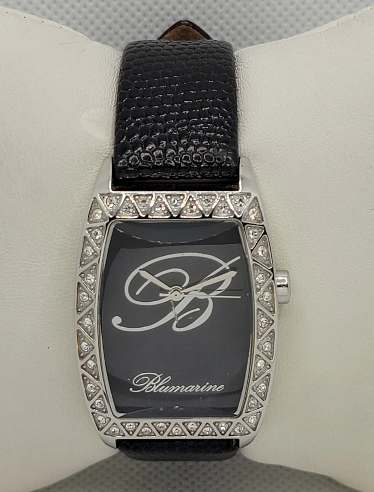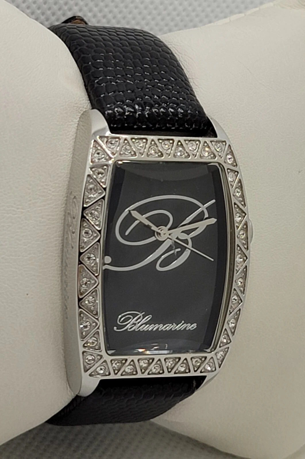 Ladies Blumarine Fancy Silver Tone Paved Bezel Black Dial Leather Band Watch J3
