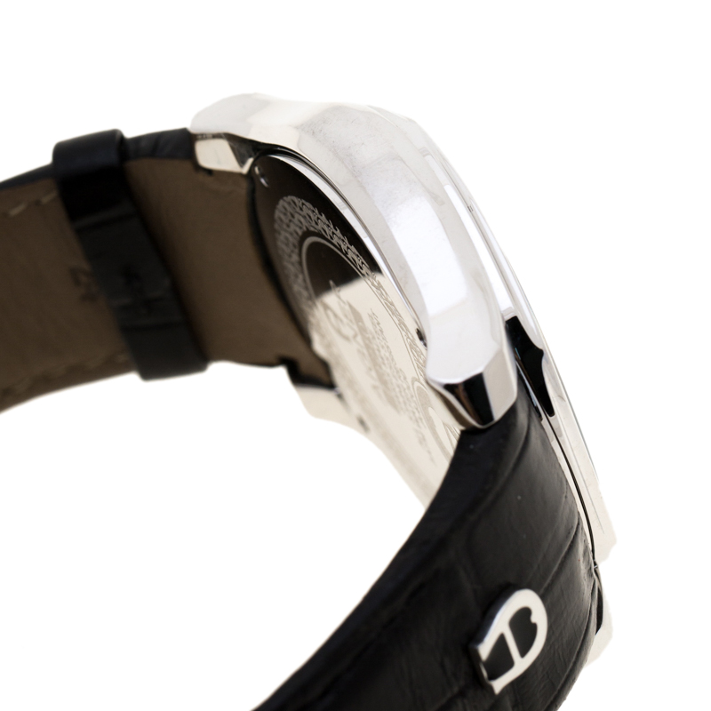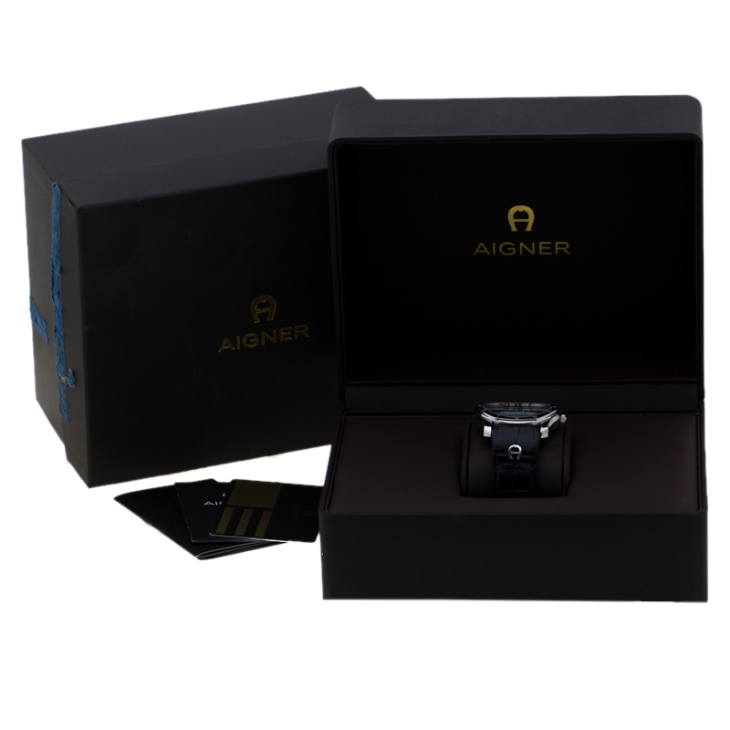 This Aigner wristwatch has a white dial with bold blue Roman numeral hour markers and a date display. The quartz movement helps you check the time with undivided accuracy. It features a metal A signature on the leather strap along with A-shaped buckle closure.