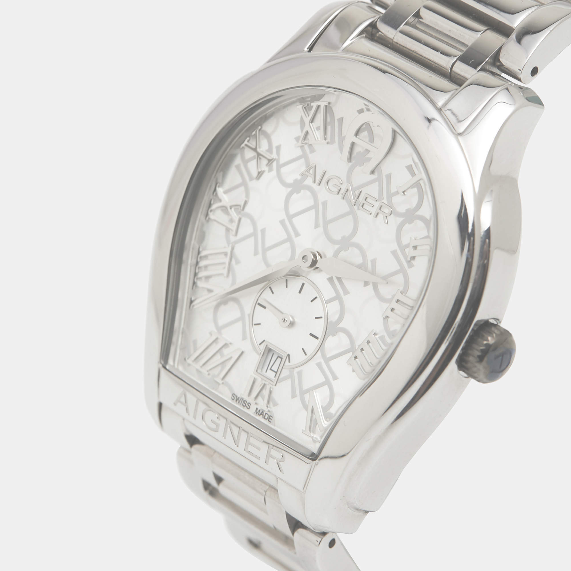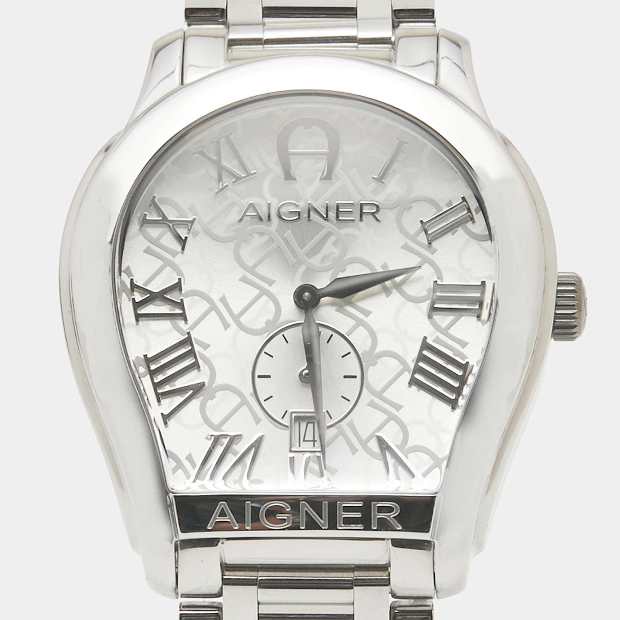 This Aigner Vicenza A111100 watch in stainless steel has a 39 mm case and a gorgeous logo-shaped bezel. Designed to be ideal for everyday use, the quartz watch comes fitted with a silver dial and a simple clasp to the comfortable bracelet.