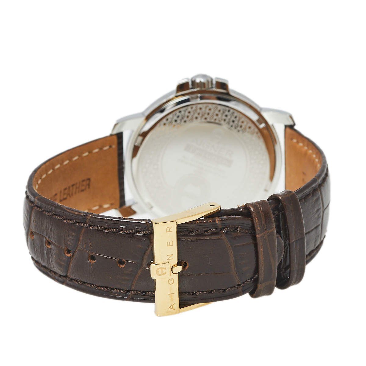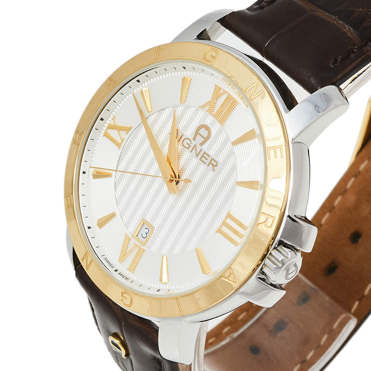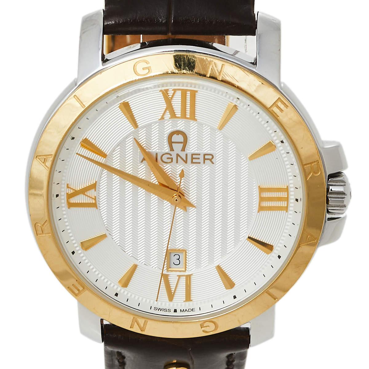 This Triento A09000 men's watch from Aigner, crafted from two-tone stainless steel, exhibits an appeal that's classic. The quartz watch has a silver dial with distinct markers and a date window, a brand-engraved bezel, and a comfortable leather bracelet.