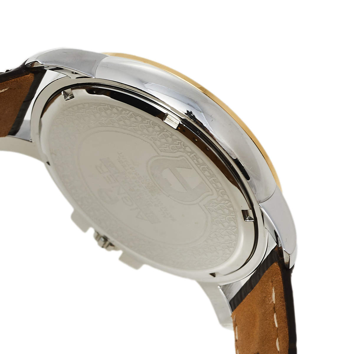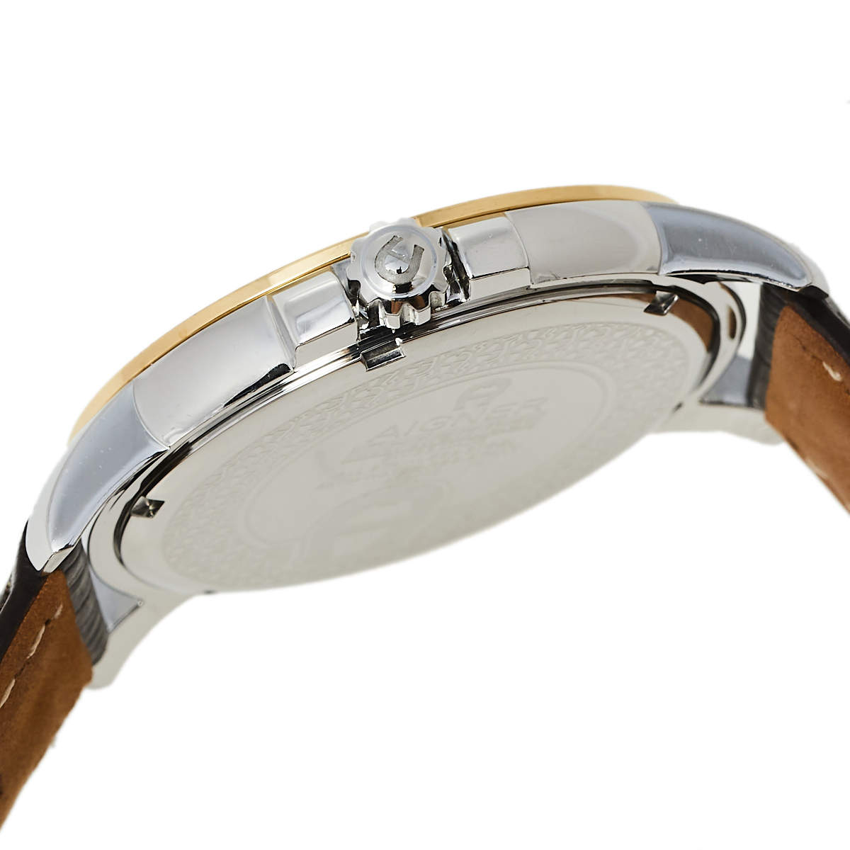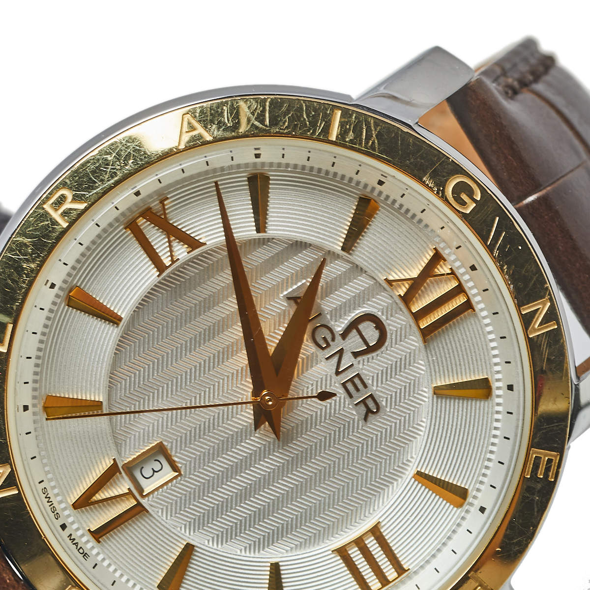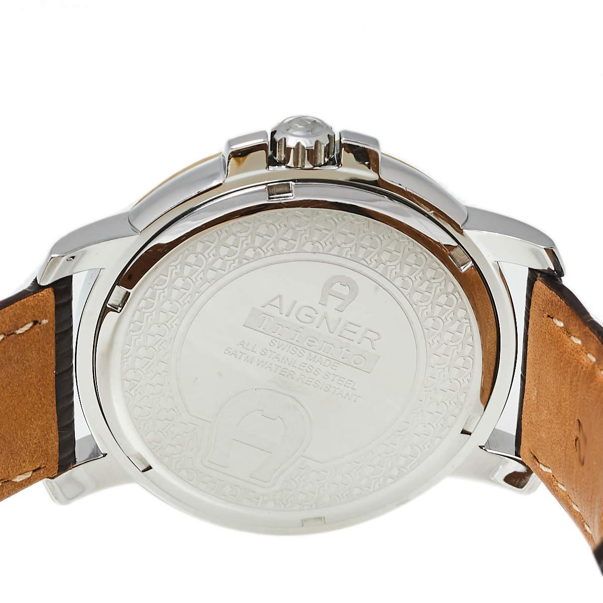 This Triento A09000 men's watch from Aigner, crafted from two-tone stainless steel, exhibits an appeal that's classic. The quartz watch has a silver dial with distinct markers and a date window, a brand-engraved bezel, and a comfortable leather bracelet.