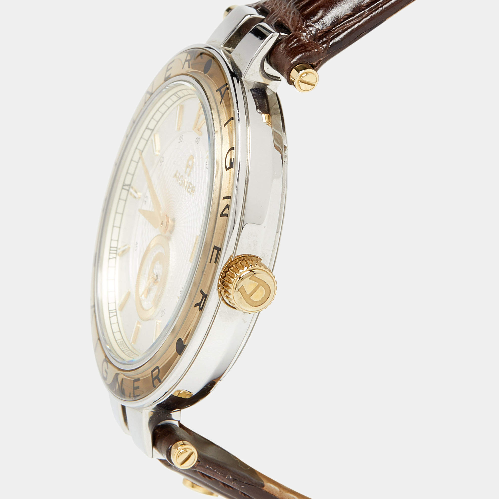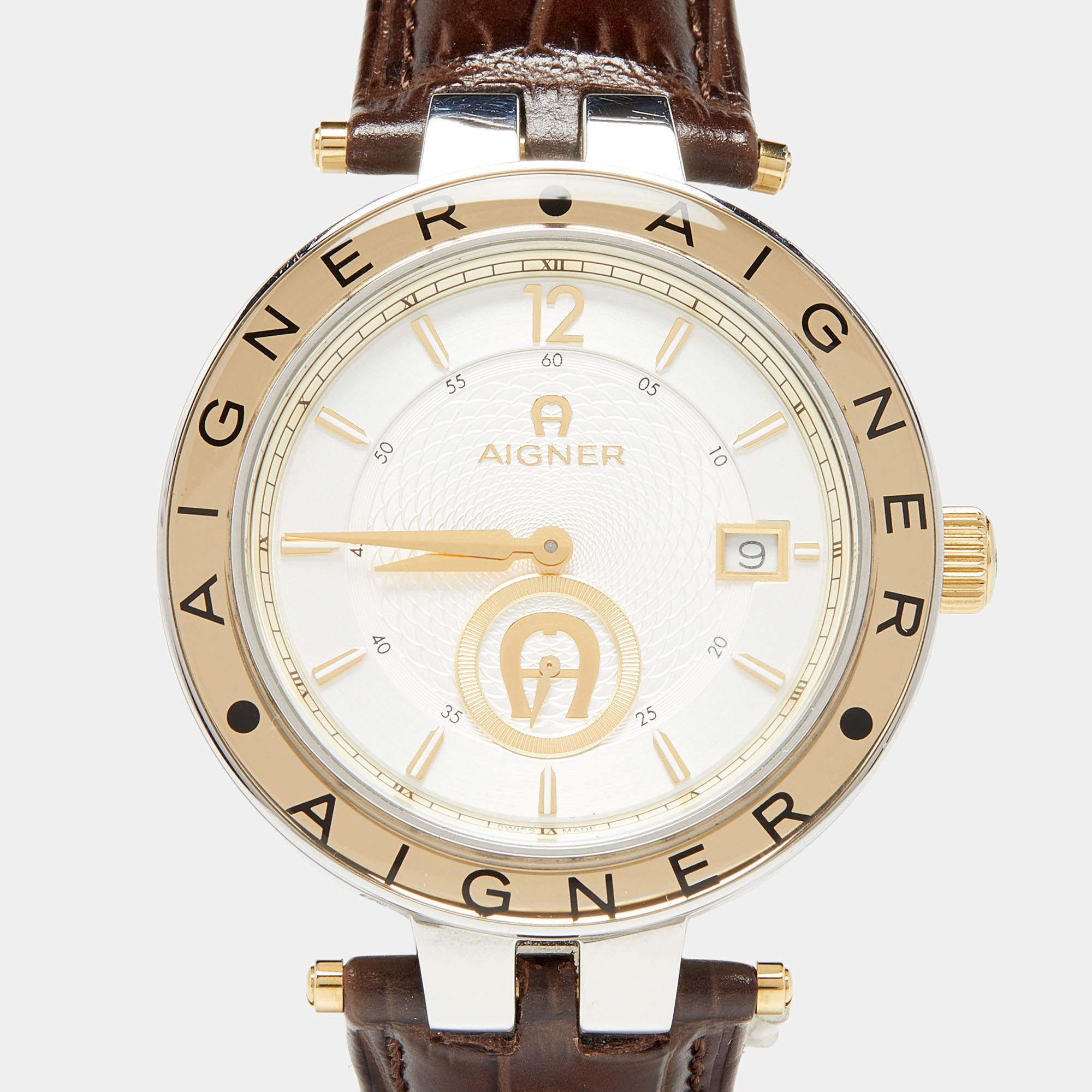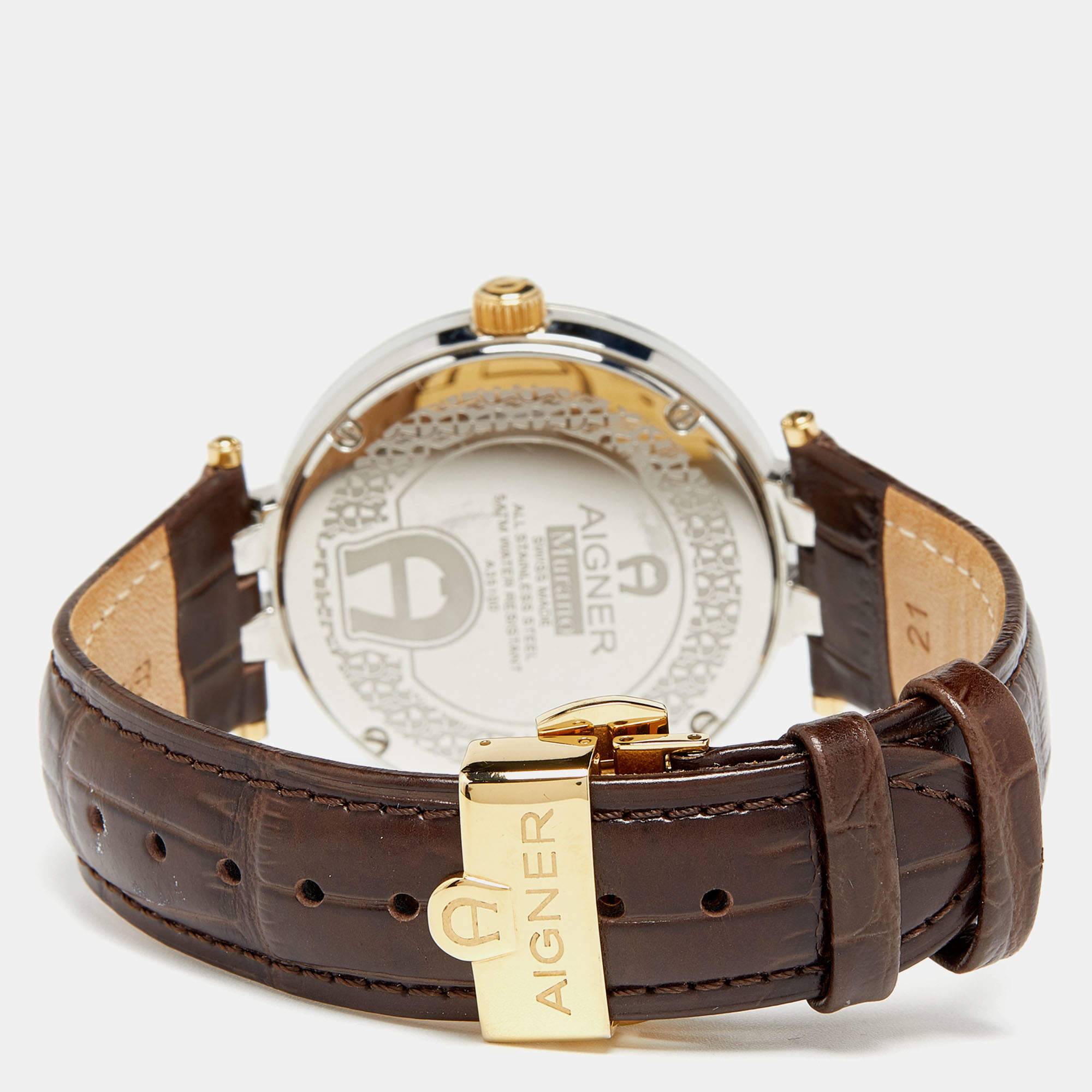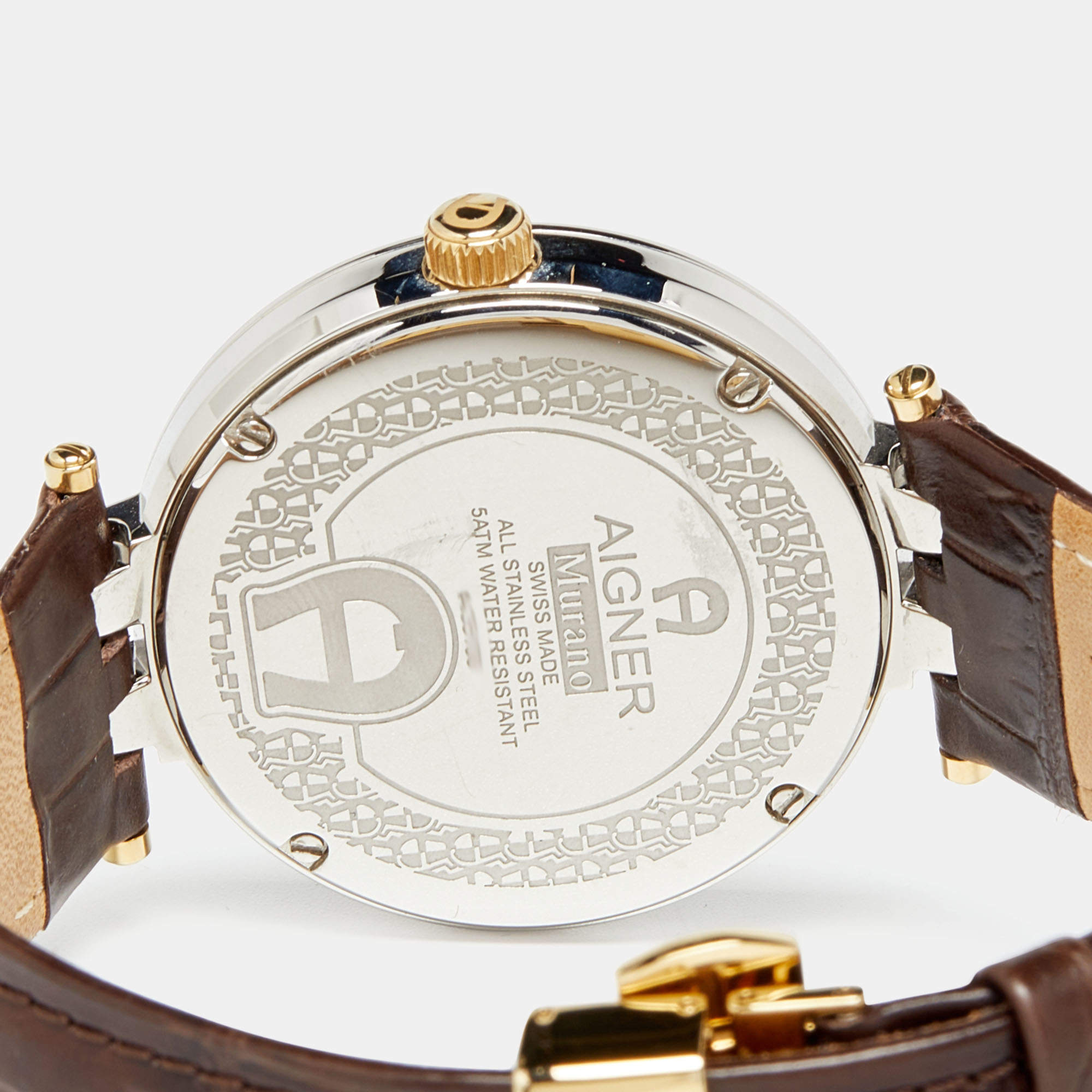 Designed with a fine blend of luxury and craftsmanship, this Murano watch from Aigner is sure to delight your style. It features a two-tone stainless steel case that has a diameter of 40 mm and the dial boasts Arabic Numeral and index hour markers, two hands, and a date window at the 3 o'clock position. The case is held by brown leather straps that fasten with the help of a tang buckle. This quartz timepiece is equipped with a water resistance of 50 meters and will prove to be an amazing buy!
