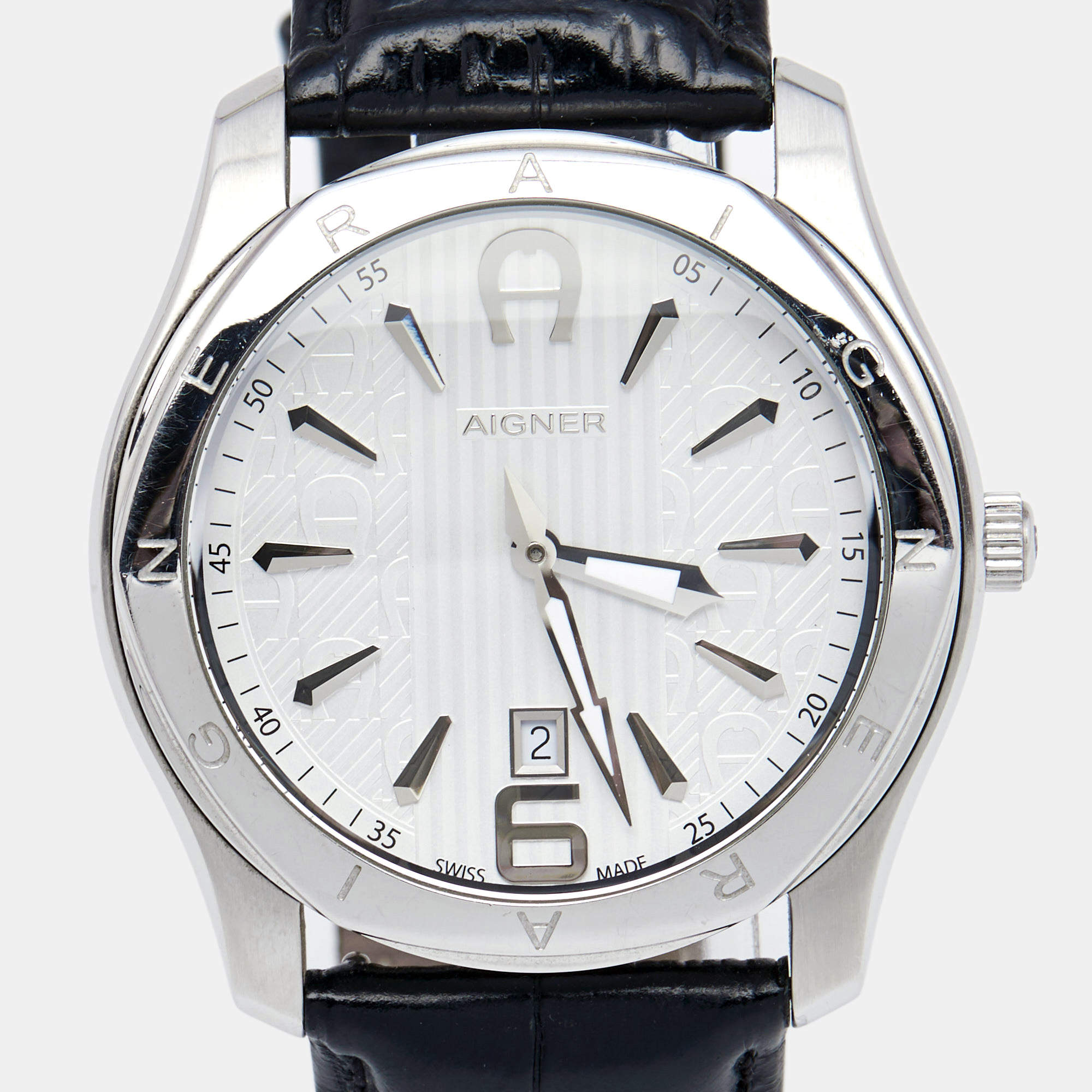 A timepiece for everyday wear, this beauty by Aigner is made to tell the time in the most efficient way. The watch is made of stainless steel and held by a leather bracelet. The silver dial is set with steel markers, a date window, and two hands. On the bezel, there are engravings of the brand name for an unmissable impression.