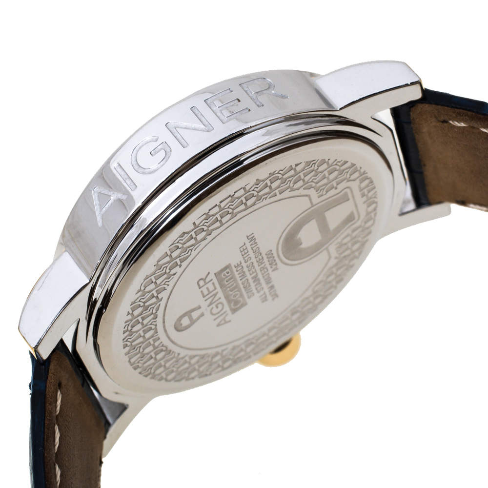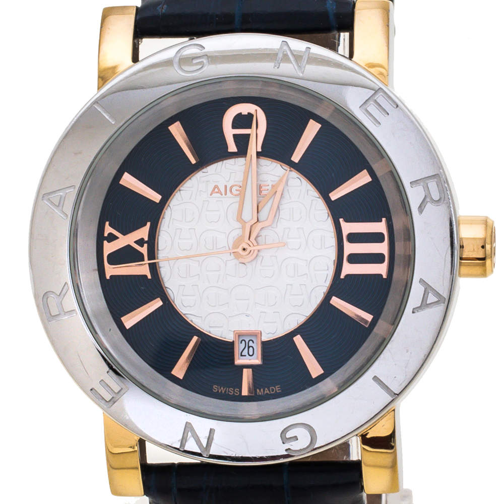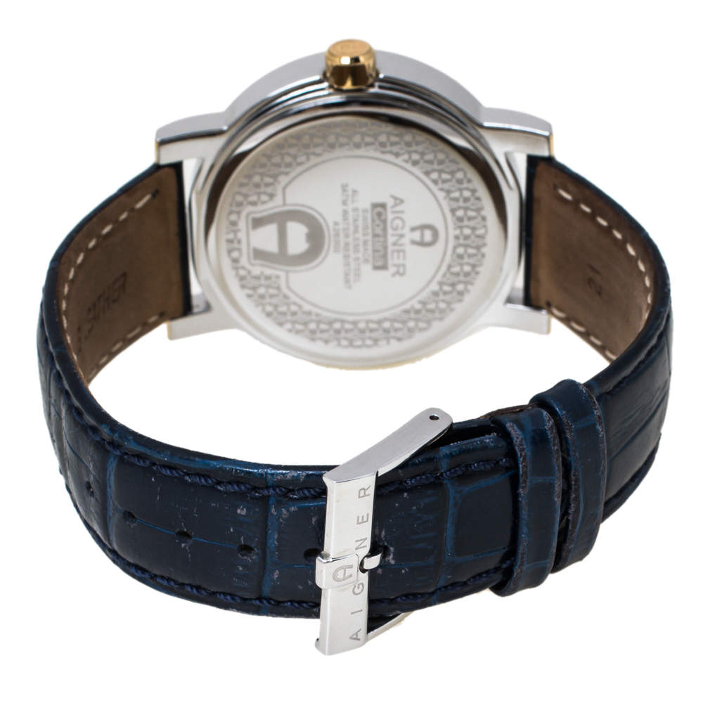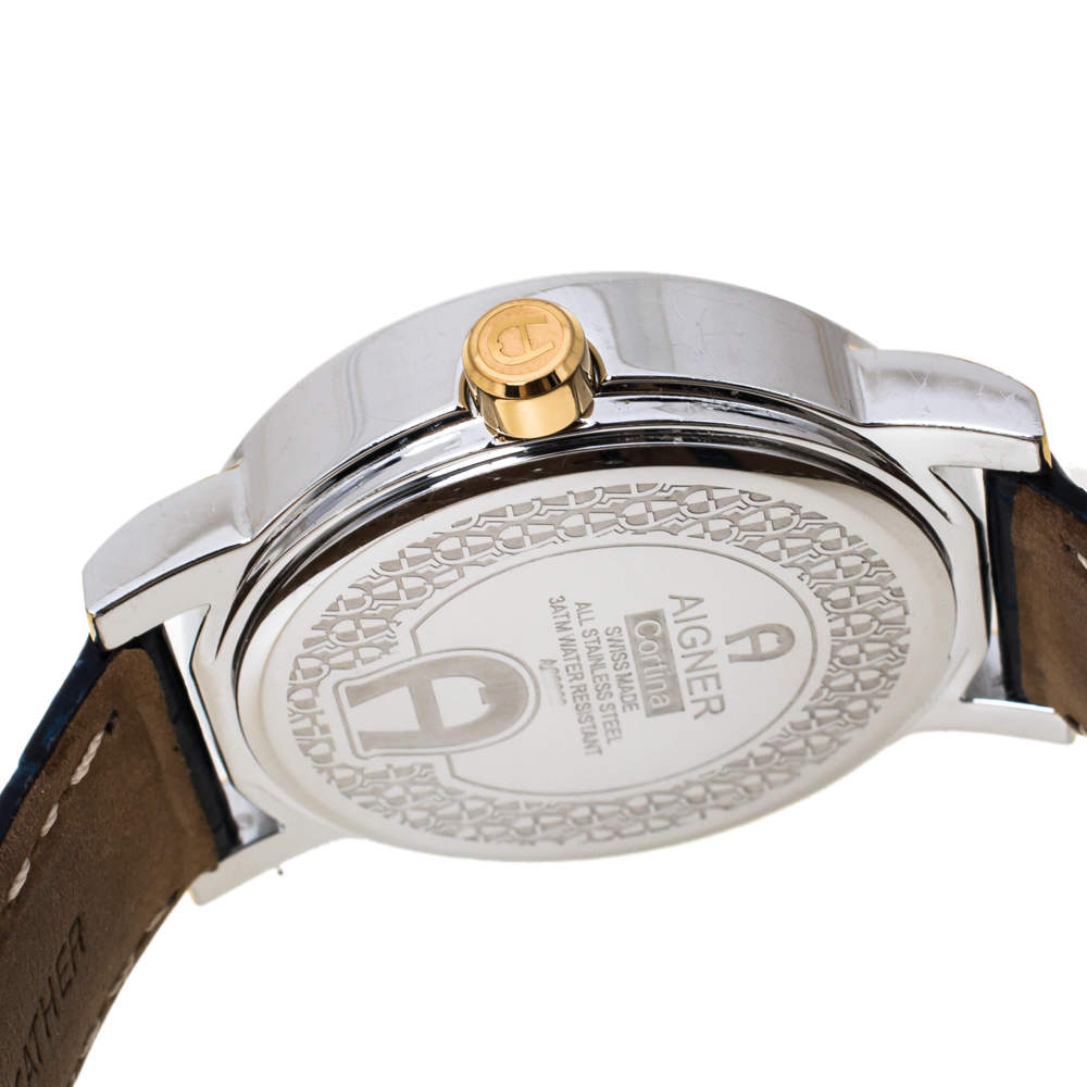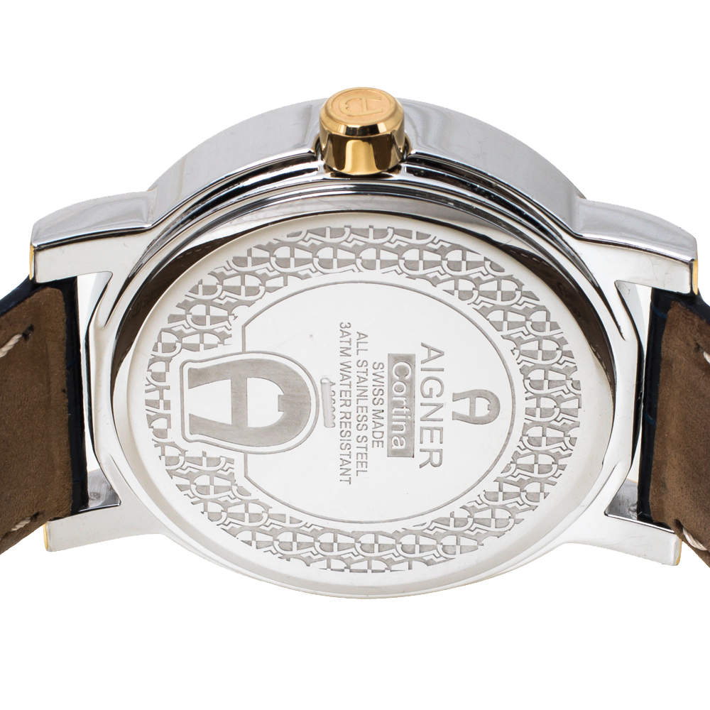 Characterized by a classic design, this wristwatch from the house of Aigner has a stylish finish. Elegantly crafted from two-tone stainless steel and held by black leather straps, this timepiece has an engraved bezel and a dial housing gold-tone markers and a date window. This Cortina watch is powered by quartz movement.