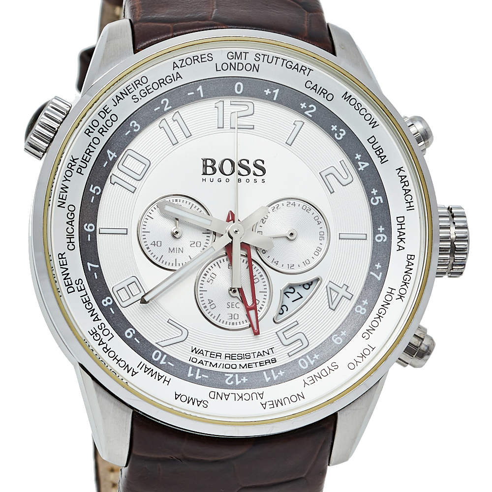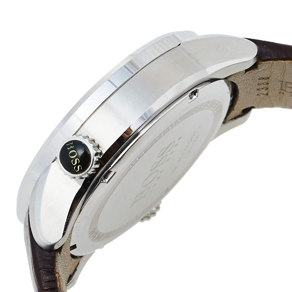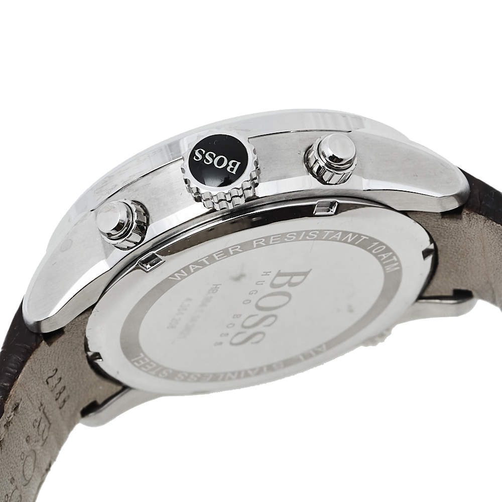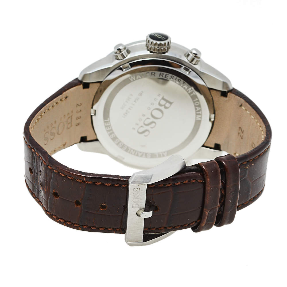 This Hugo Boss watch comes in a delighting gathering of the finest features. It has been wonderfully crafted from stainless steel and elevated with a well-designed dial. The dial has Arabic numeral and index hour markers, three subdials, and a date window. Lastly, the Chronograph creation is topped by a water resistance of 100 meters and held by a leather bracelet with a buckle fastening.