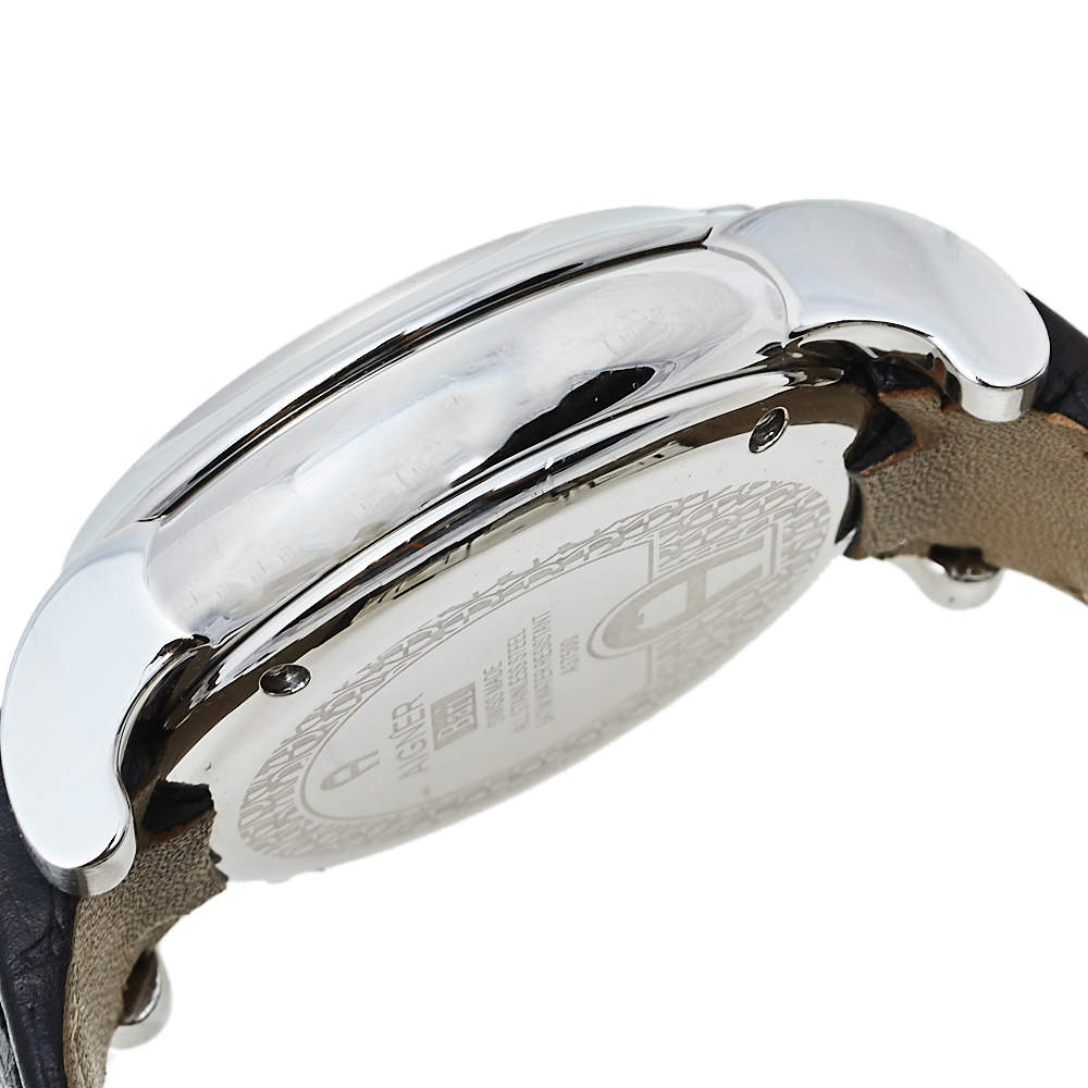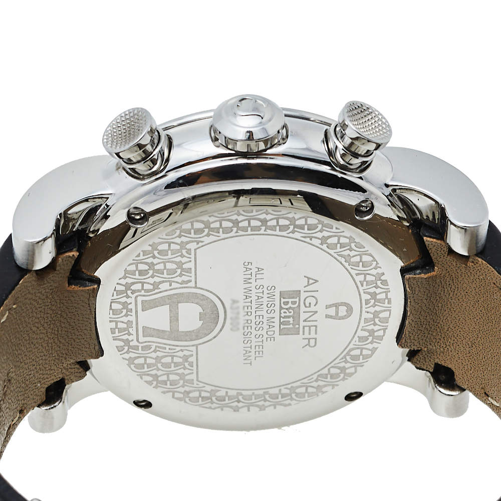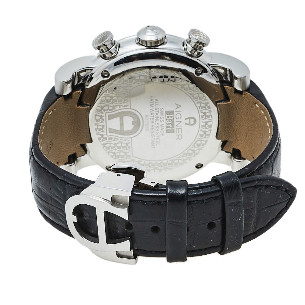 Aigner wristwatch is crafted from stainless steel with a case diameter of 44mm. It features a bulky and muscular case with a rounded silver dial detailed with silver-tone band label accents. It comes with two subdials, luminous hands, and a ta date window at the six o'clock position. It comes fitted with a leather strap and secured with buckle closure.