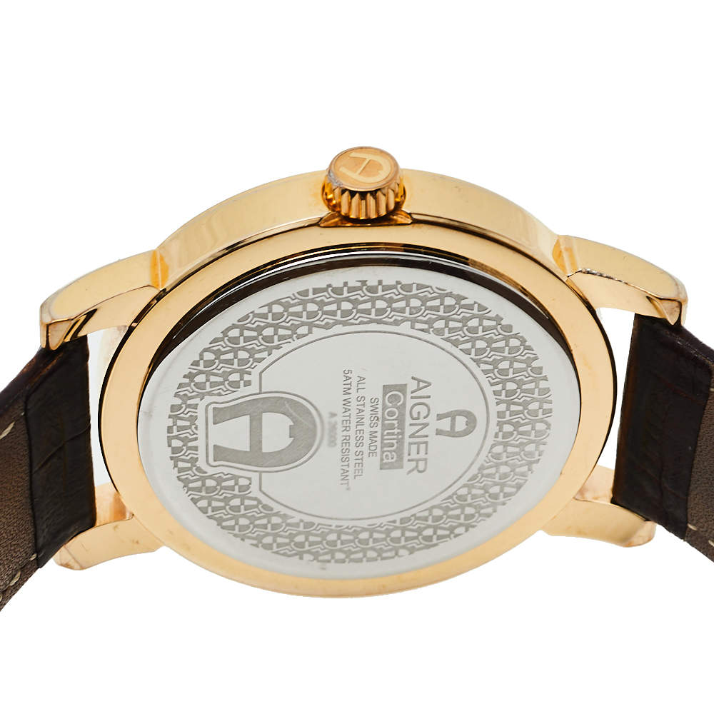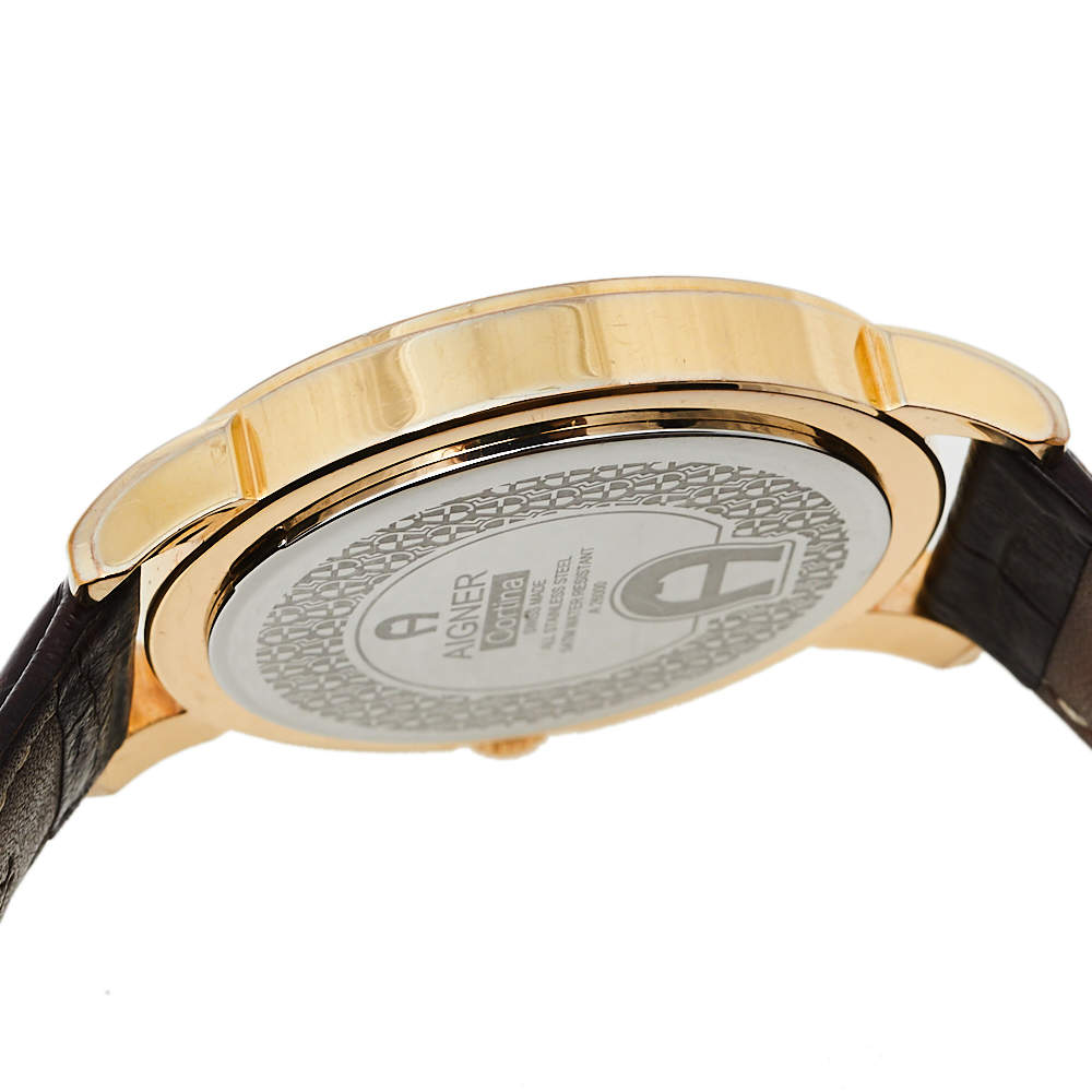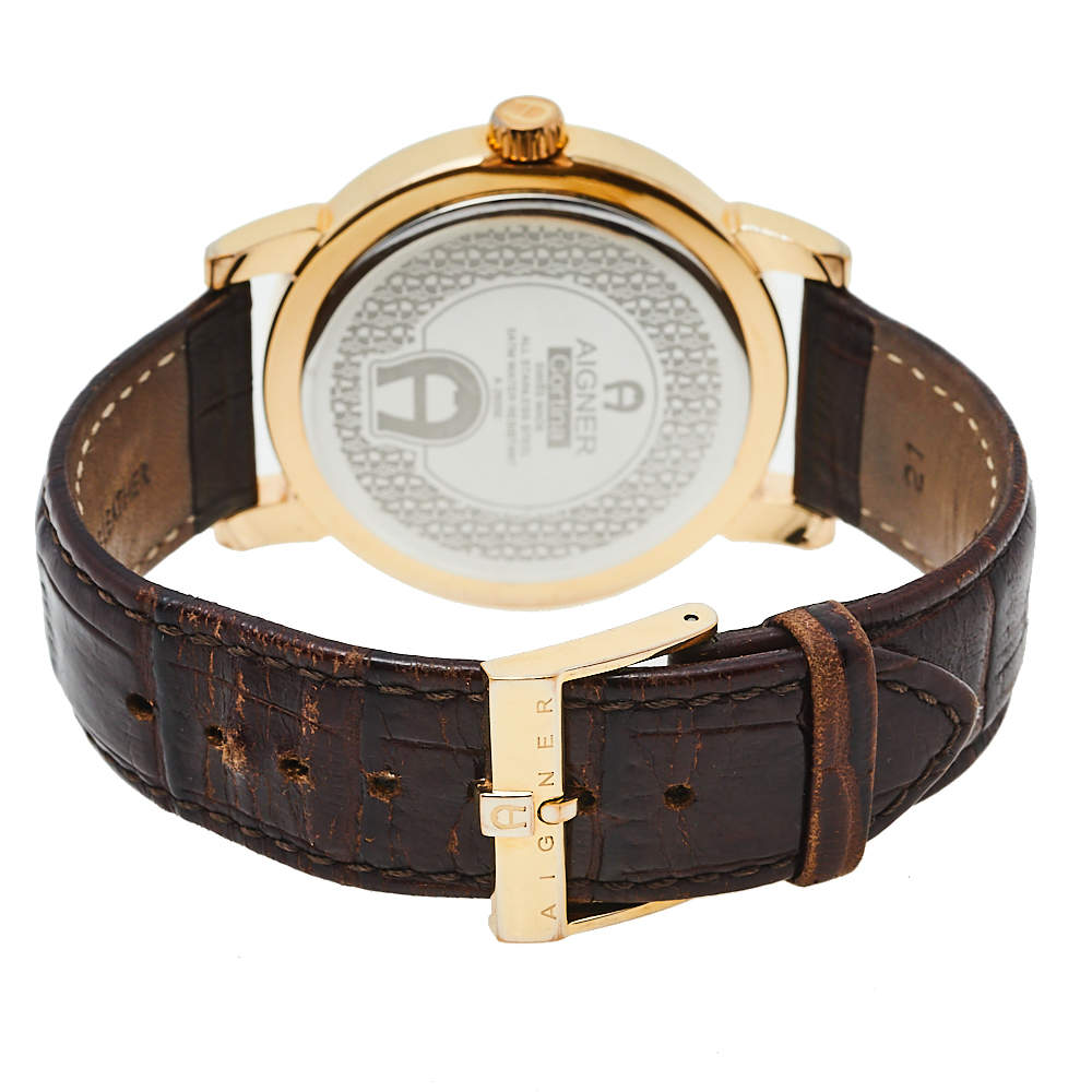 Aigner is considered the first voguish brand for stylish living from Germany. This gold-tone stainless steel wristwatch by Aigner is a fashionable example of the aforementioned. The watch features an engraved bezel, a silver dial, and a leather bracelet. Save yours for off-duty looks.