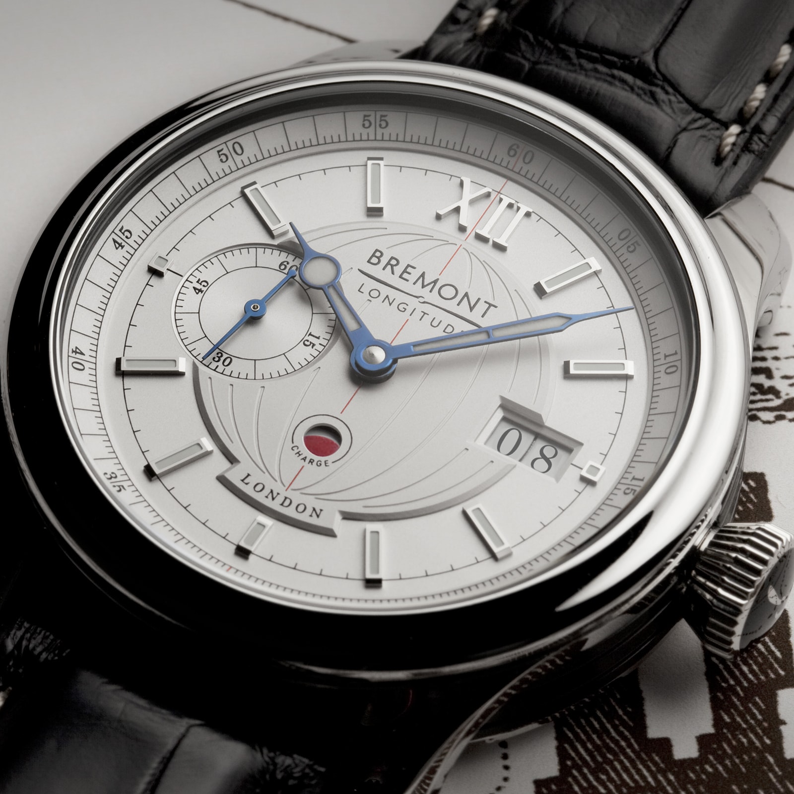 This is a new and unworn watch Paying tribute to Britains contribution to the fields of time, astronomy, and navigation, this limited edition collection represents a new era in British watchmaking. This unique model incorporates brass used in the historic Flamsteed Meridian Line at the Royal Observatory in Greenwich, which marks the line where John Flamsteed, the first Astronomer Royal, laid the ground-breaking foundations for accurate timekeeping and navigation. Housed within a 40mm, polished 18K white gold Trip-Tick® case, this timepiece is driven by the first manufactured movement from the new ENG300 movement series the 22 jewelled ENG376. The white metal dial references developments in time and navigation, with a raised central globe with debossed longitude lines, a Meridian line running from 12 oclock to 6 oclock, and a power reserve indicator coloured red in a nod to the red ball at the top of the Royal Observatory building. A 65-hour power reserve and water resistance to 5 bar (50 metres) further enhance performance. A black alligator leather strap completes the classic look.