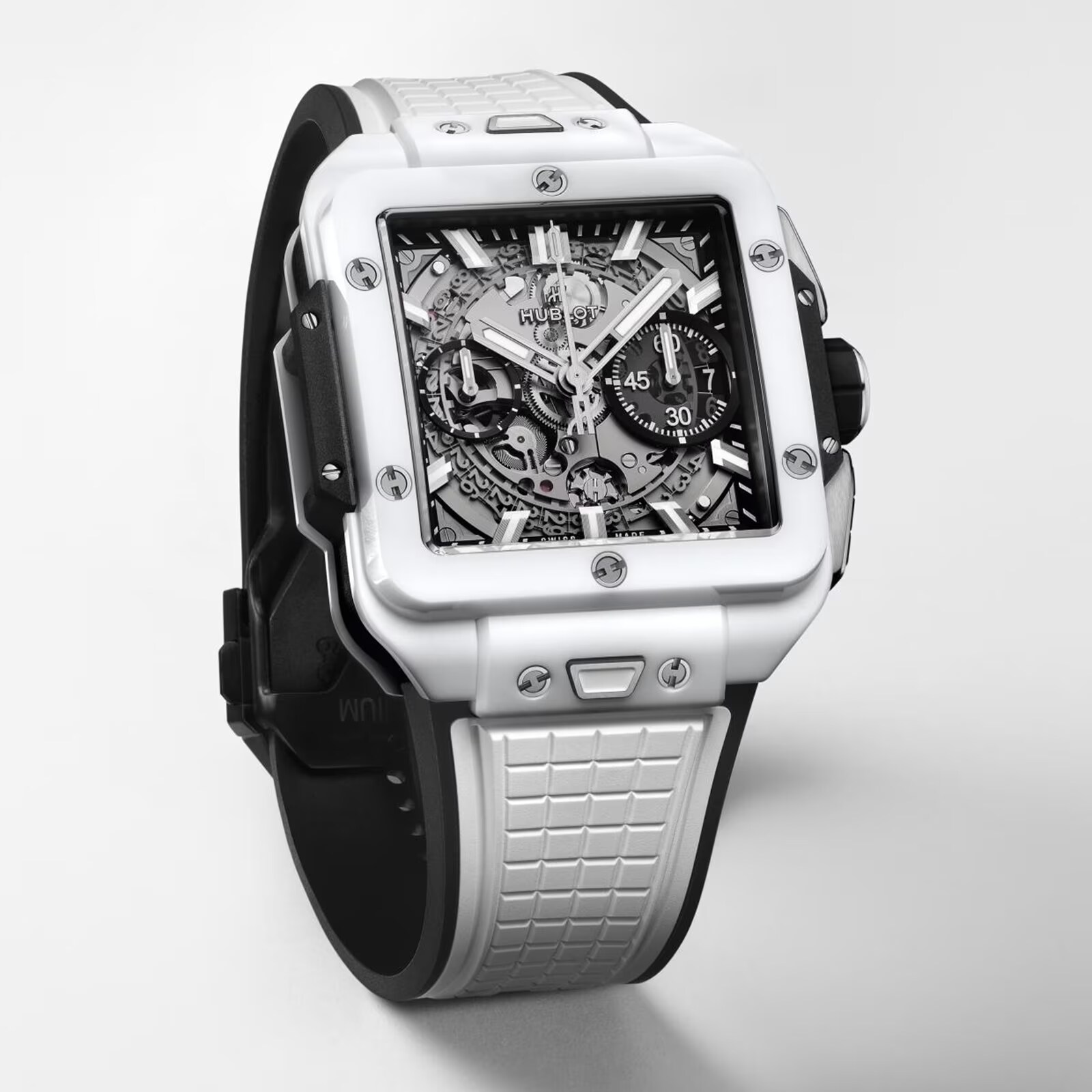 This is a new and unworn watch The Square Bang collection is characterised by its new, disruptive and unconventional shape, representing an evolution of the brands DNA and literally squaring the circle of the iconic port hole shape. This Square Bang Unico model features the Unico 2 calibre, designed to equip smaller chronographs with the power of the original movement. Thanks to technical optimisations, the movement has been reduced by 1.3mm in thickness, while still retaining key features such as a double coupling system, which can be viewed from the side of the dial, as well as a 72-hour power reserve. Designed to move with precision, this eye-catching model makes an instant impact with a sapphire crystal square skeleton dial, featuring two chronograph sub-dials. Presented in a 42mm microblasted and polished white ceramic case, framed by a co-ordinating bezel, this timepiece is secured with a white and black structured rubber strap. Powered by the in-house HUB1280 UNICO manufacture self-winding chronograph flyback movement, further functionality is offered by the 72-hour power reserve and water resistance to 10 bar (100 metres).
