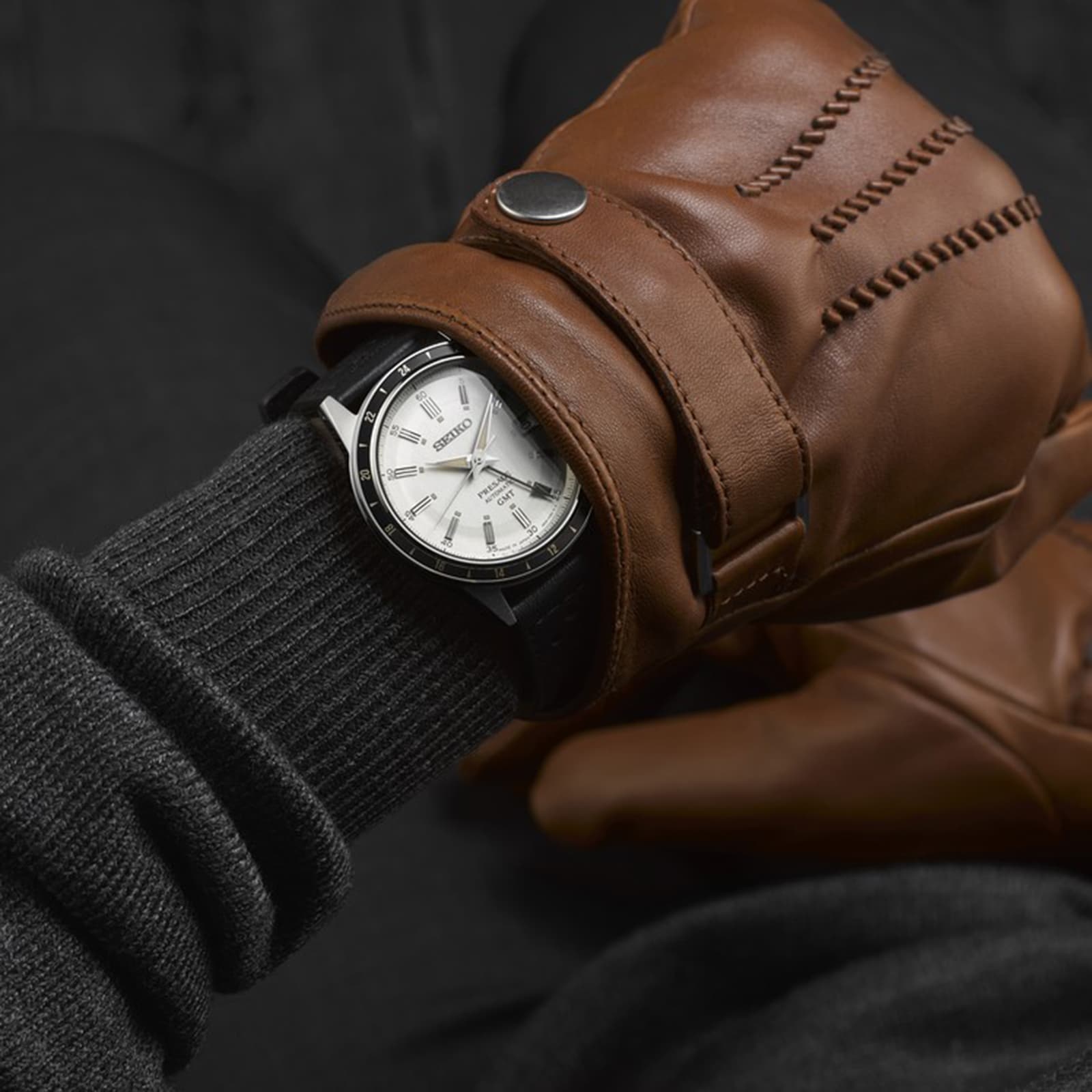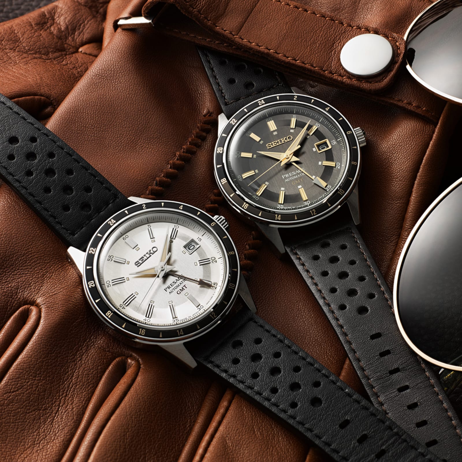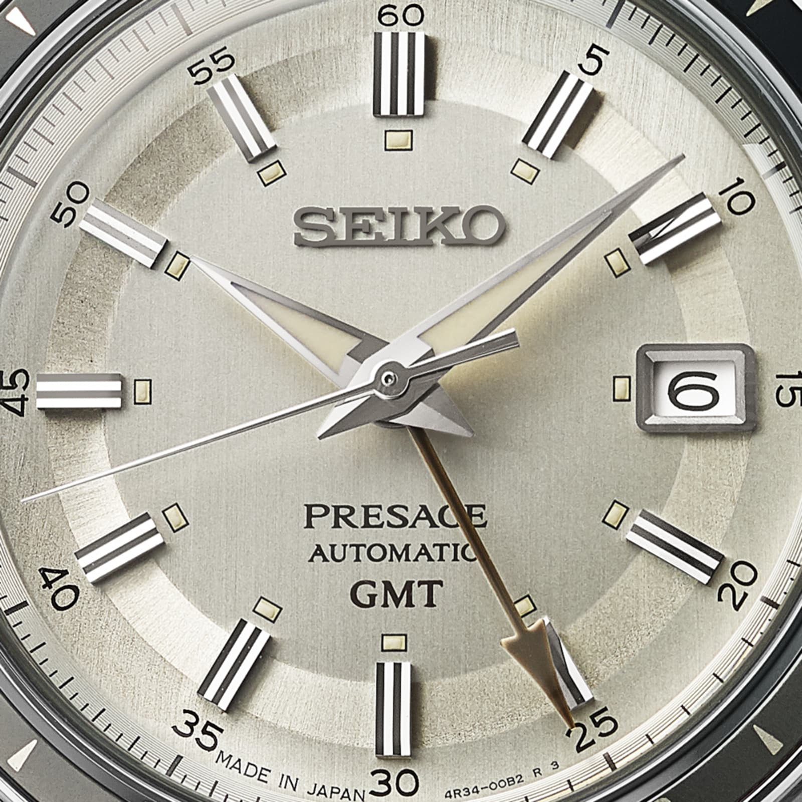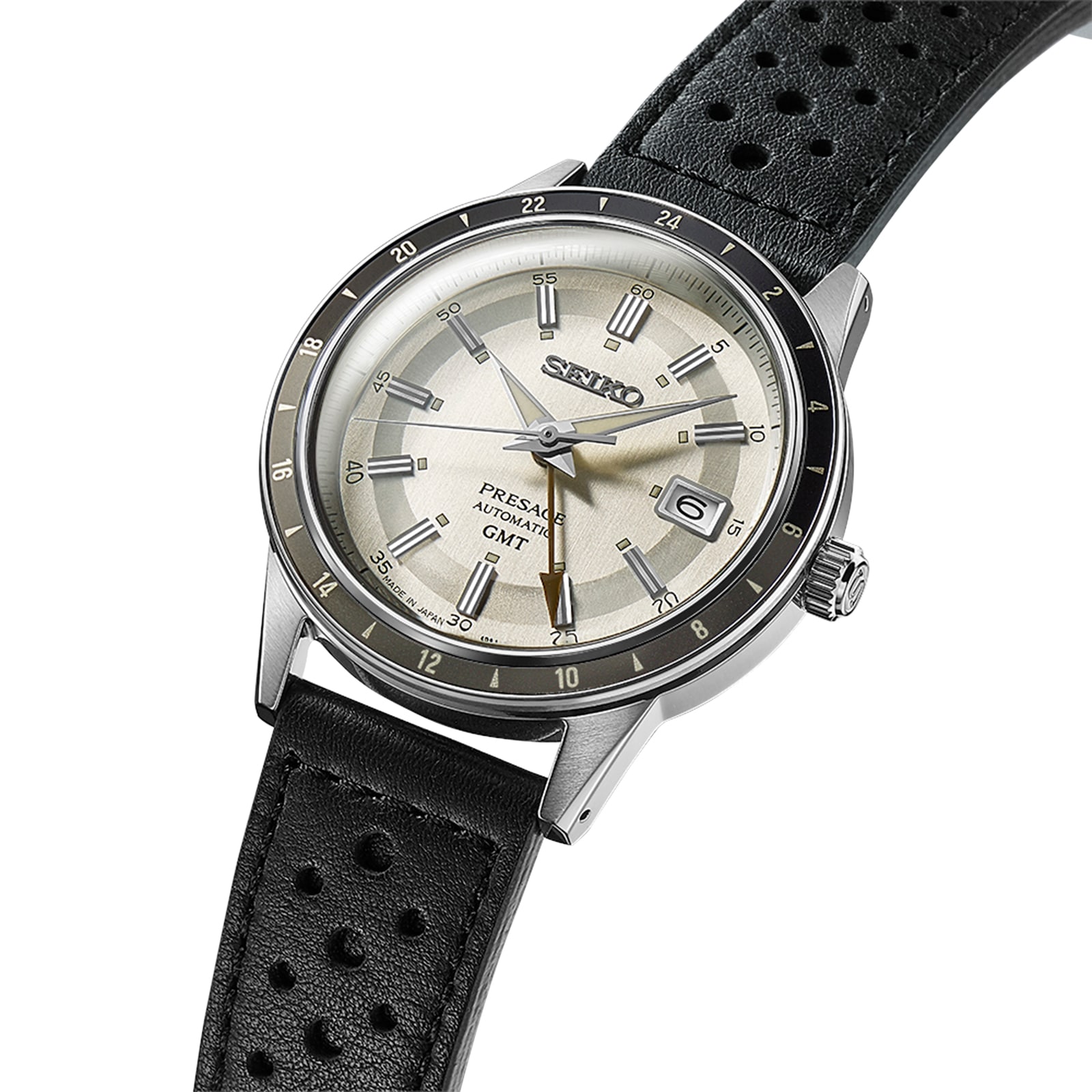 The essence of the Seiko Presage Style 60s collection is vintage style, which continues with the ‘road trip’ theme of this model, inspired by the iconic 1960s cars; their wheels, levers and instruments and colour scheme. Its hairline finishing gives it a machine-like feel, whilst the new GMT dial layout incorporates the details of the original Seiko 1964 crown chronograph.This 'stone' colour design operates on a 4R34 mechanical calibre movement, and has a GMT function, allowing multiple timezones to be tracked at the same time.Seiko Presage: Timeless looks, precisely Japanese mechanical timekeeping.Minimalistic watch designs with a distinctly Japanese aesthetic.