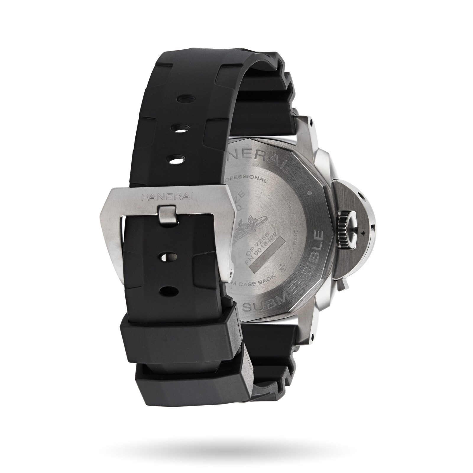 This is a new and unworn watch An invisible but revolutionary innovation, resulting from Panerai's continuos research into design and new materials: the first mechanical watch whose case is made of BMG-TECH™. The disordered structure of BMG-TECH™ is the secret to its great robustness and extreme resistance to corrosion, external shocks and magnetic fields, and enables it to preserve its appearance over time. TECHNICAL DETAILS MovementAutomatic mechanical, P.9010 calibre, executed entirely by Panerai, 13¾ lignes, 6.0 mm thick, 31 jewels, Glucydur® balance, 28,800 alternations/hour. Incabloc® anti-shock device. Power reserve 3 days, two barrels. 200 components. FunctionsHours, minutes, small seconds, date Bezel(Protected as a trademark) BMG-Tech™. Anti - clockwise rotating bezel with graduated scale DialBlue with luminous hour markers and dots. Date at 3 o’clock, small seconds at 9 o’clock Water Resitance30 bar (~300 metres) StrapCaoutchouc Black, - Stitching, 26.0/22.0 Standard size