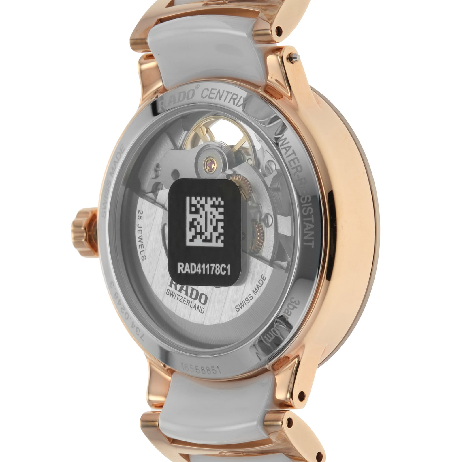 This is a new and unworn watch The popular Centrix collection proves its whats inside that counts with the Automatic Open Heart Diamonds offering a glimpse of the quality Swiss automatic movement inside and a glamorous sprinkling of diamonds on the cut out dial. With Rados signature sapphire crystal adding scratch-resistant shine, these watches are designed to look good for life Elegant, sophisticated and perfectly in tune with the latest timekeeping trends, the Rado Centrix collection proves that simple design has the ability to make a big impact. Featuring a striking mother-of-pearl open heart dial, this Rado Centrix watch is protected by sapphire crystal glass and enhanced by Rose Gold-tone hands and sparkling diamond dot hour markers. Housed by a durable 33mm stainless steel case and presented on a Rose Gold-tone PVD stainless steel bracelet with white ceramic accents, this stunning watch is sure to become a welcomed addition to your luxury watch collection. Water resistant up to 30 metres, this high-performance timepiece is driven by a reliable automatic movement. Discover the full Rado collection.