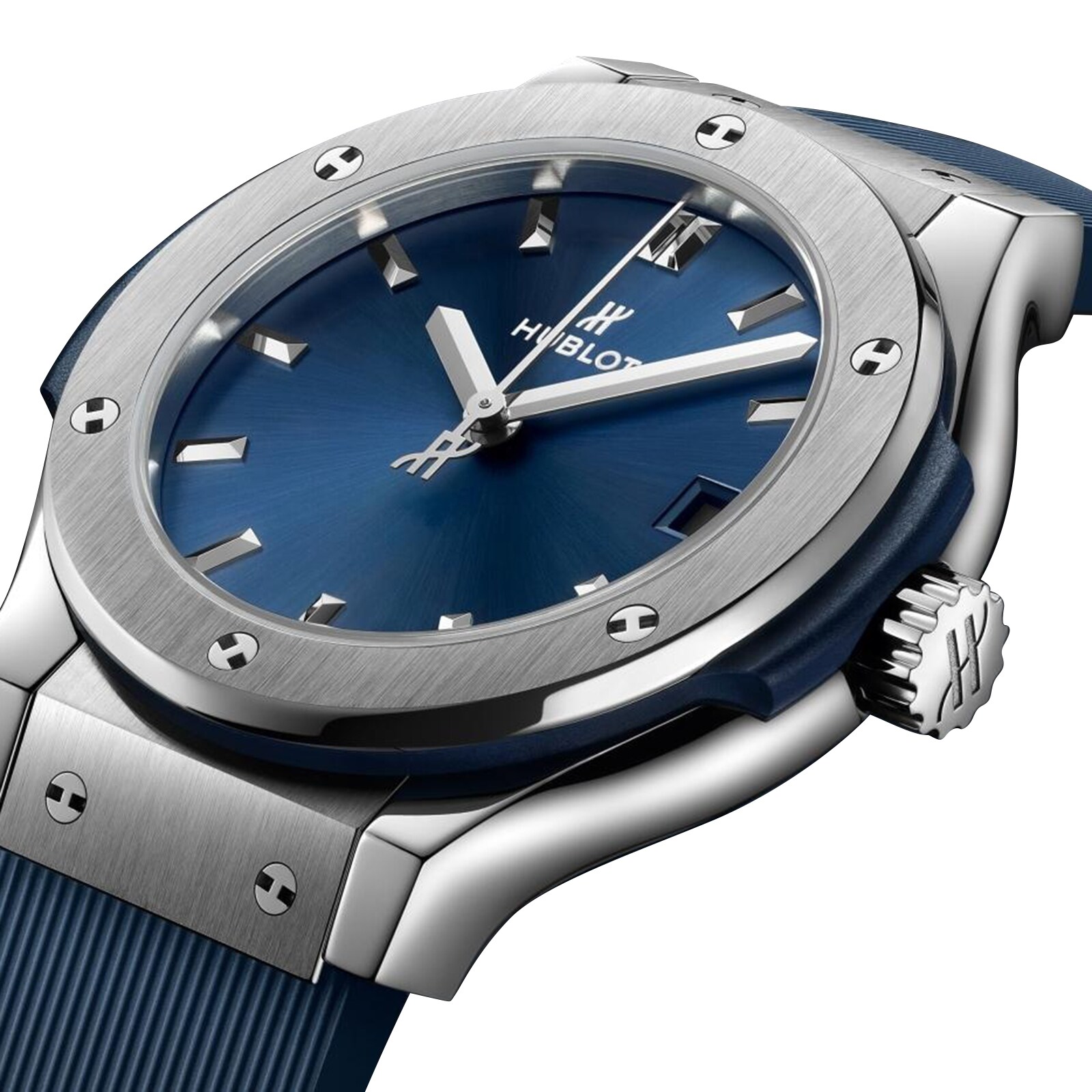This is an unworn watch (As New) This Pre-Owned Hublot Classic Fusion Titanium Blue Ladies Watch 581.NX.7170.RX features a 33mm titanium case, showcasing a blue dial and sapphire crystal glass. Powered by a quartz movement, this impressive watch also showcases a rubber strap . This watch is also water resistant to 50 metres. Condition - Unworn. Light wear may be present on the box.