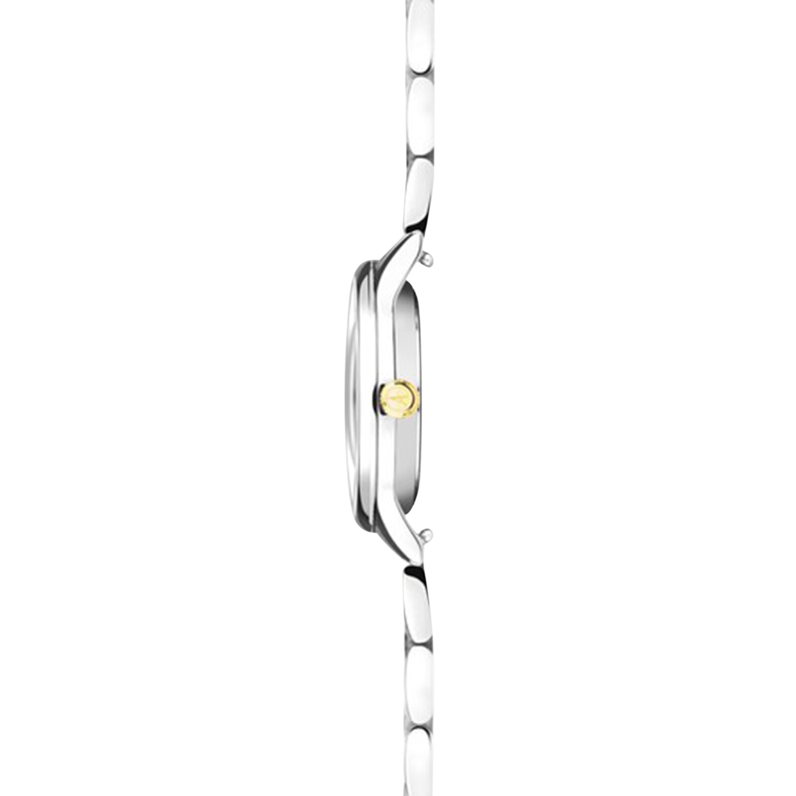 Adorn your wrist with precise elegance. Featuring diamonds and semi-precious materials, creating a flawless dress watch.This watch features a round, solid stainless steel case housing a white Mother-of-Pearl dial stone set with 12 diamonds as hour markers and enclosed by ultra scratch resistant, curved double sapphire crystal glass.Fastened with an interchangeable two tone, ion-plated silver and gold, solid stainless steel bracelet. This watch has an engravable case back and is water resistant up to 50 metres.Precision with elegance.