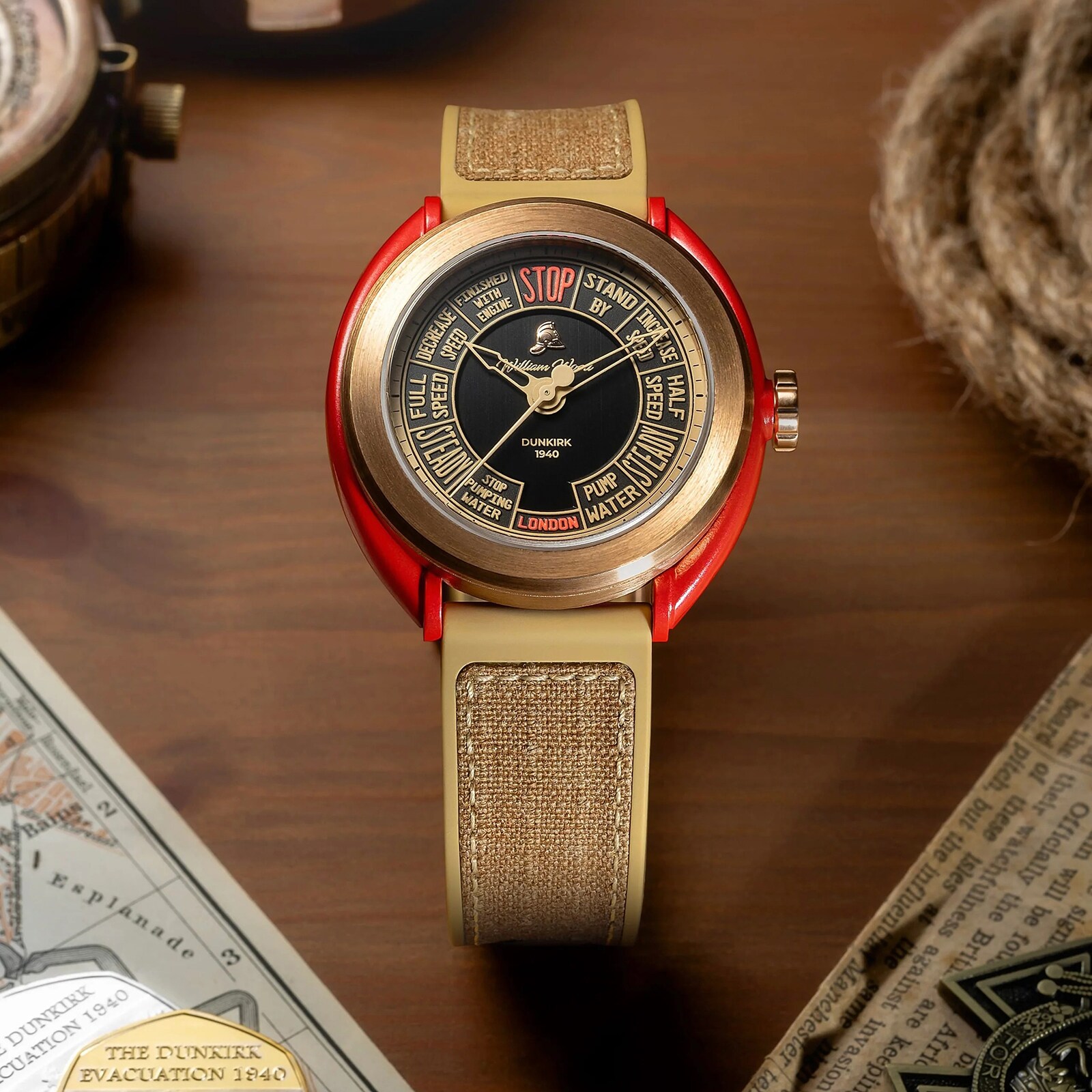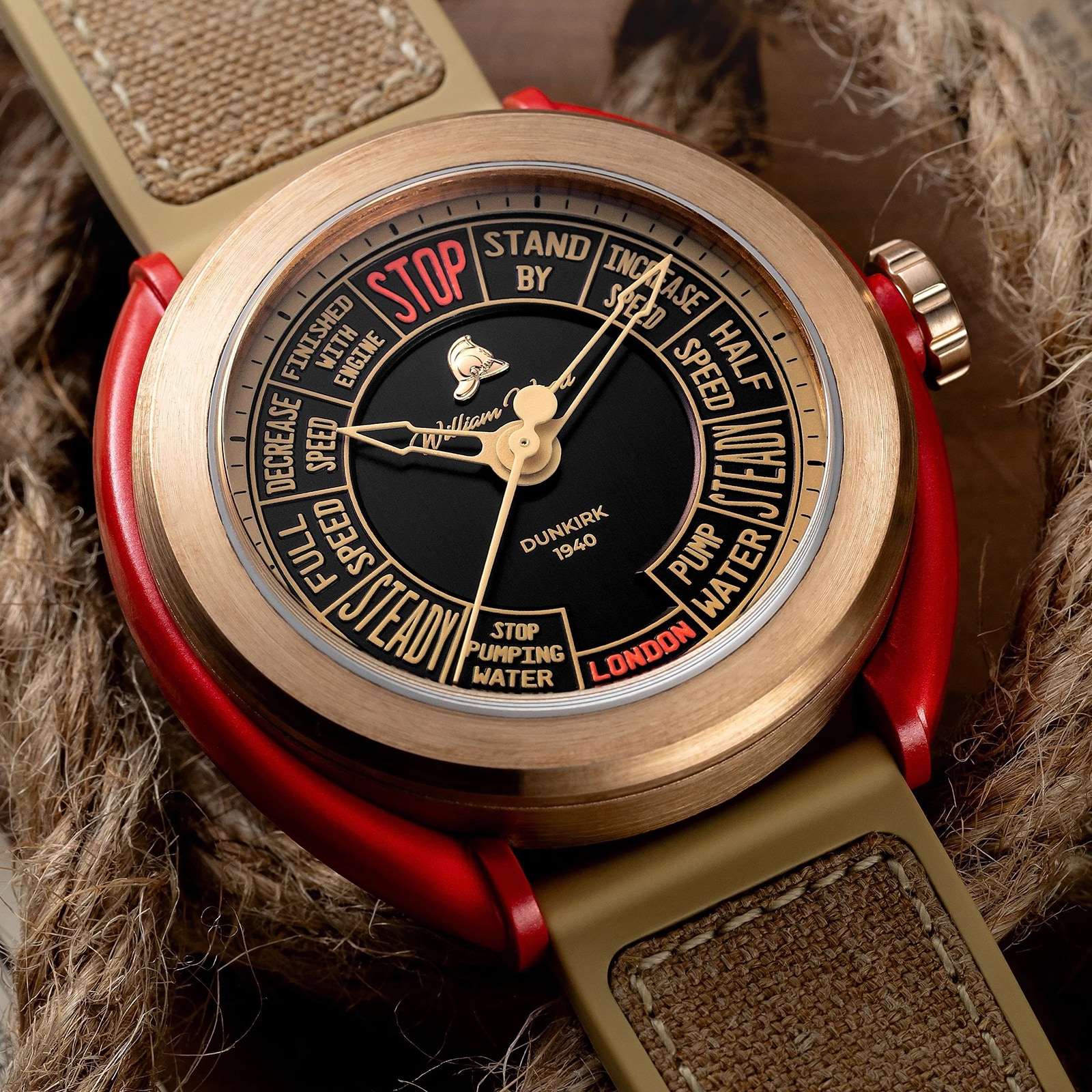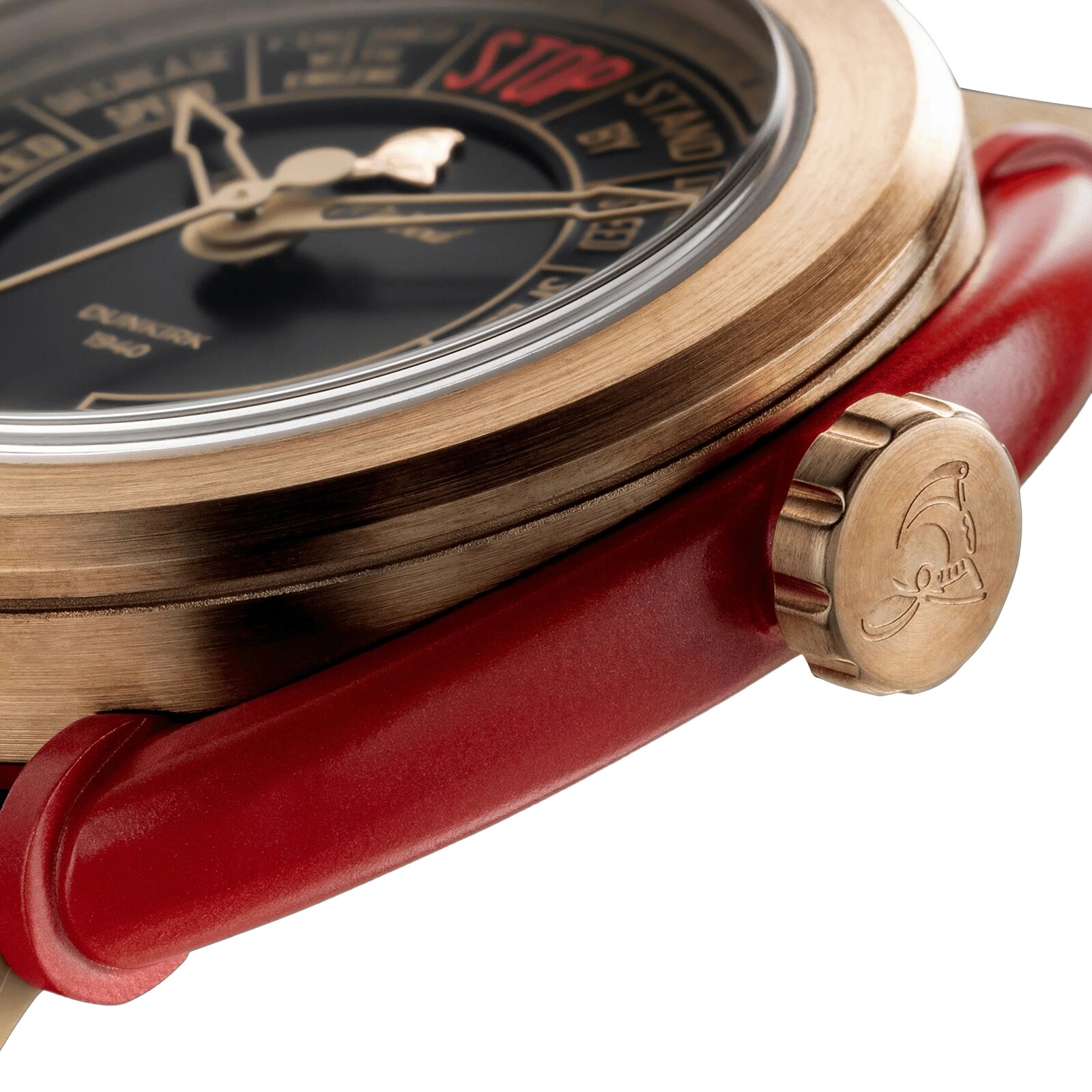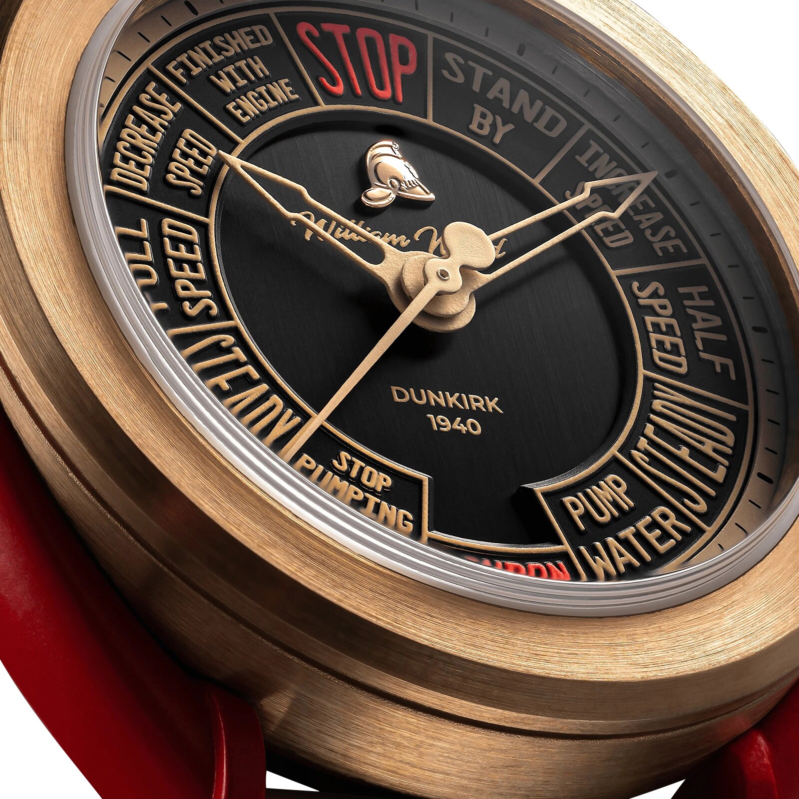Swiss-Made: Our new Dunkirk Watch is made in La Chaux-de-Fonds Switzerland. Movement Specifications: Swiss-Made Sellita Group SW220 Movement upgraded to the Premium Top Grade with the highest precision accuracy of +/-4 sec/day up to +/- 15 sec/day. The SW220 Premium Top Grade Movement has a 38 hour power reserve, 26 jewels accuracy and 28,800 beats per hour.  Become A Part Of History: Anyone who purchases a Dunkirk watch will have their name engraved onto a plaque on the boat that will sail over the channel in 2025 for the 80th year anniversary of the Dunkirk evacuation Case Measurements: The case measures 42mm in diameter, with a 13mm thickness and a lug width of 20mm. The watch wears as a medium to large size on an average wrist. Lug To Lug: Case Execution: Our case is finished in CuSn8 grade bronze with the sides and lugs executed with a brushed finish. Bronze will age and patina over time changing both colour and texture. The case can be brought back to looking brand new again by applying lemon juice. The side of the case is wrapped with red piping taken inspiration from the engine room of the Massey Shaw Boat. The back of our Dunkirk Watch has a matte black caseback ring featuring an illustration of the famous scene of Operation Dynamo on the beaches of Dunkirk back in 1940. Dial Design: The one-of-a-kind dial in bronze, black, and red was inspired by the unique twin telegraphs of the Massey Shaw, which are used to operate both the fire pumps and the main engines of the ship. The dial uses an aged champagne Super-LumiNova to look like a watch from the 1940's. Both STOP and LONDON illuminate on the dial in red to match the Massey telegraphs. Caseback Design: We Will Remember. A beautiful commemorative caseback features a scene of Dunkirk engraved on three-tone bronze, including soldiers waiting on the beach and the Little Boats. An original piece of the Massey Shaw engine used in the Dunkirk evacuation has been melted-down and poured into the silhouette of the Massey Shaw on the horizon of the caseback Operation Dynamo scene. Strap Measurements: Our fire gear and fire hose straps fit a wrist size between 5.5 and 9.5 inches. We do not currently offer straps for lug sizes outside of 20mm. Strap Execution: Our full range of watch straps have a 20mm lug width fitting all of our watch collections. Our upcycled fire gear and fire hose straps are finished with a silicon back that is stamped with ‘made from rescued materials’ and ‘William Wood’. All of our straps are fitted with quick-release levers allowing you to add and remove any of our straps without any additional tools required in just a few seconds. Water Resistance: For additional reduction in case thickness to 13mm we chose a water resistance of 50M / 5ATM International Warranty: Global Support: We have three repair centres based in the UK, USA and Asia, giving you international support if, and when required.