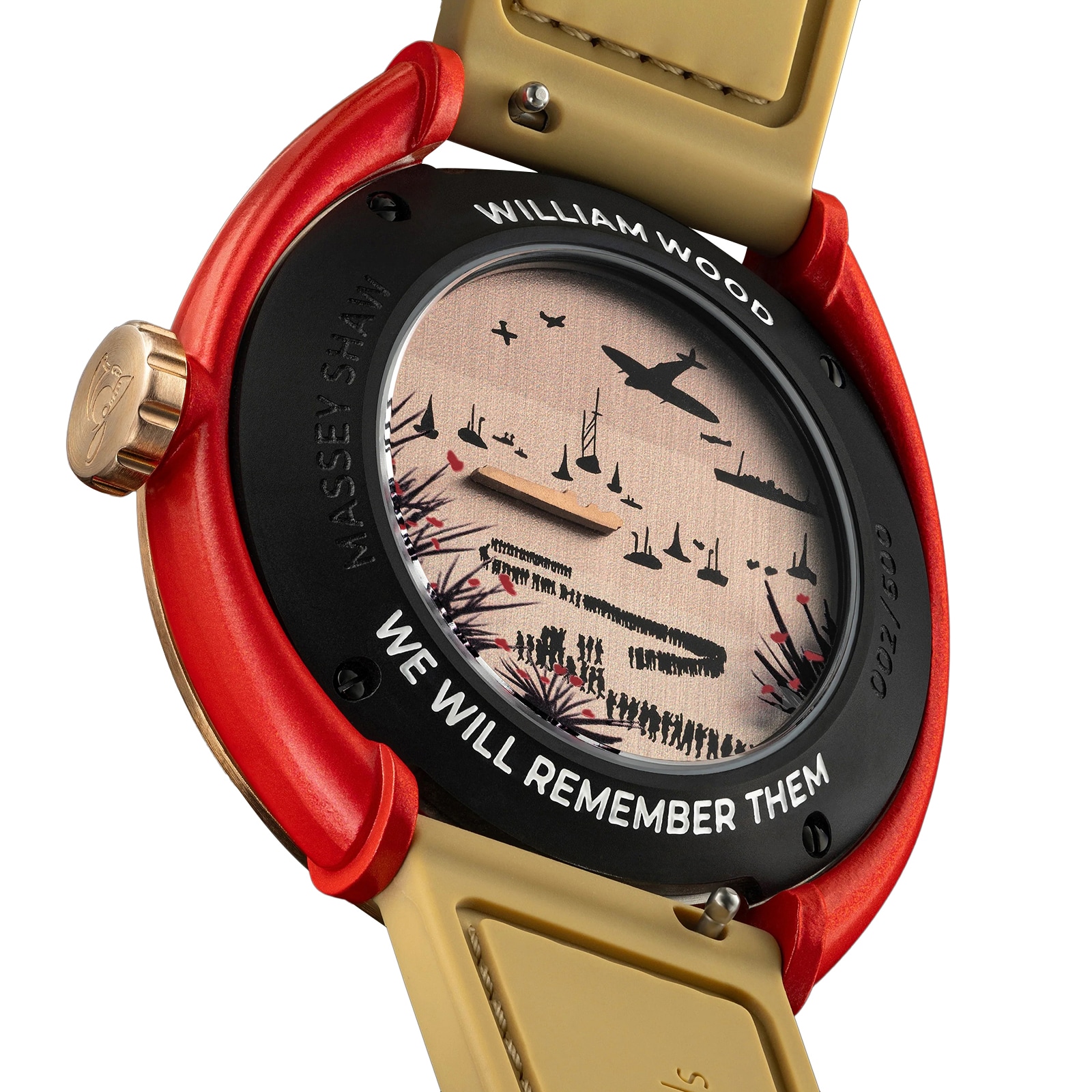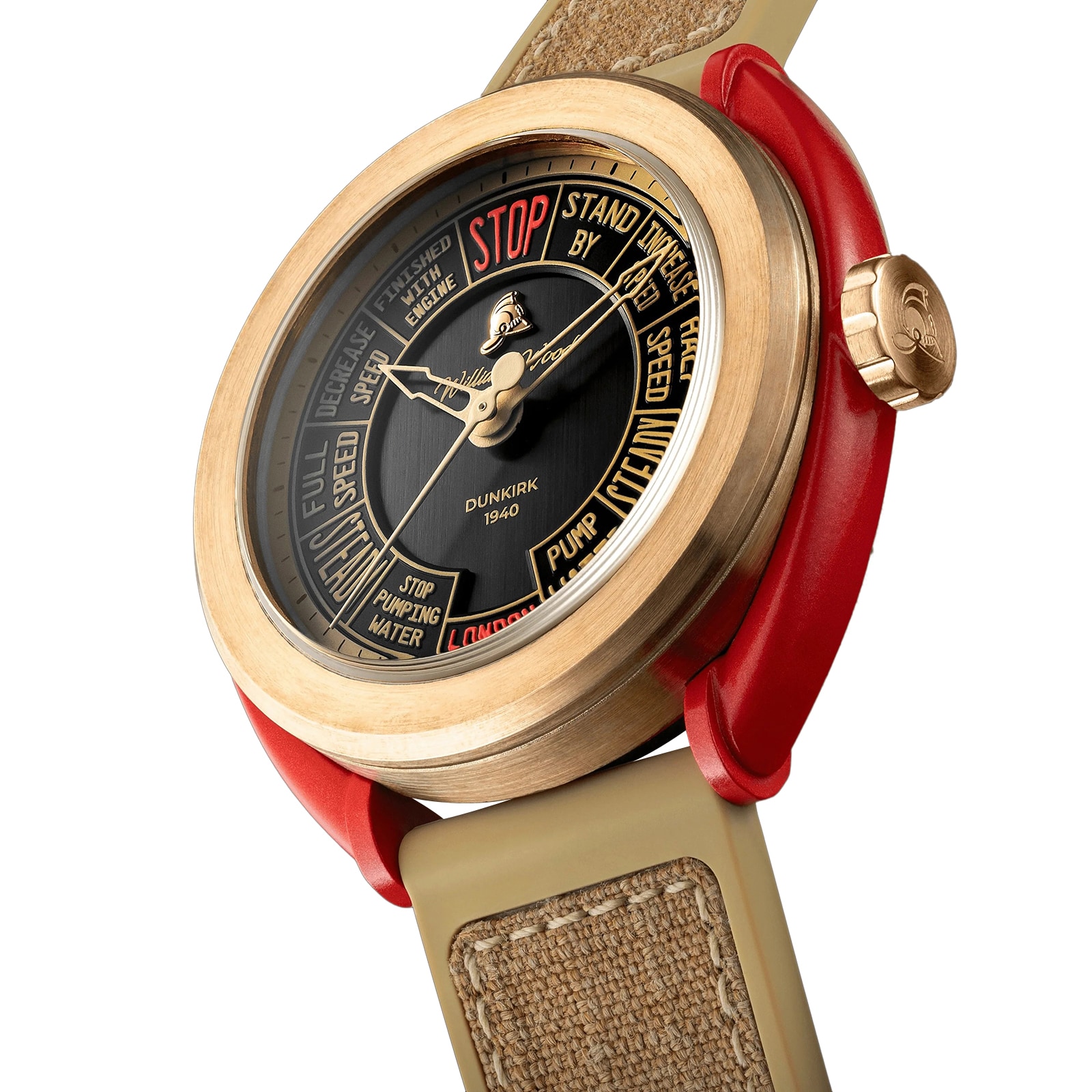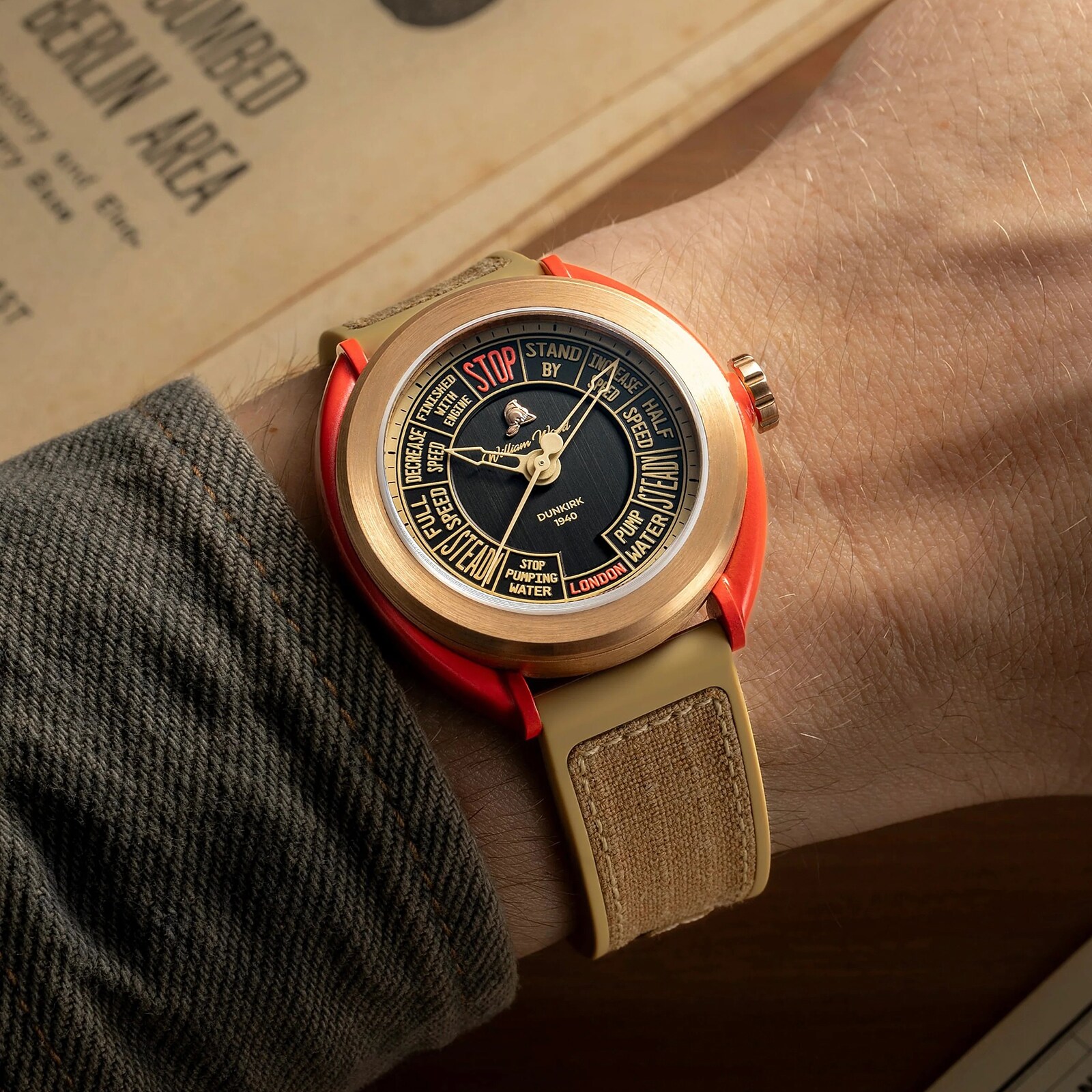 Swiss-Made: Our new Dunkirk Watch is made in La Chaux-de-Fonds Switzerland. Movement Specifications: Swiss-Made Sellita Group SW220 Movement upgraded to the Premium Top Grade with the highest precision accuracy of +/-4 sec/day up to +/- 15 sec/day. The SW220 Premium Top Grade Movement has a 38 hour power reserve, 26 jewels accuracy and 28,800 beats per hour.  Become A Part Of History: Anyone who purchases a Dunkirk watch will have their name engraved onto a plaque on the boat that will sail over the channel in 2025 for the 80th year anniversary of the Dunkirk evacuation Case Measurements: The case measures 42mm in diameter, with a 13mm thickness and a lug width of 20mm. The watch wears as a medium to large size on an average wrist. Lug To Lug: Case Execution: Our case is finished in CuSn8 grade bronze with the sides and lugs executed with a brushed finish. Bronze will age and patina over time changing both colour and texture. The case can be brought back to looking brand new again by applying lemon juice. The side of the case is wrapped with red piping taken inspiration from the engine room of the Massey Shaw Boat. The back of our Dunkirk Watch has a matte black caseback ring featuring an illustration of the famous scene of Operation Dynamo on the beaches of Dunkirk back in 1940. Dial Design: The one-of-a-kind dial in bronze, black, and red was inspired by the unique twin telegraphs of the Massey Shaw, which are used to operate both the fire pumps and the main engines of the ship. The dial uses an aged champagne Super-LumiNova to look like a watch from the 1940's. Both STOP and LONDON illuminate on the dial in red to match the Massey telegraphs. Caseback Design: We Will Remember. A beautiful commemorative caseback features a scene of Dunkirk engraved on three-tone bronze, including soldiers waiting on the beach and the Little Boats. An original piece of the Massey Shaw engine used in the Dunkirk evacuation has been melted-down and poured into the silhouette of the Massey Shaw on the horizon of the caseback Operation Dynamo scene. Strap Measurements: Our fire gear and fire hose straps fit a wrist size between 5.5 and 9.5 inches. We do not currently offer straps for lug sizes outside of 20mm. Strap Execution: Our full range of watch straps have a 20mm lug width fitting all of our watch collections. Our upcycled fire gear and fire hose straps are finished with a silicon back that is stamped with ‘made from rescued materials’ and ‘William Wood’. All of our straps are fitted with quick-release levers allowing you to add and remove any of our straps without any additional tools required in just a few seconds. Water Resistance: For additional reduction in case thickness to 13mm we chose a water resistance of 50M / 5ATM International Warranty: Global Support: We have three repair centres based in the UK, USA and Asia, giving you international support if, and when required.