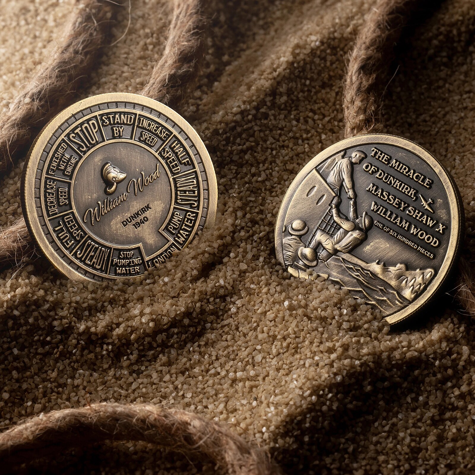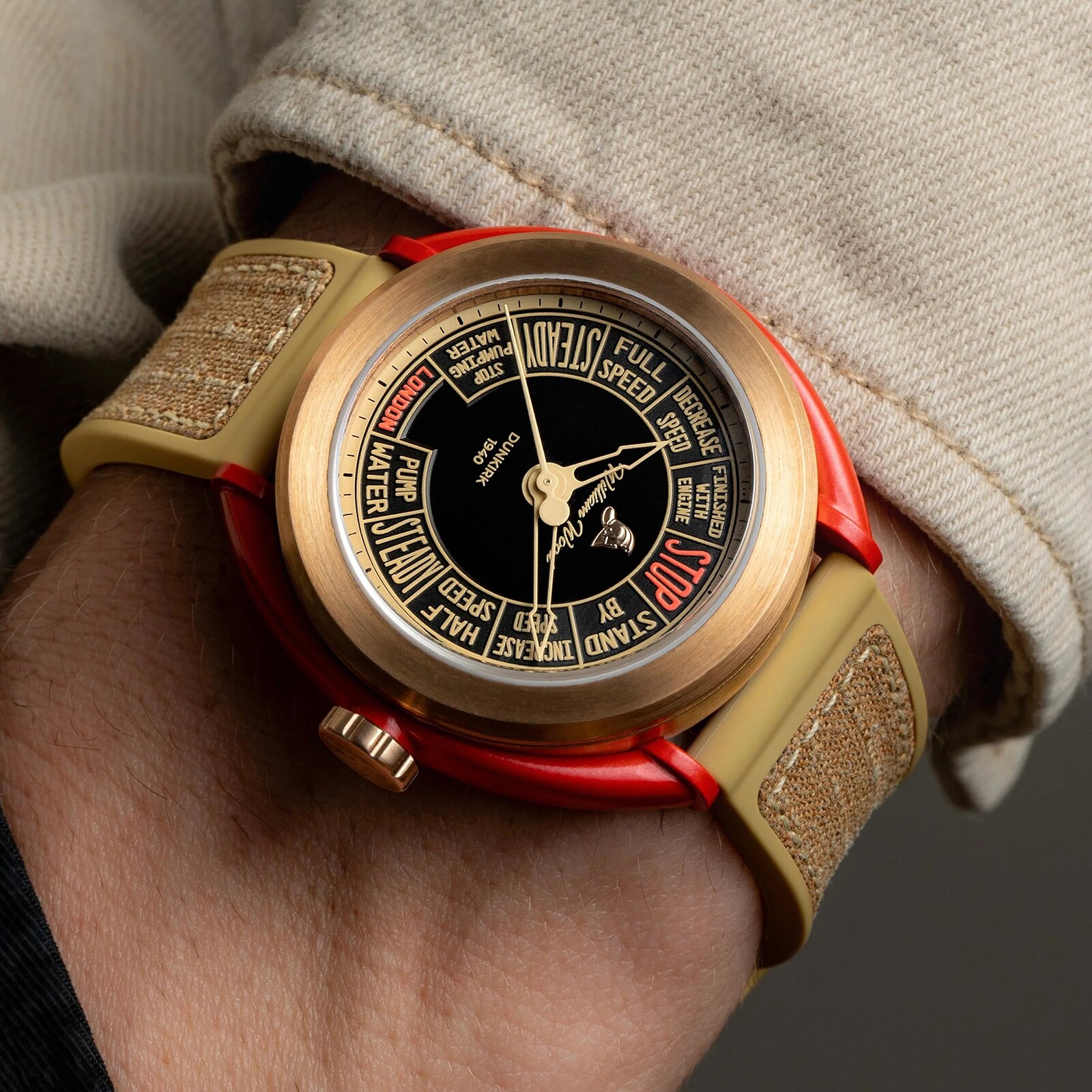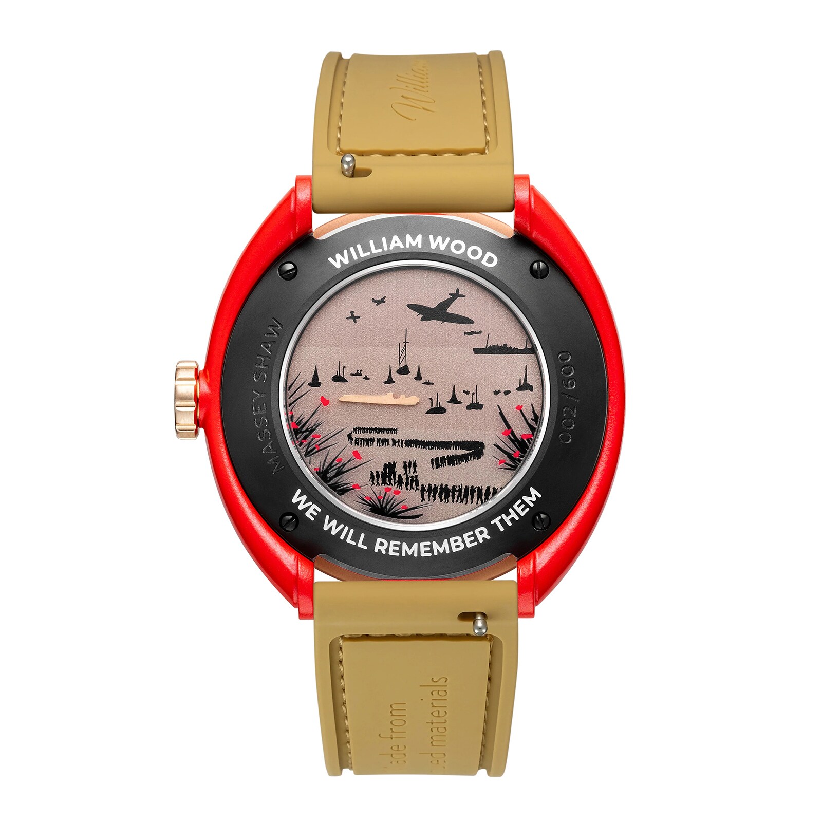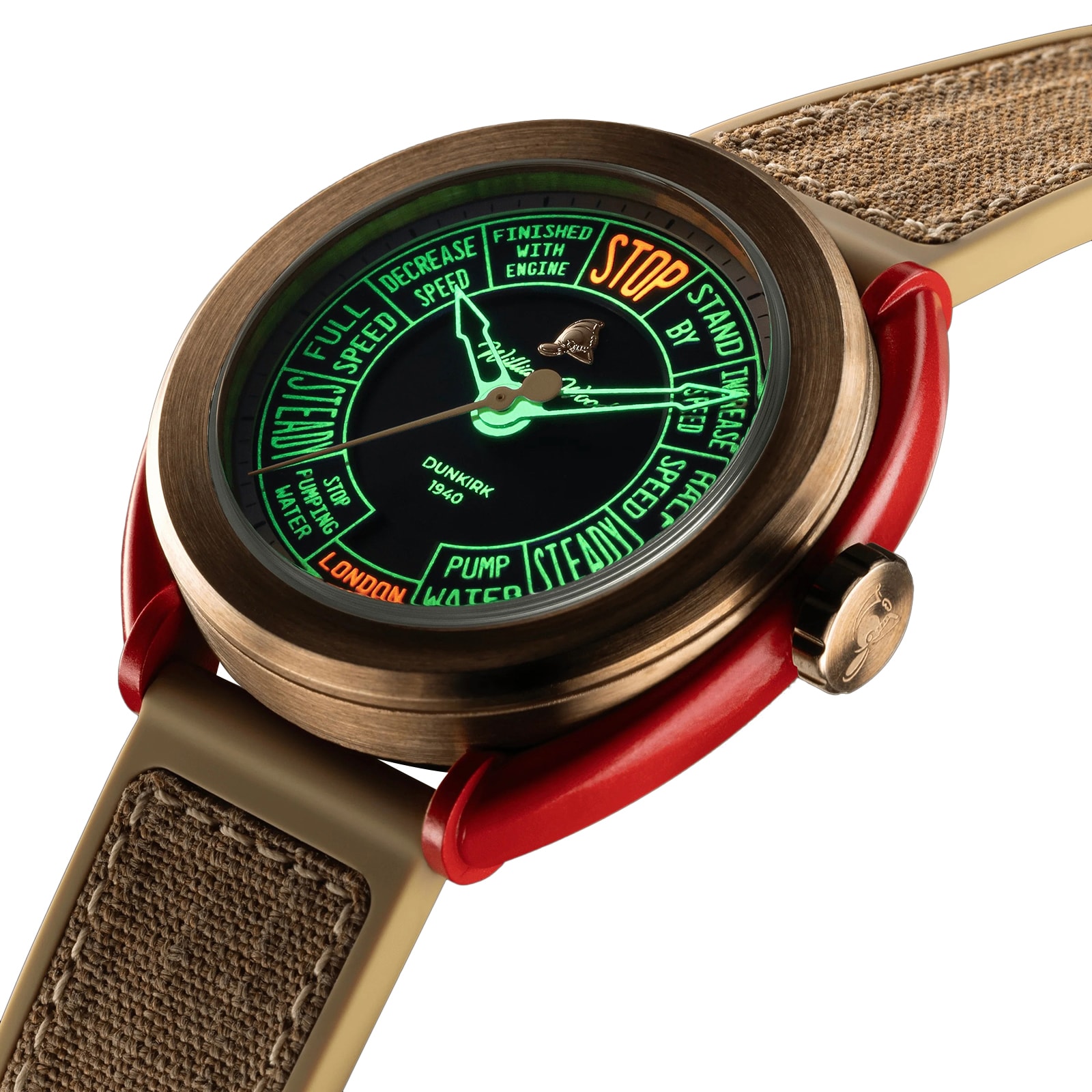 Swiss-Made: Our new Dunkirk Watch is made in La Chaux-de-Fonds Switzerland. Movement Specifications: Swiss-Made Sellita Group SW220 Movement upgraded to the Premium Top Grade with the highest precision accuracy of +/-4 sec/day up to +/- 15 sec/day. The SW220 Premium Top Grade Movement has a 38 hour power reserve, 26 jewels accuracy and 28,800 beats per hour.  Become A Part Of History: Anyone who purchases a Dunkirk watch will have their name engraved onto a plaque on the boat that will sail over the channel in 2025 for the 80th year anniversary of the Dunkirk evacuation Case Measurements: The case measures 42mm in diameter, with a 13mm thickness and a lug width of 20mm. The watch wears as a medium to large size on an average wrist. Lug To Lug: Case Execution: Our case is finished in CuSn8 grade bronze with the sides and lugs executed with a brushed finish. Bronze will age and patina over time changing both colour and texture. The case can be brought back to looking brand new again by applying lemon juice. The side of the case is wrapped with red piping taken inspiration from the engine room of the Massey Shaw Boat. The back of our Dunkirk Watch has a matte black caseback ring featuring an illustration of the famous scene of Operation Dynamo on the beaches of Dunkirk back in 1940. Dial Design: The one-of-a-kind dial in bronze, black, and red was inspired by the unique twin telegraphs of the Massey Shaw, which are used to operate both the fire pumps and the main engines of the ship. The dial uses an aged champagne Super-LumiNova to look like a watch from the 1940's. Both STOP and LONDON illuminate on the dial in red to match the Massey telegraphs. Caseback Design: We Will Remember. A beautiful commemorative caseback features a scene of Dunkirk engraved on three-tone bronze, including soldiers waiting on the beach and the Little Boats. An original piece of the Massey Shaw engine used in the Dunkirk evacuation has been melted-down and poured into the silhouette of the Massey Shaw on the horizon of the caseback Operation Dynamo scene. Strap Measurements: Our fire gear and fire hose straps fit a wrist size between 5.5 and 9.5 inches. We do not currently offer straps for lug sizes outside of 20mm. Strap Execution: Our full range of watch straps have a 20mm lug width fitting all of our watch collections. Our upcycled fire gear and fire hose straps are finished with a silicon back that is stamped with ‘made from rescued materials’ and ‘William Wood’. All of our straps are fitted with quick-release levers allowing you to add and remove any of our straps without any additional tools required in just a few seconds. Water Resistance: For additional reduction in case thickness to 13mm we chose a water resistance of 50M / 5ATM International Warranty: Global Support: We have three repair centres based in the UK, USA and Asia, giving you international support if, and when required.