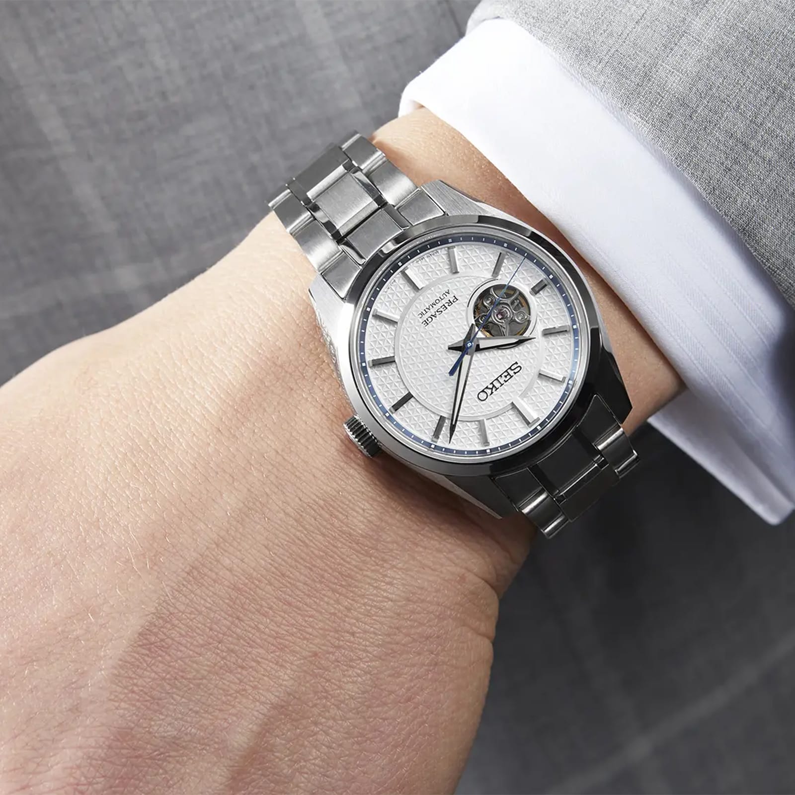 This ‘Midday’ white dial watch is from the Seiko Presage Sharp Edged collection, inspired by ancient and modern Japanese design. It features a new case design with mirror finishing on both lug sides along with a striking new two-layered dial. This timepiece is powered by the new “open heart” 6R38 movement, the first semi-transparent structured 6R calibre with 70 hours of power reserve. The dials on Presage Sharp Edged timepieces feature a traditional Japanese pattern designed to bring growth and success. This angular ancient hemp print has been seen in Japanese artisan objects since the Heian period (794-1185) and features on textiles and interior styles. Seiko Presage: Timeless looks, precise mechanical timekeeping. Minimalistic watch designs with a distinctly Japanese aesthetic.